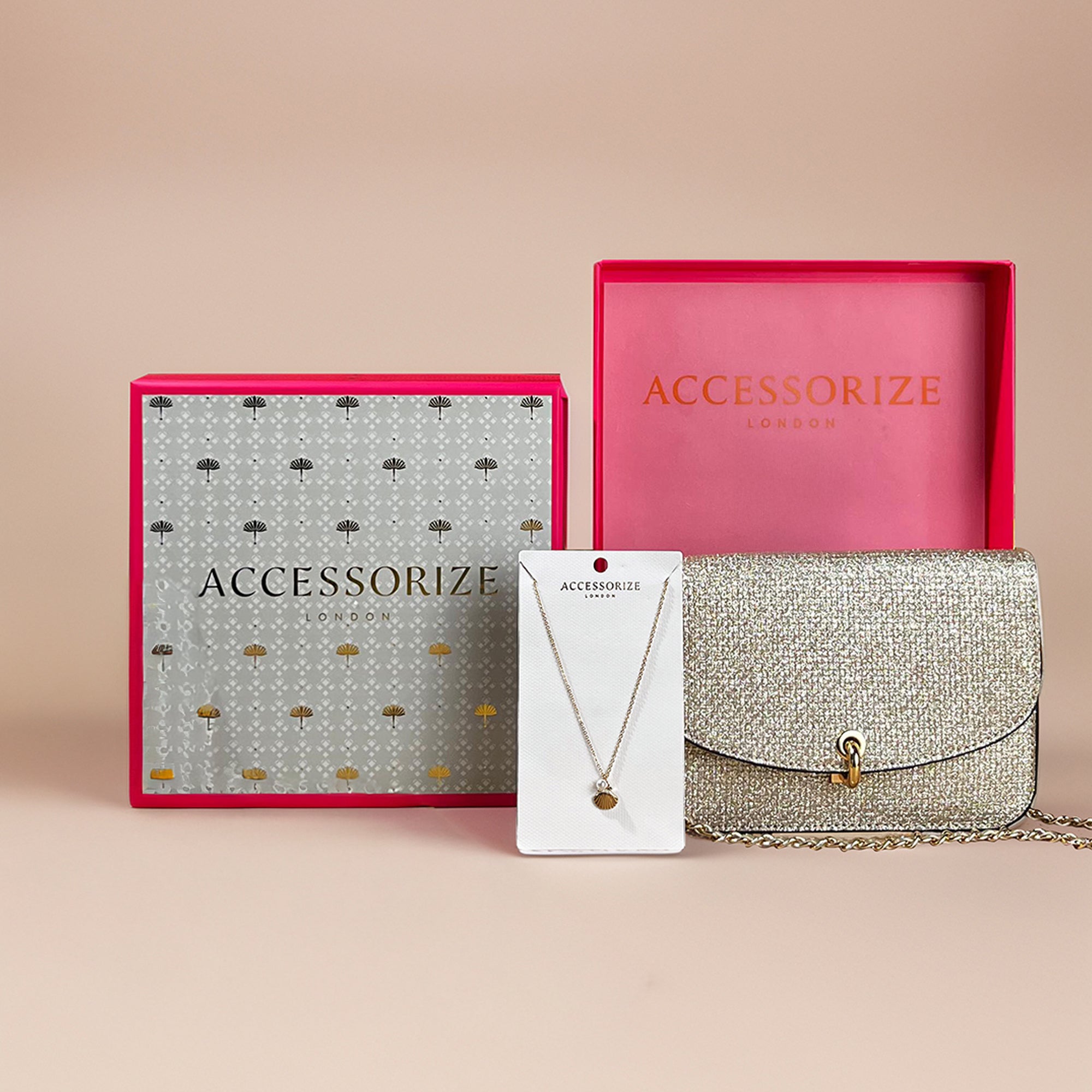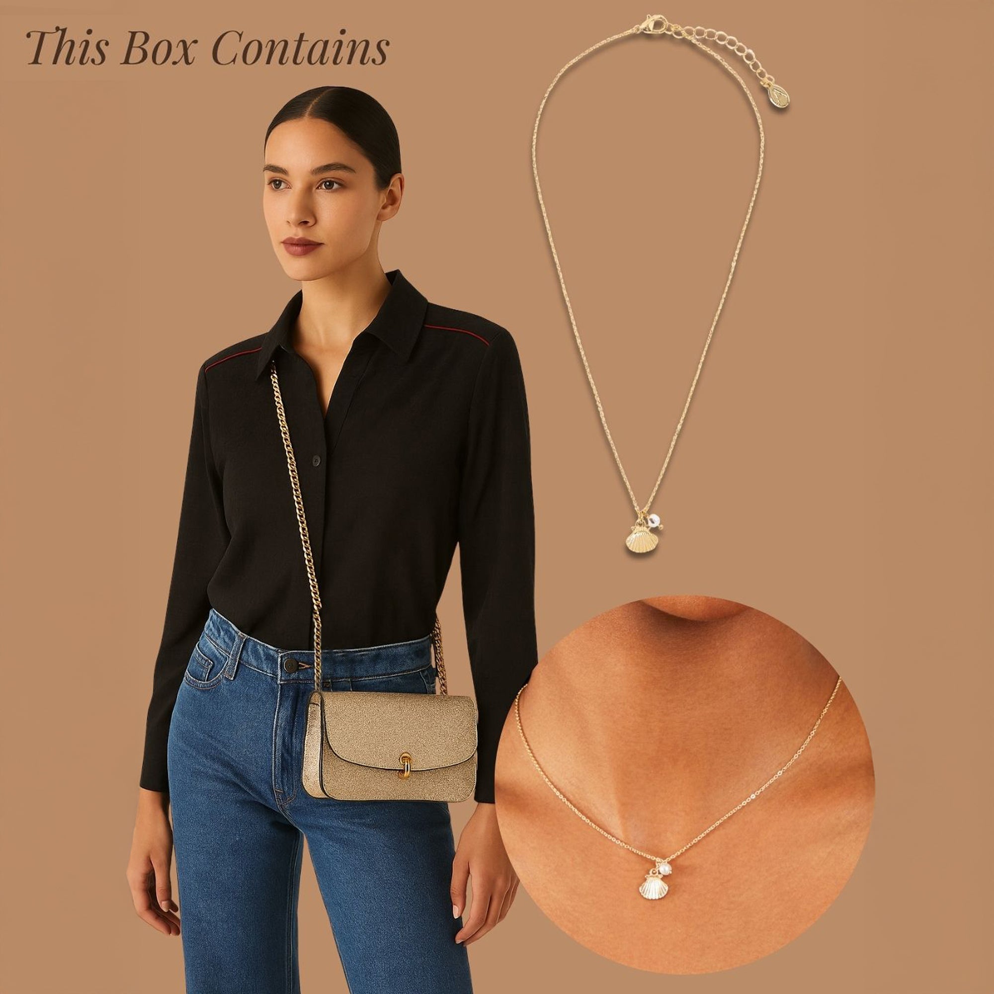 Surprise her with this stunning Accessorize London Women combo set, featuring a sleek and stylish gold sling bag with delicate metal chain detailing gold shell necklace. Specially curated as a Diwali gift hamper box, this combo blends chic style with everyday versatility, perfect for festive gifting. The compact Sling Bag with metal chain detailing adds a polished touch, while the playful earrings offer styling options for every mood. This gift hamper box makes a memorable and fashionable choice for your sister or loved ones.