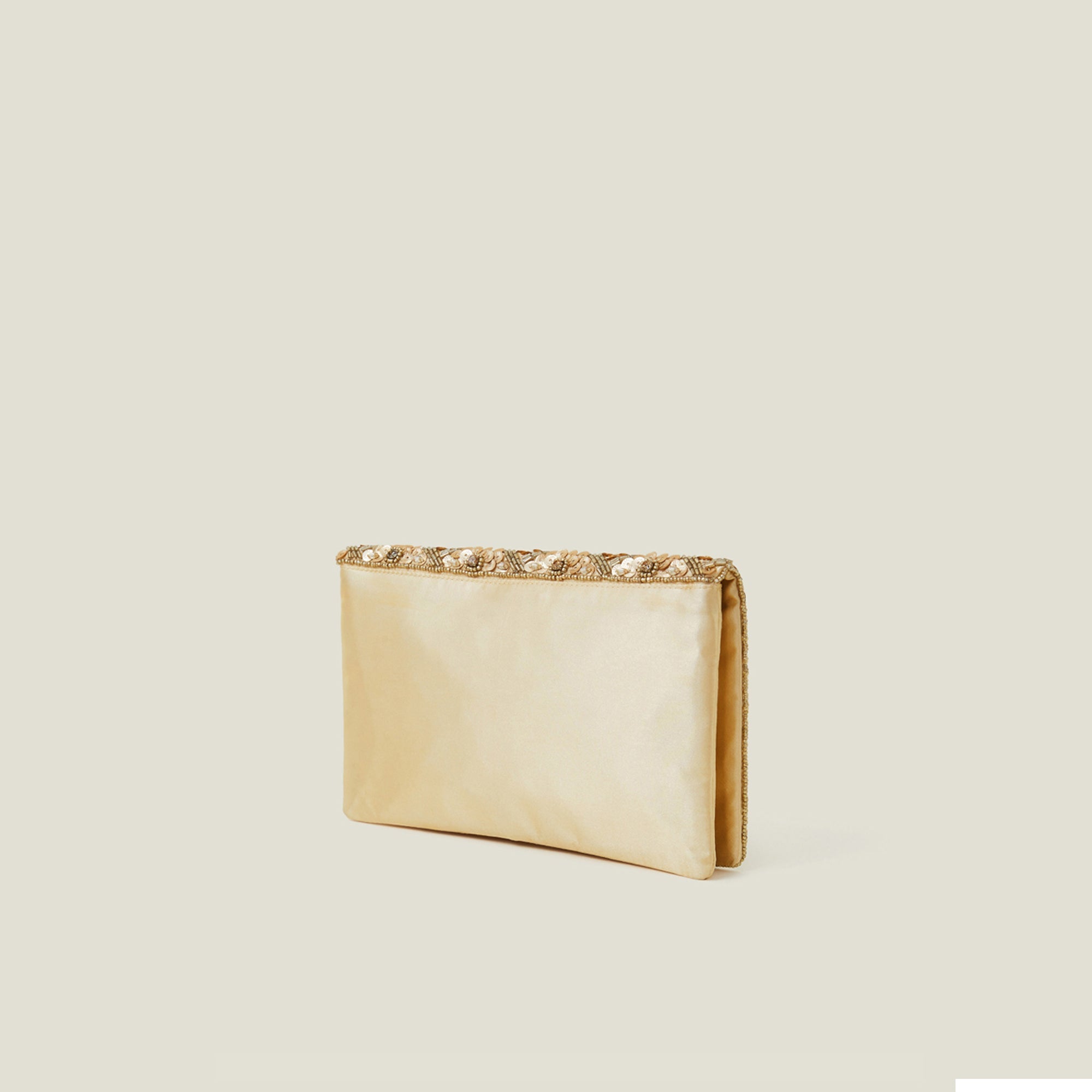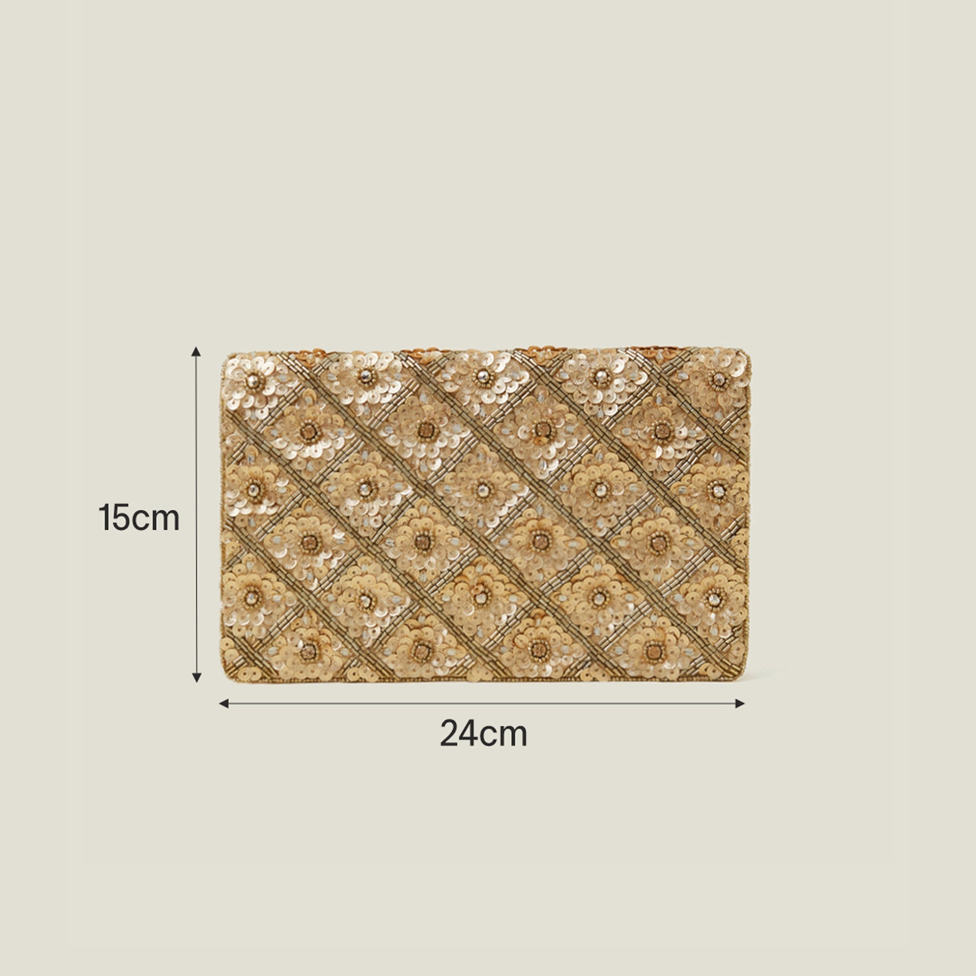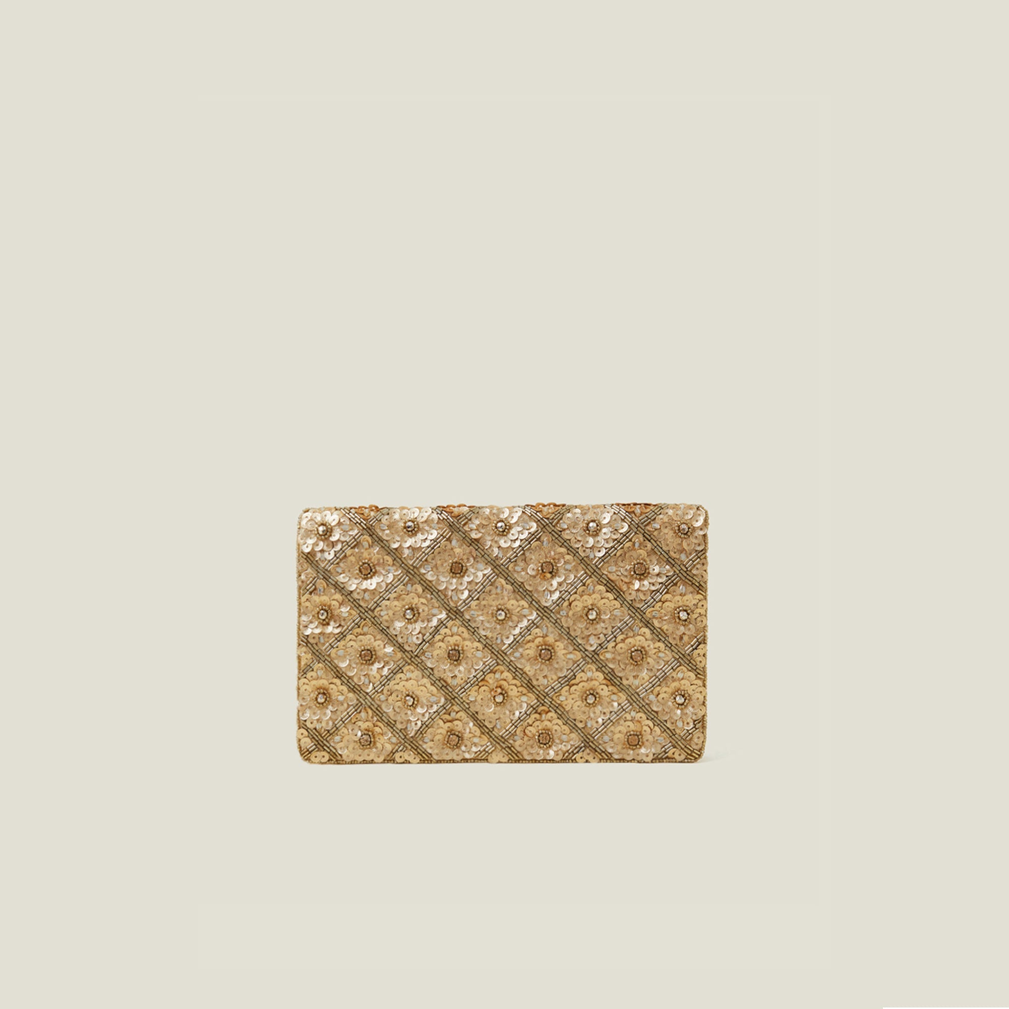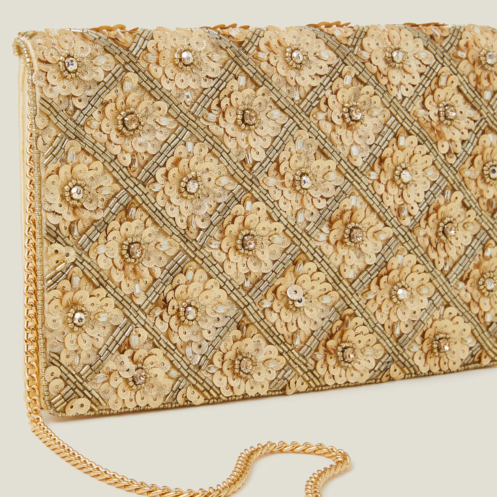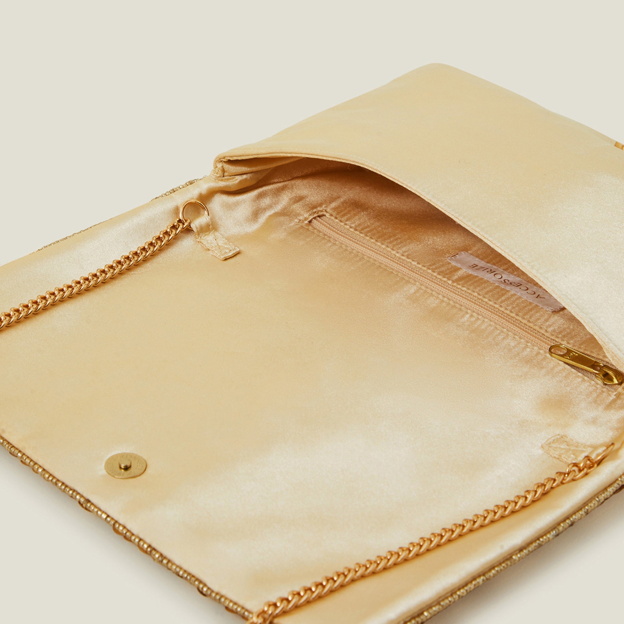 Worthy of those extra-special occasions, this clutch is hand-embellished with beads in an ornate design. It fastens with a magnetic press-stud and has an internal zip pocket for your coins, cards and notes. Just tuck in the chain strap for a clutch option or slip it over the shoulder for hands-free table grazing. Gold
