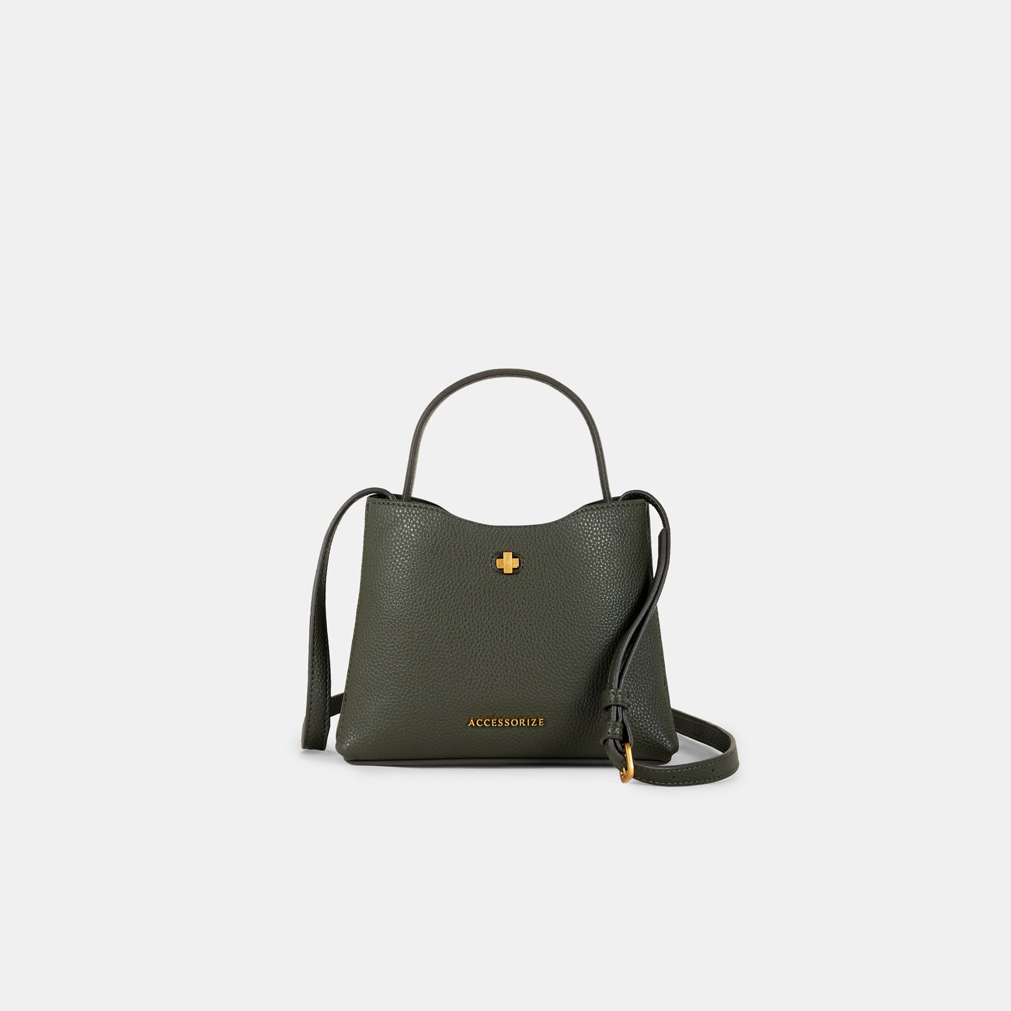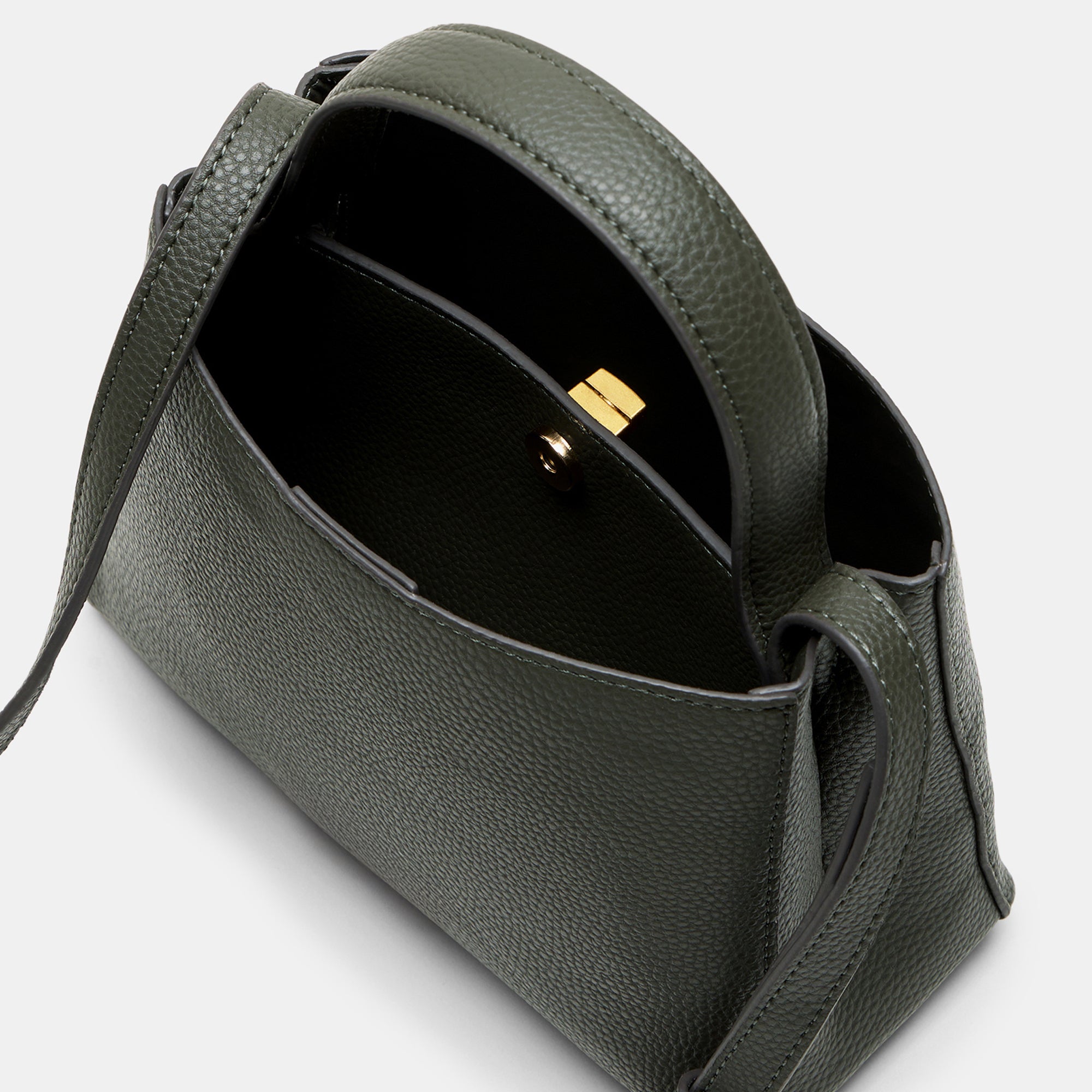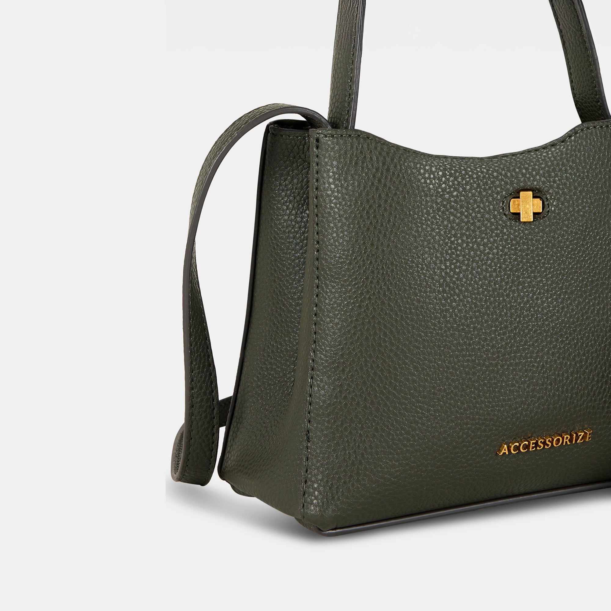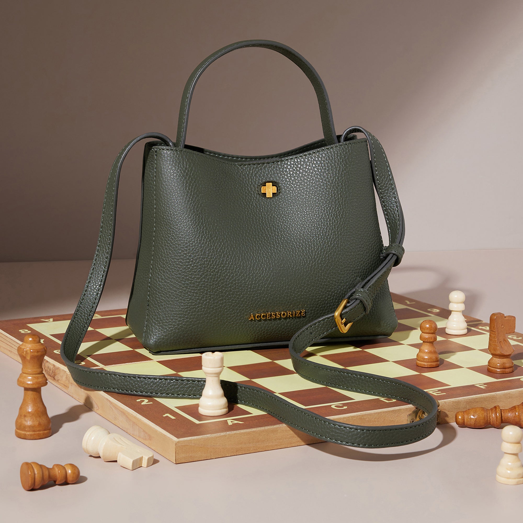 A sophisticated sling bag in dark green with a gold-tone twist lock, structured silhouette, and versatile carrying options. Designed for the modern woman who values elegance and practicality in equal measure.