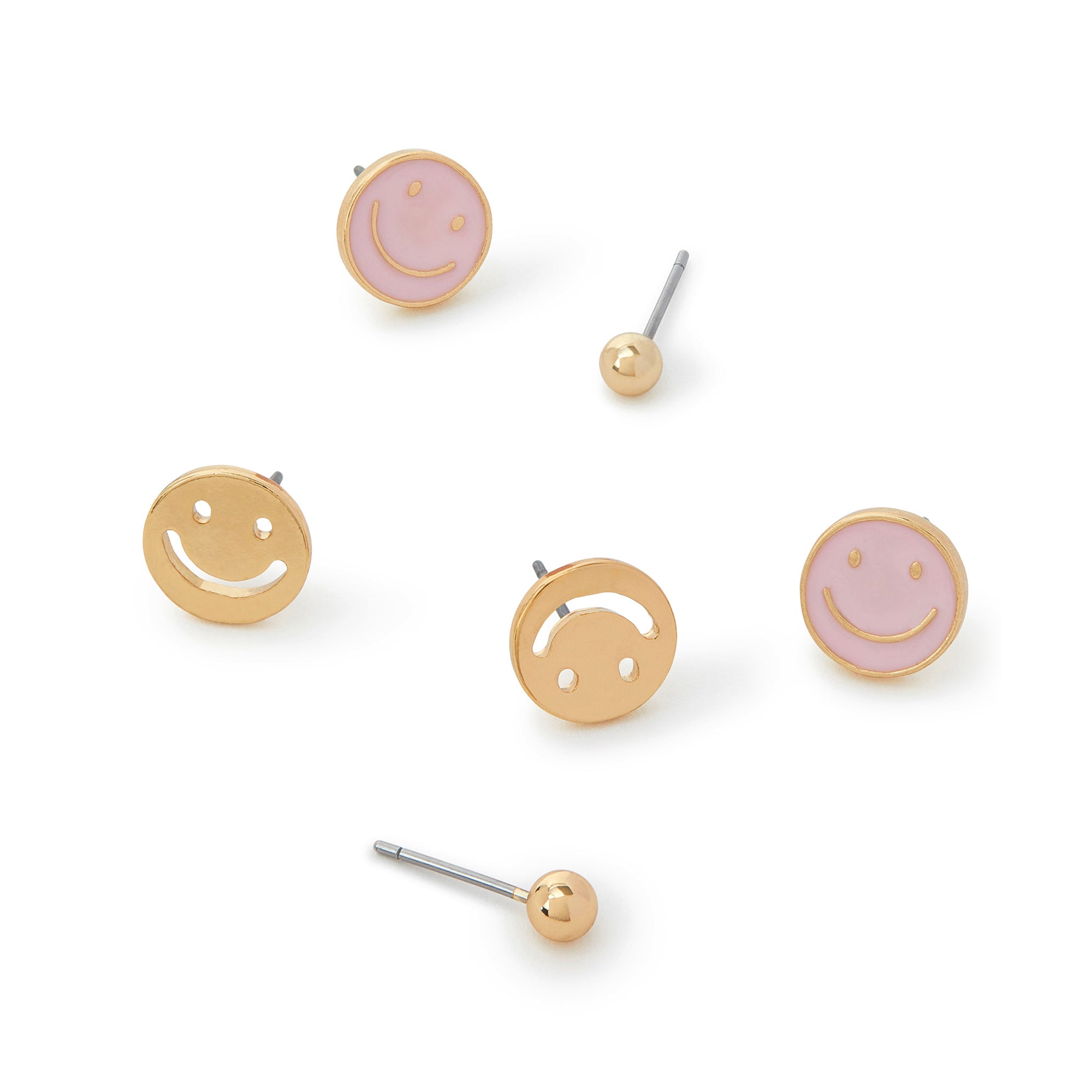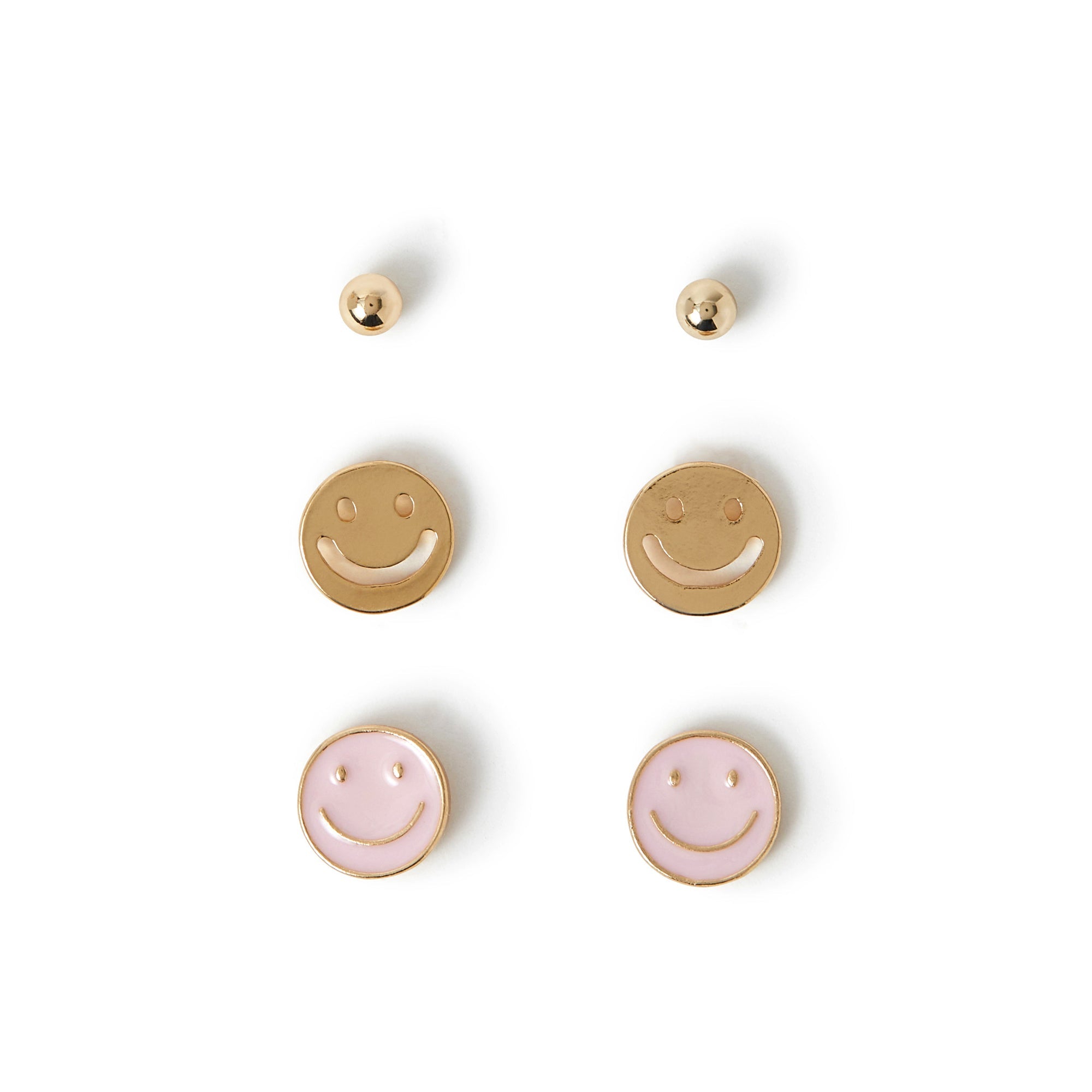 Start every day off with a smile! Showcasing smiley faces and simple ball designs, these studs are a fun addition to your ear-stack. Three pairs included.