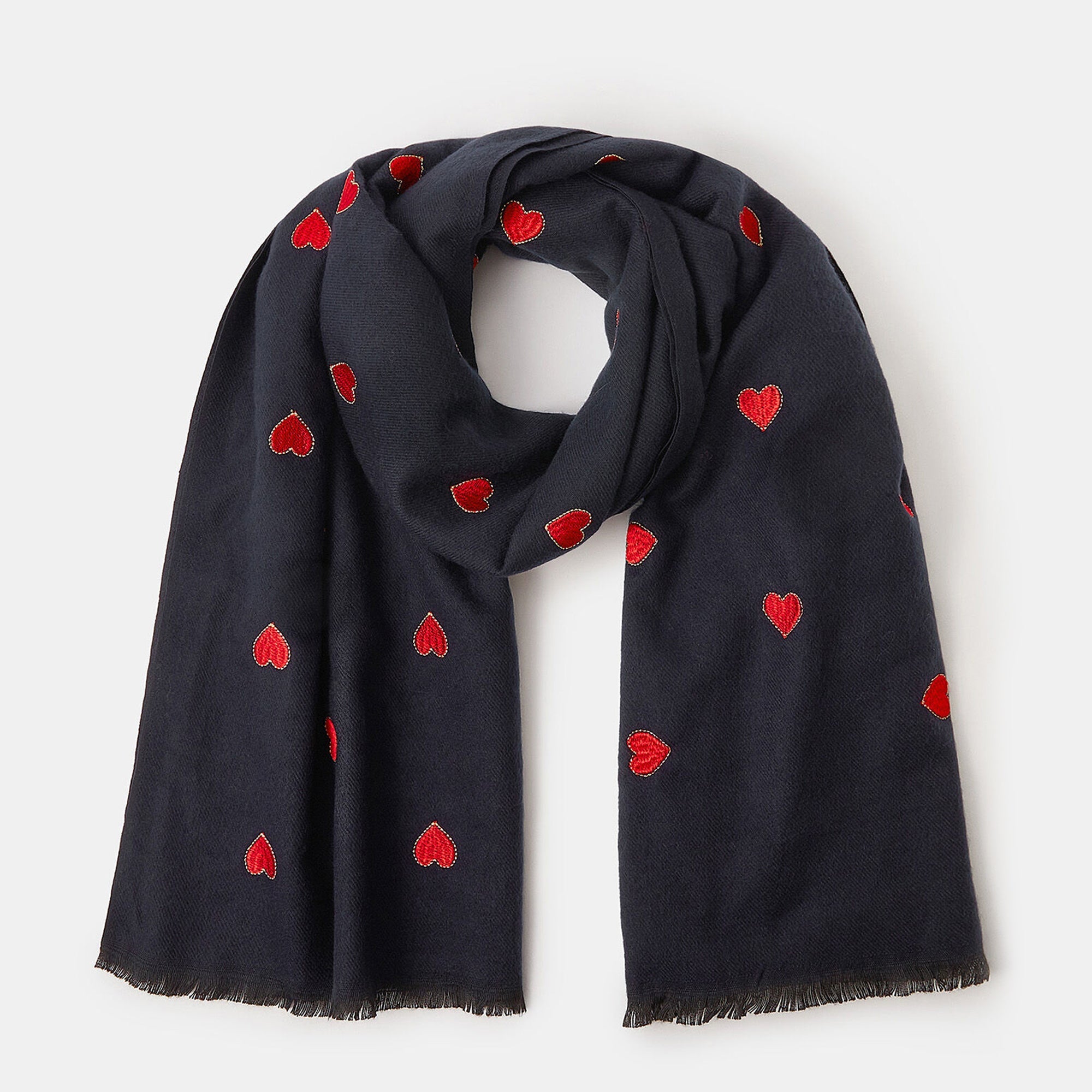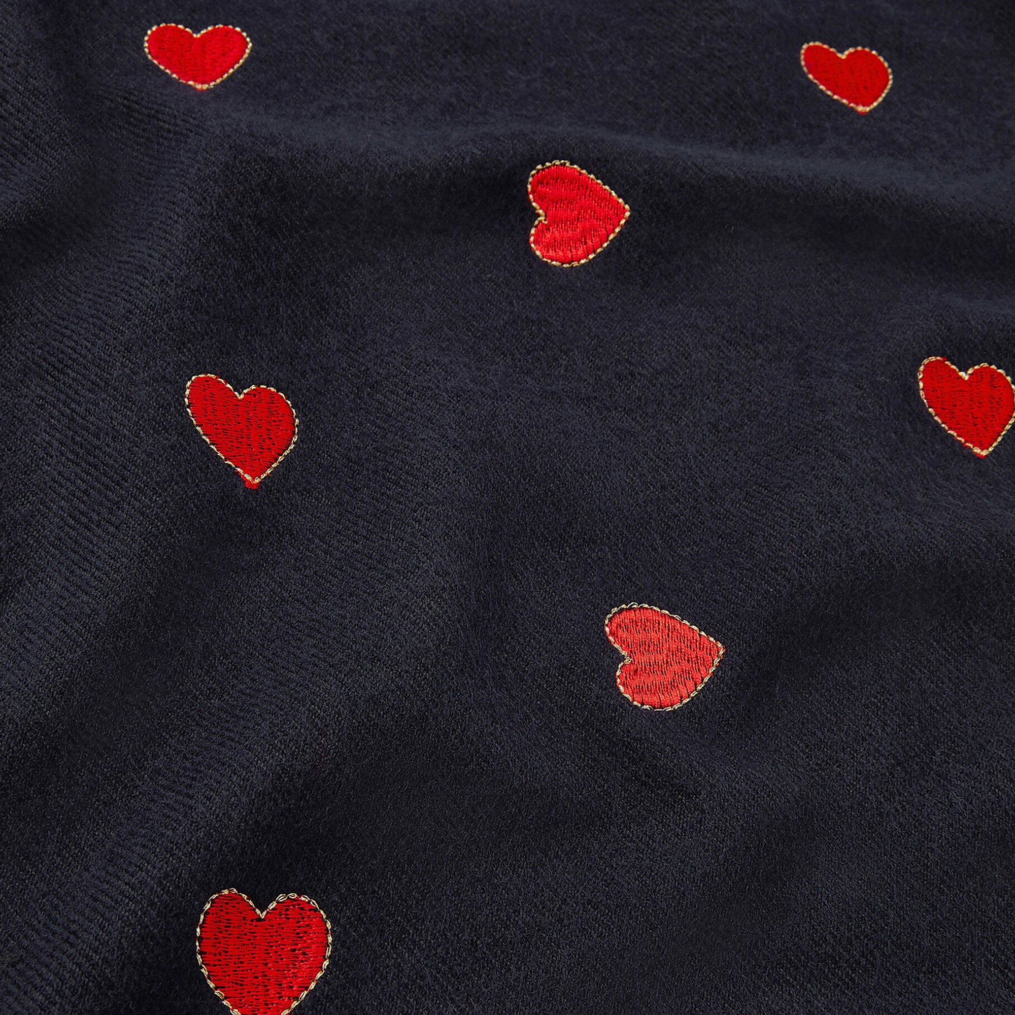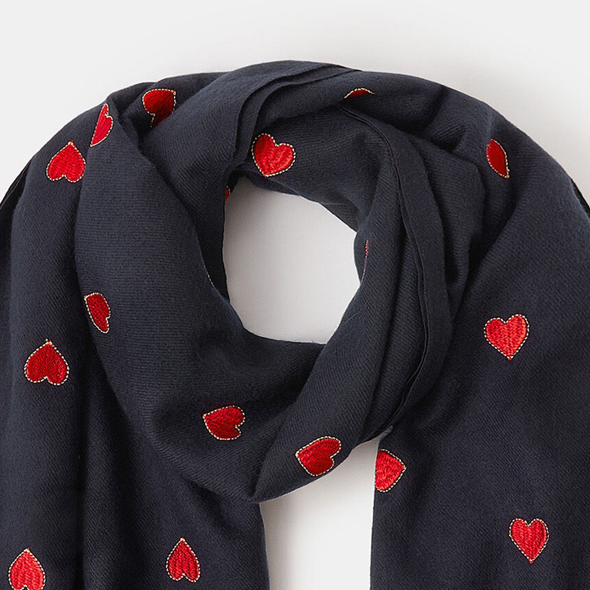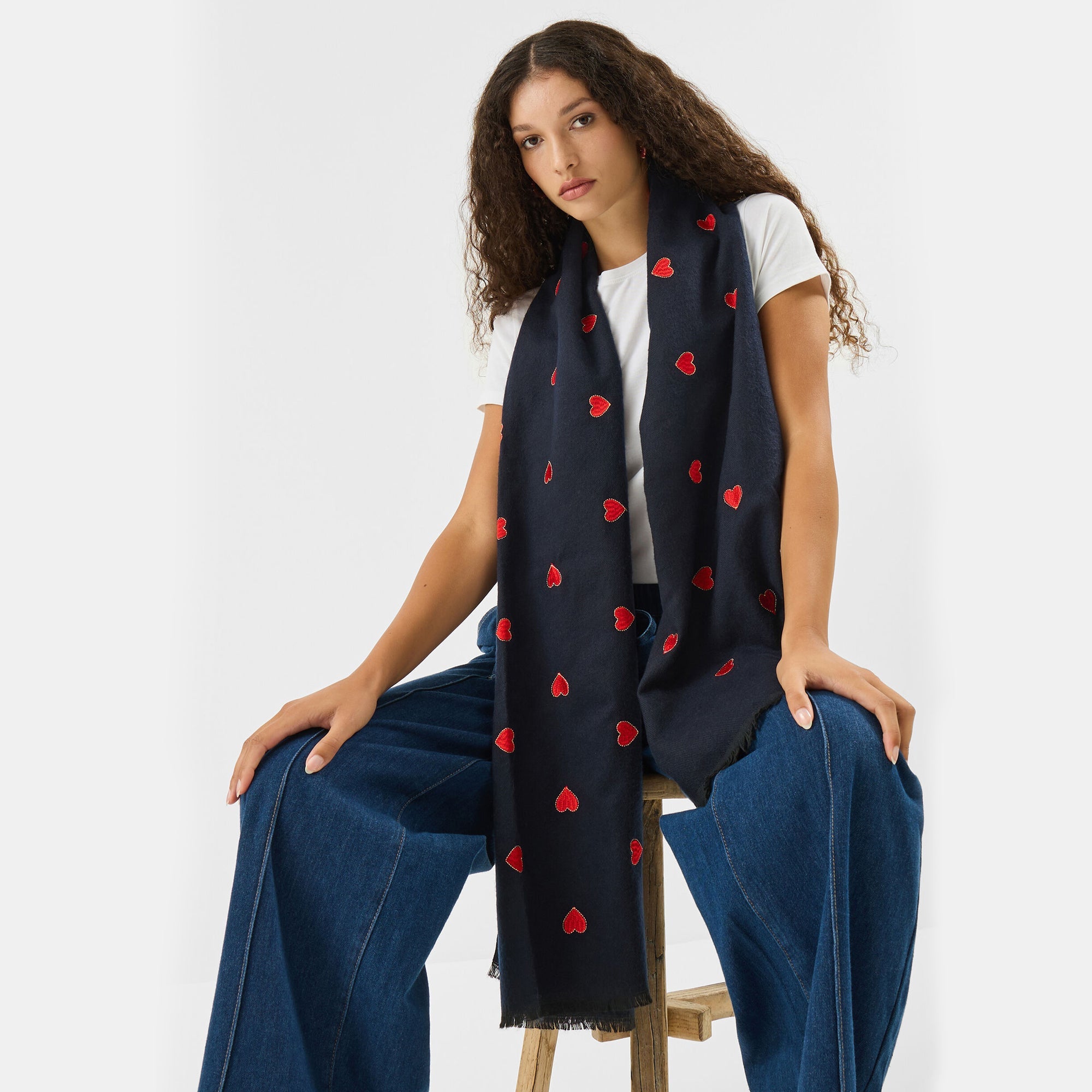 Wrap yourself in love with this blanket scarf. Spun in a smooth blend, it's embroidered with red love hearts. Blue