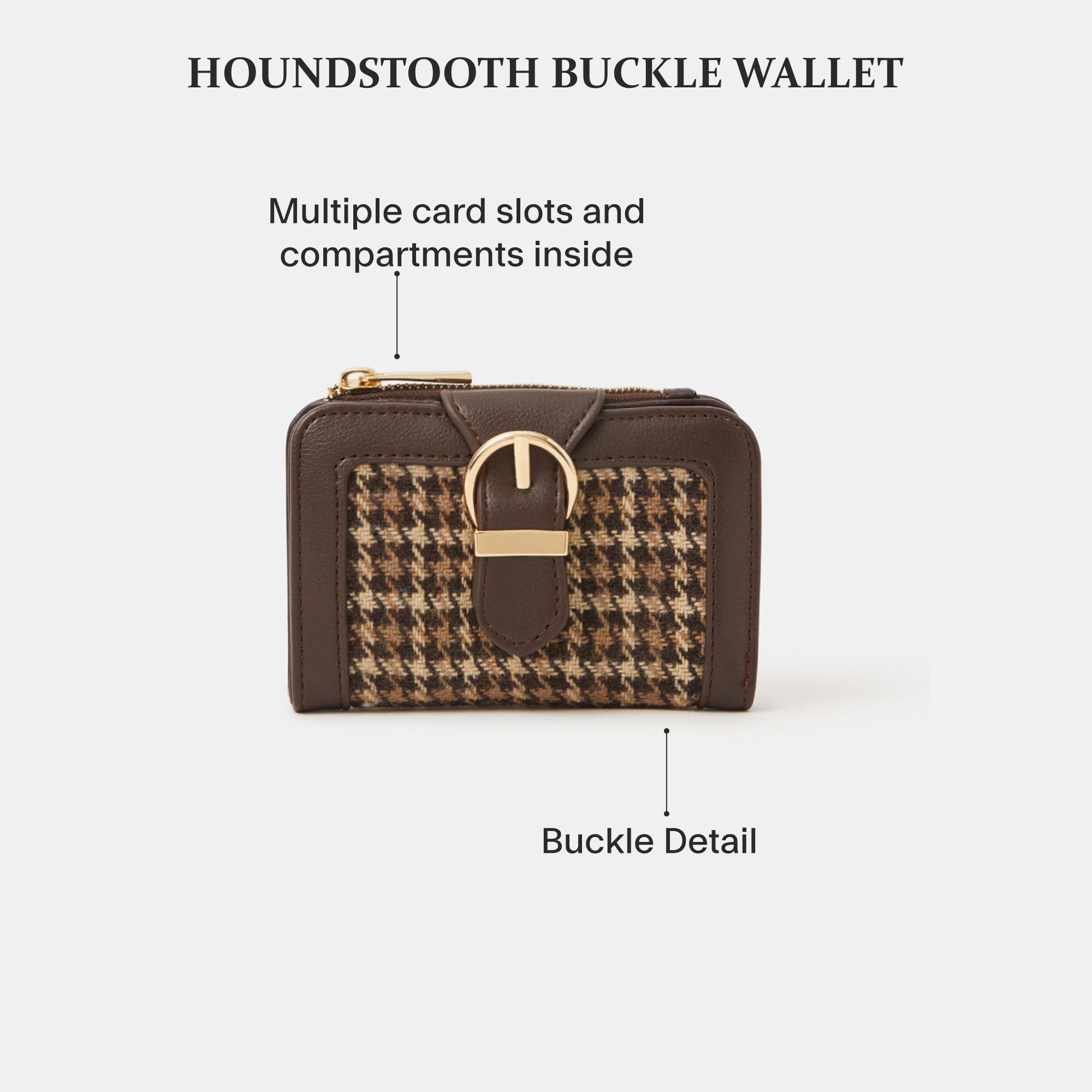 Add a touch of timeless charm to your everyday essentials with the Houndstooth Buckle Purse. Designed in neutral tones with a houndstooth pattern and faux leather finish, this purse is compact yet practical. The fold-out profile offers six card slots for your must-haves, while the secure zip compartment keeps coins and small valuables safe. Finished with a chic buckle detail, it’s the perfect blend of classic style and modern functionality.
