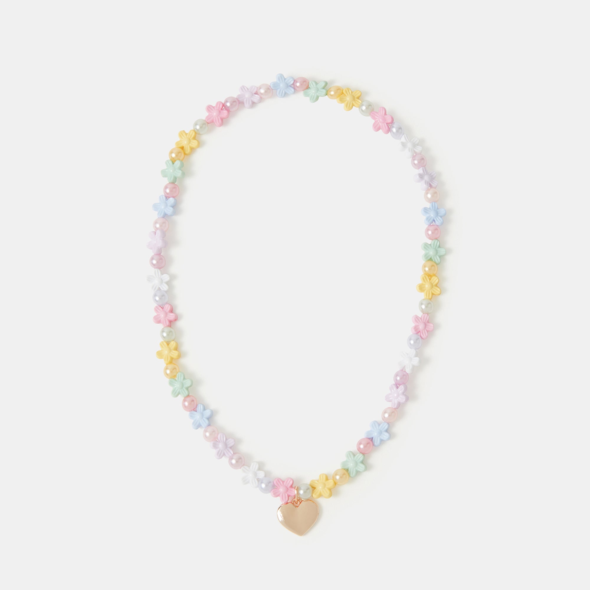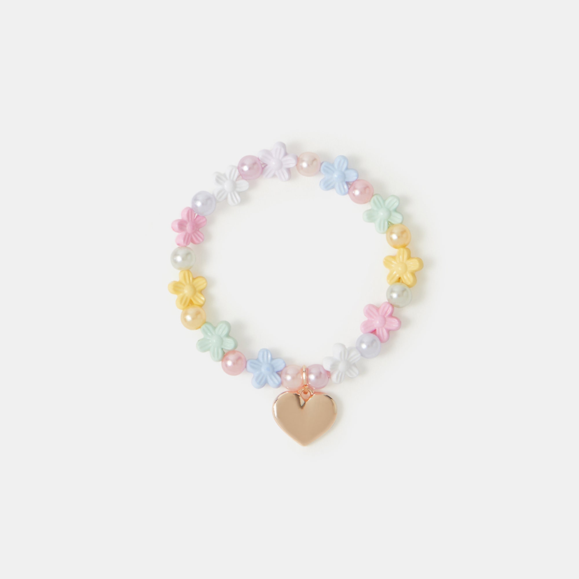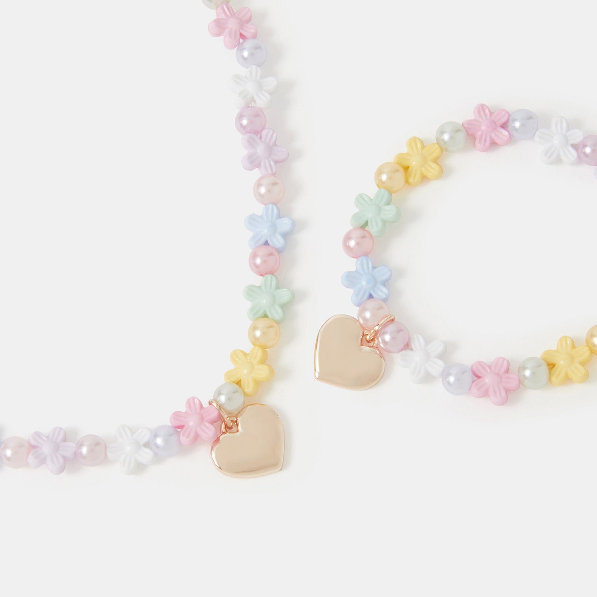 Beauty in bloom. This jewellery set includes a matching necklace and bracelet, both strung with pretty pastel beads and gold heart charms. Pairs perfectly with their favourite summer dress!