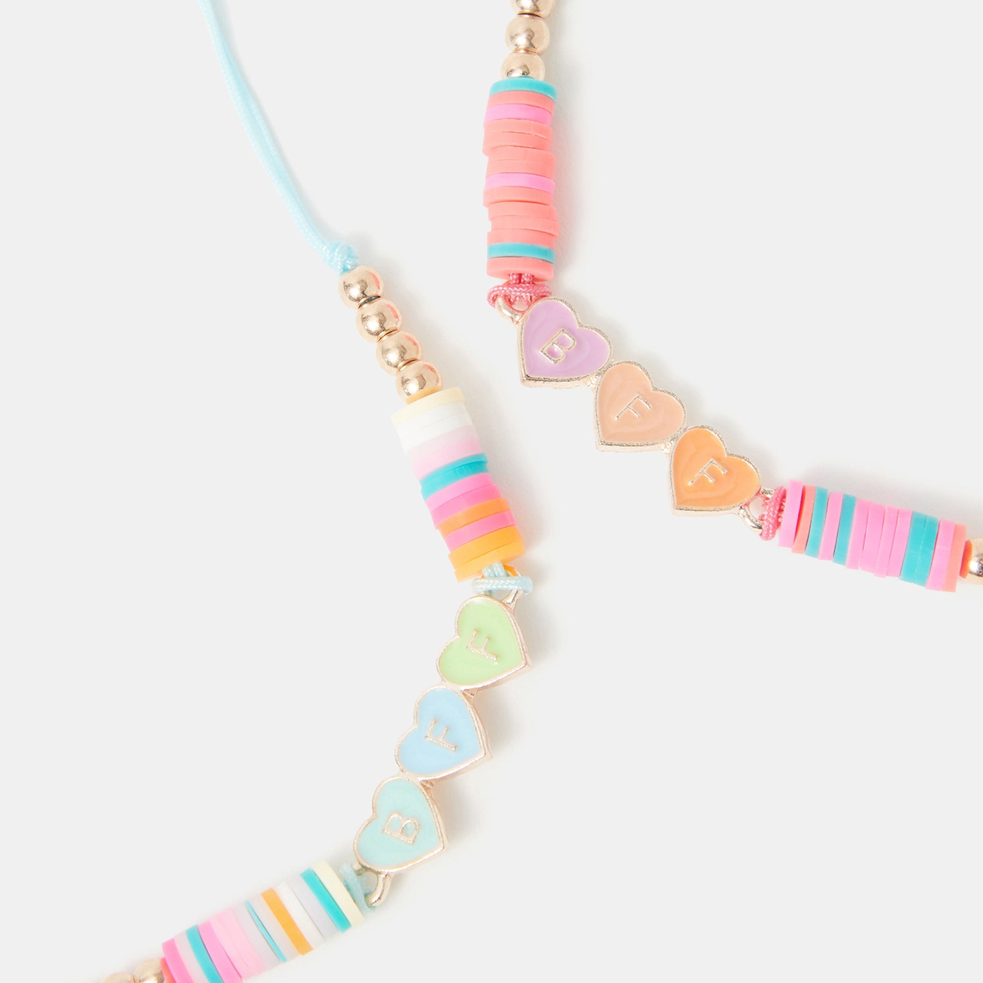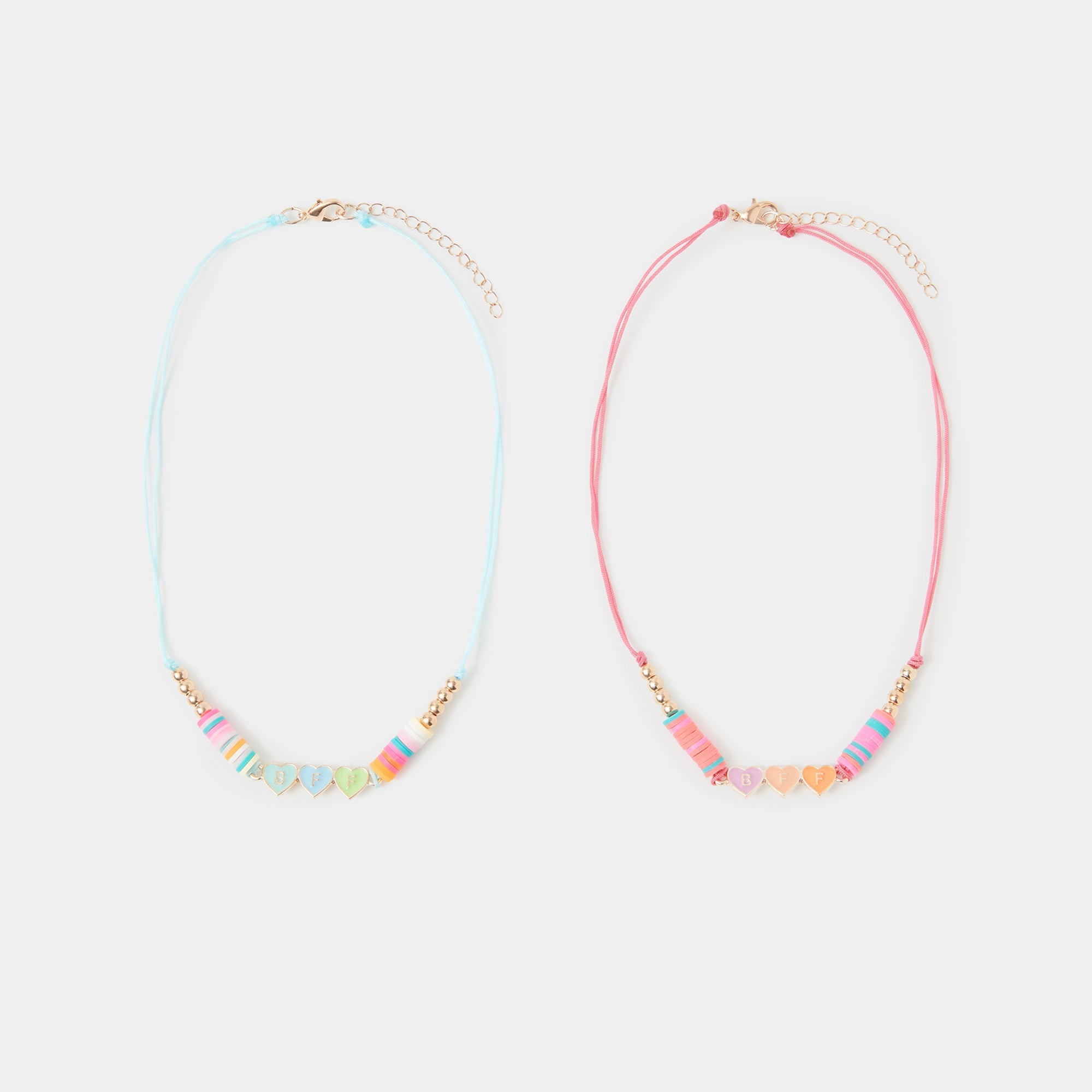 One for them, one for their bestie! Made with blue and pink cord, these friendship necklaces are strung with colourful disc beads and BFF enamel love hearts. Finished with a lobster clasp fastening and extender. Two included.