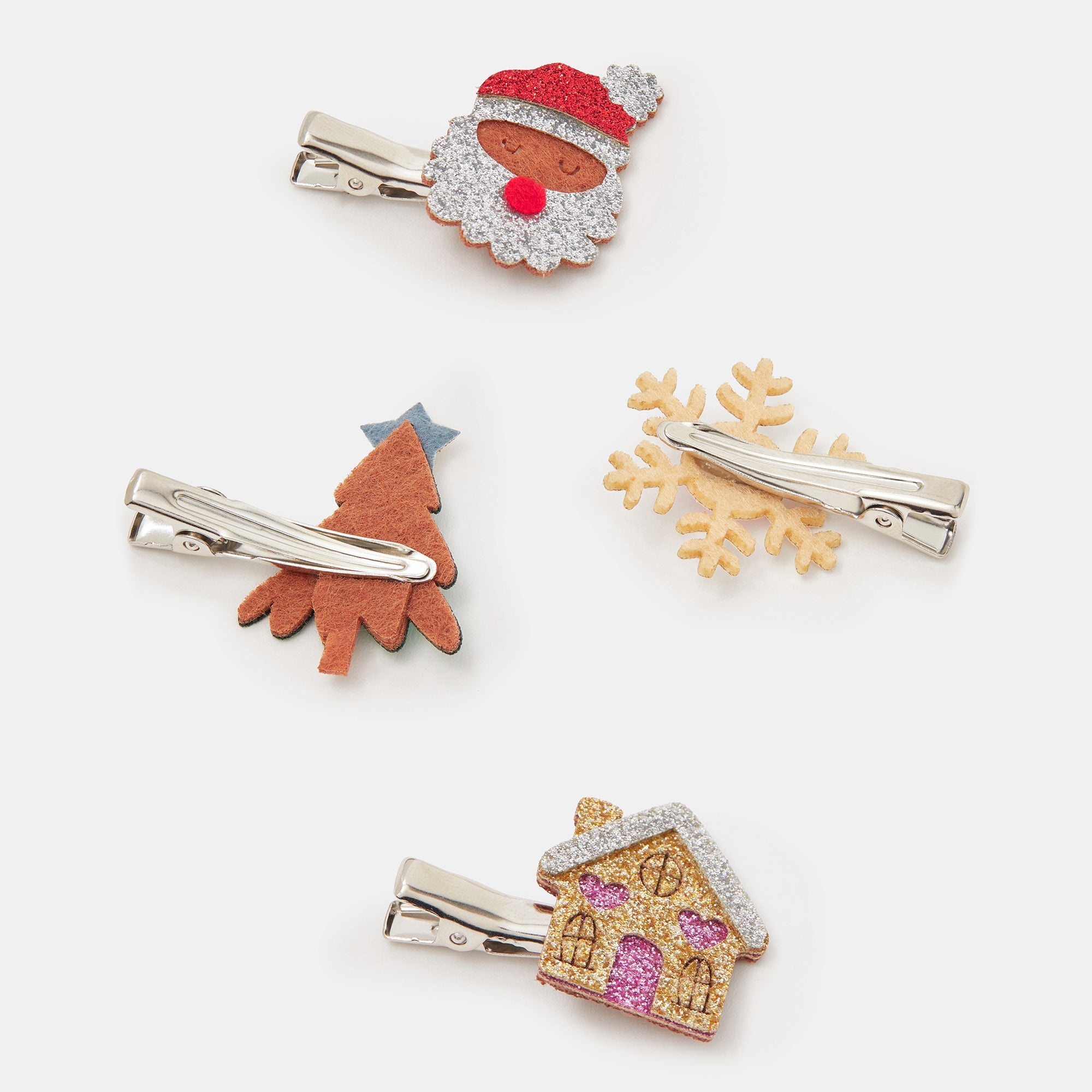 Destination: Santa’s Grotto. Designed with silver-tone fastenings, these hair clips feature festive decorations in a glittery finish. Four included.