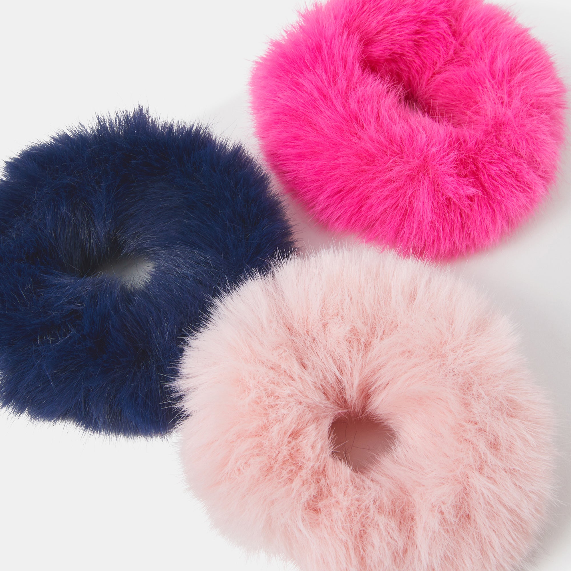A touch of 90s for the new generation, these hair scrunchies are made from super fluffy faux with in hot pink, navy blue and blush. Three included.