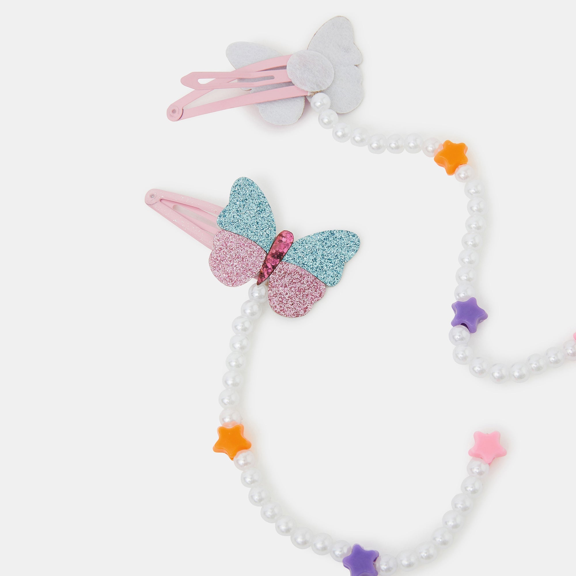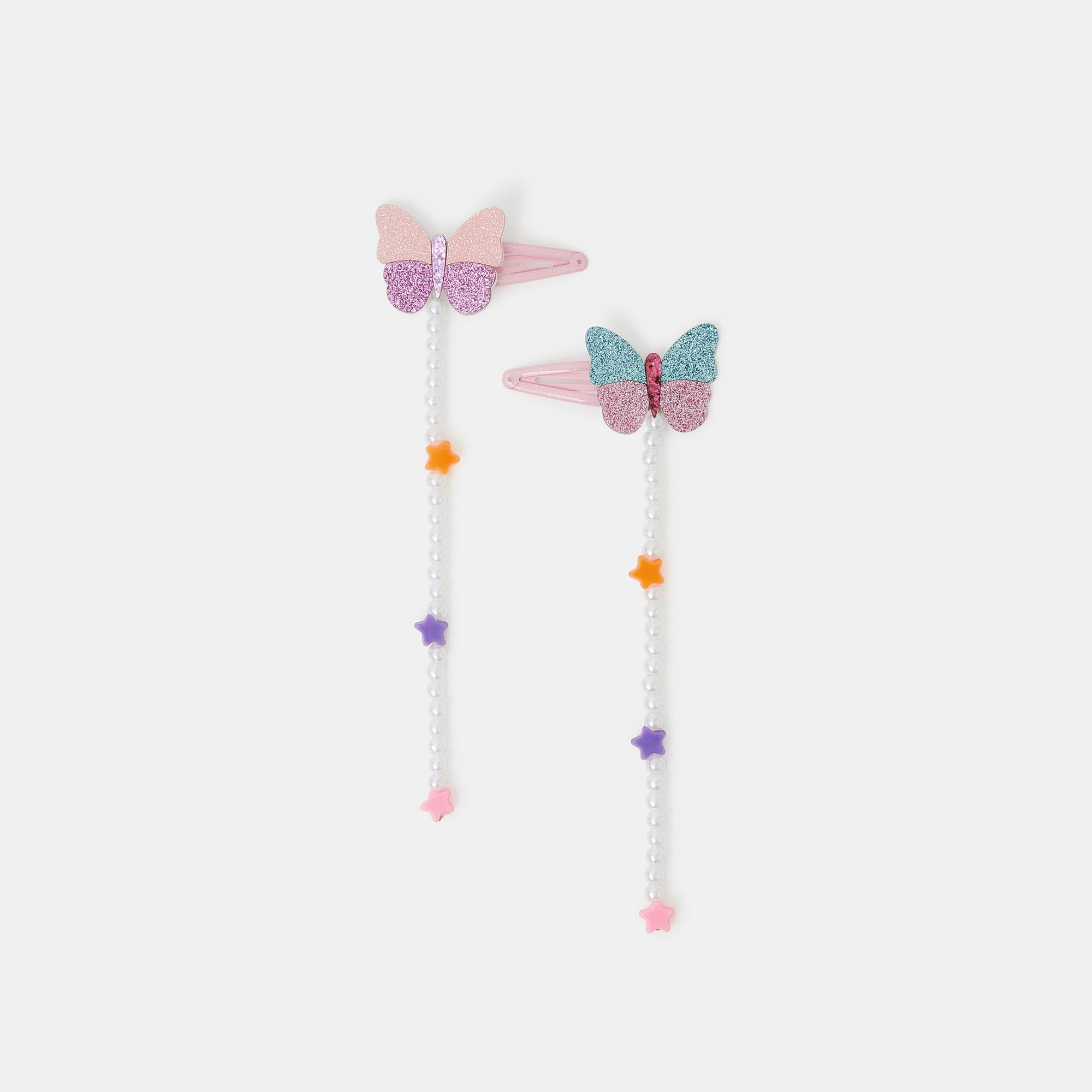 Dress up time! Built with sparkly butterflies and dangly pearl tassels, these hair clips are giving princess perfection. Two included.