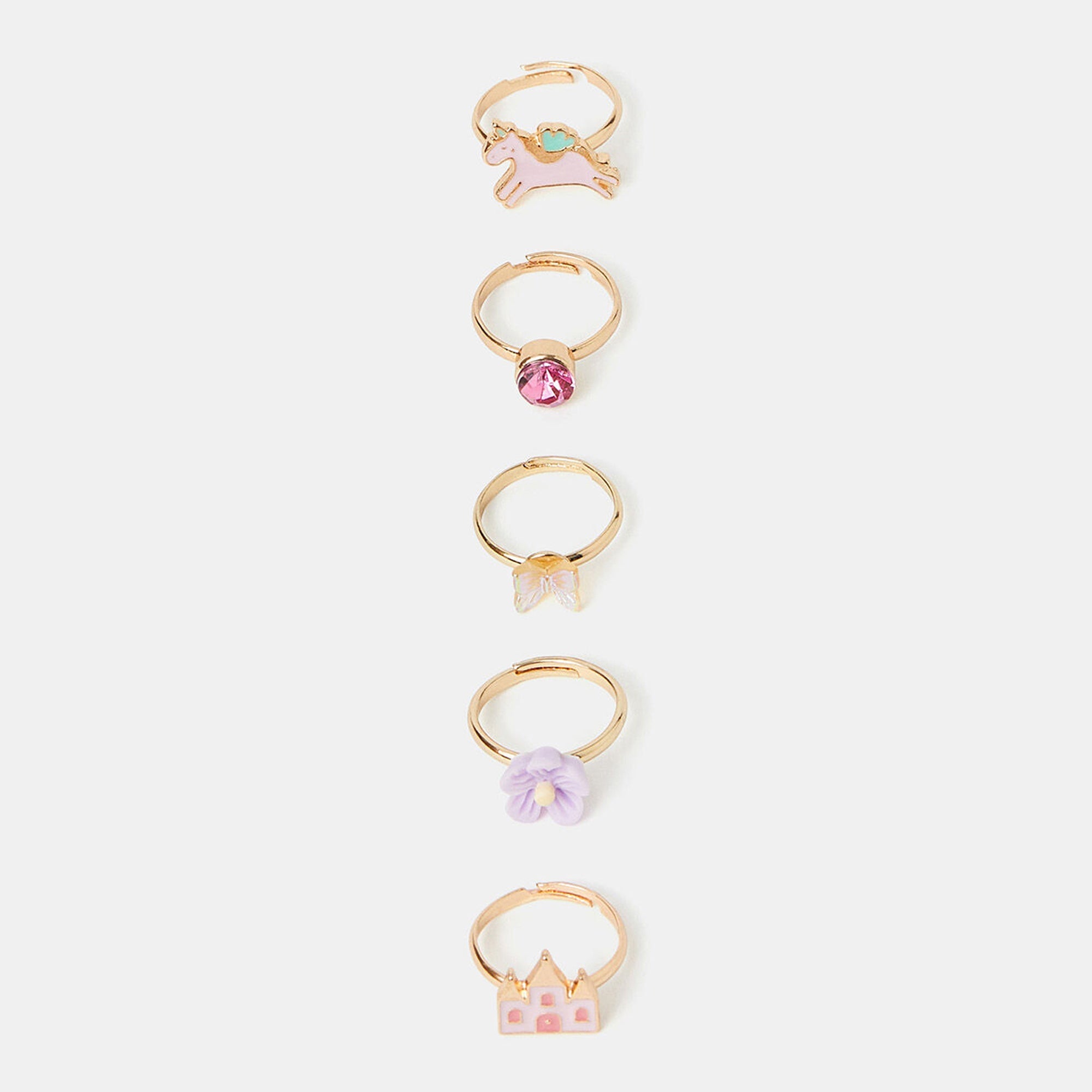With these, they'll look and feel like a princess. This set of rings includes a mix of fairy tale-inspired designs sitting atop adjustable gold-tone bands. Five included.