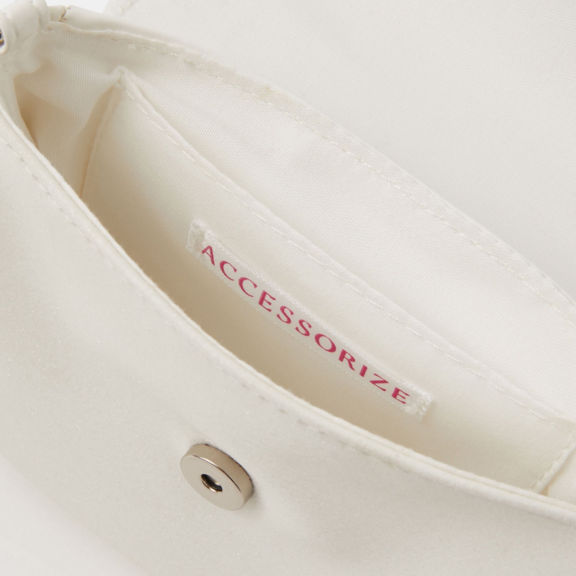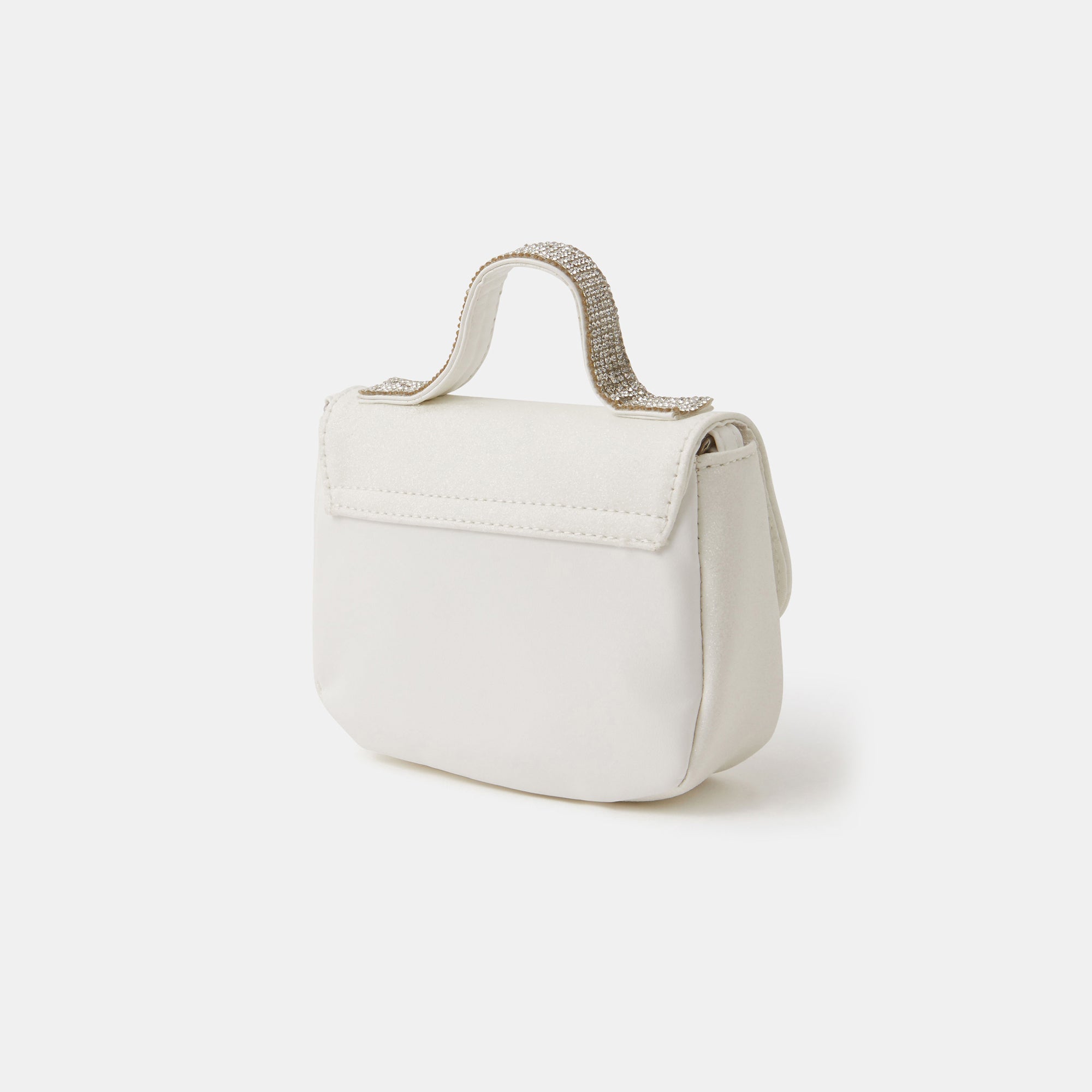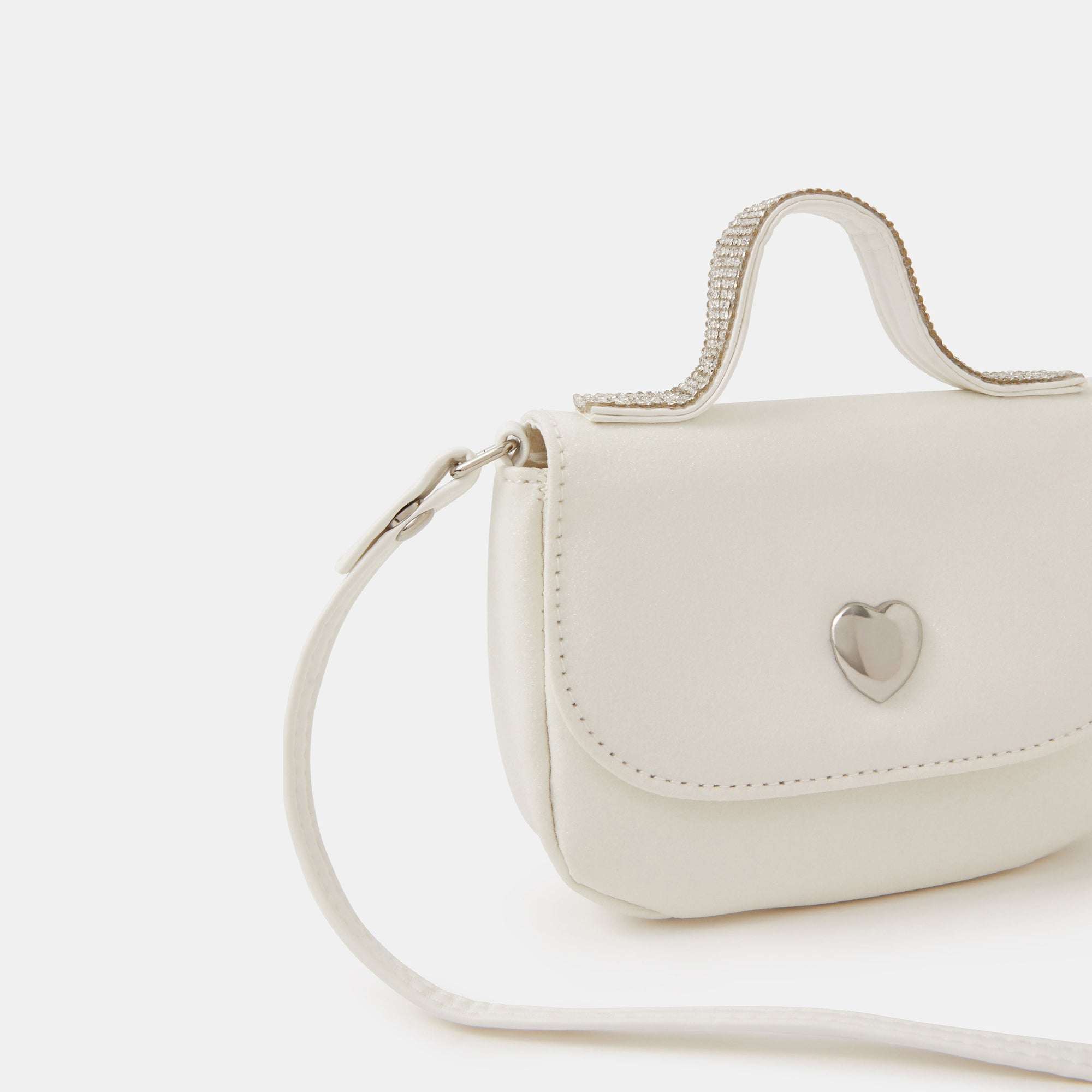 A sparkly pick for them to carry round at school discos and birthday parties. This bag is designed with a fold-over profile, magnetic button fastening, diamante top handle and crossbody strap. Open to see a small slip pocket and main compartment for pocket money and small essentials.