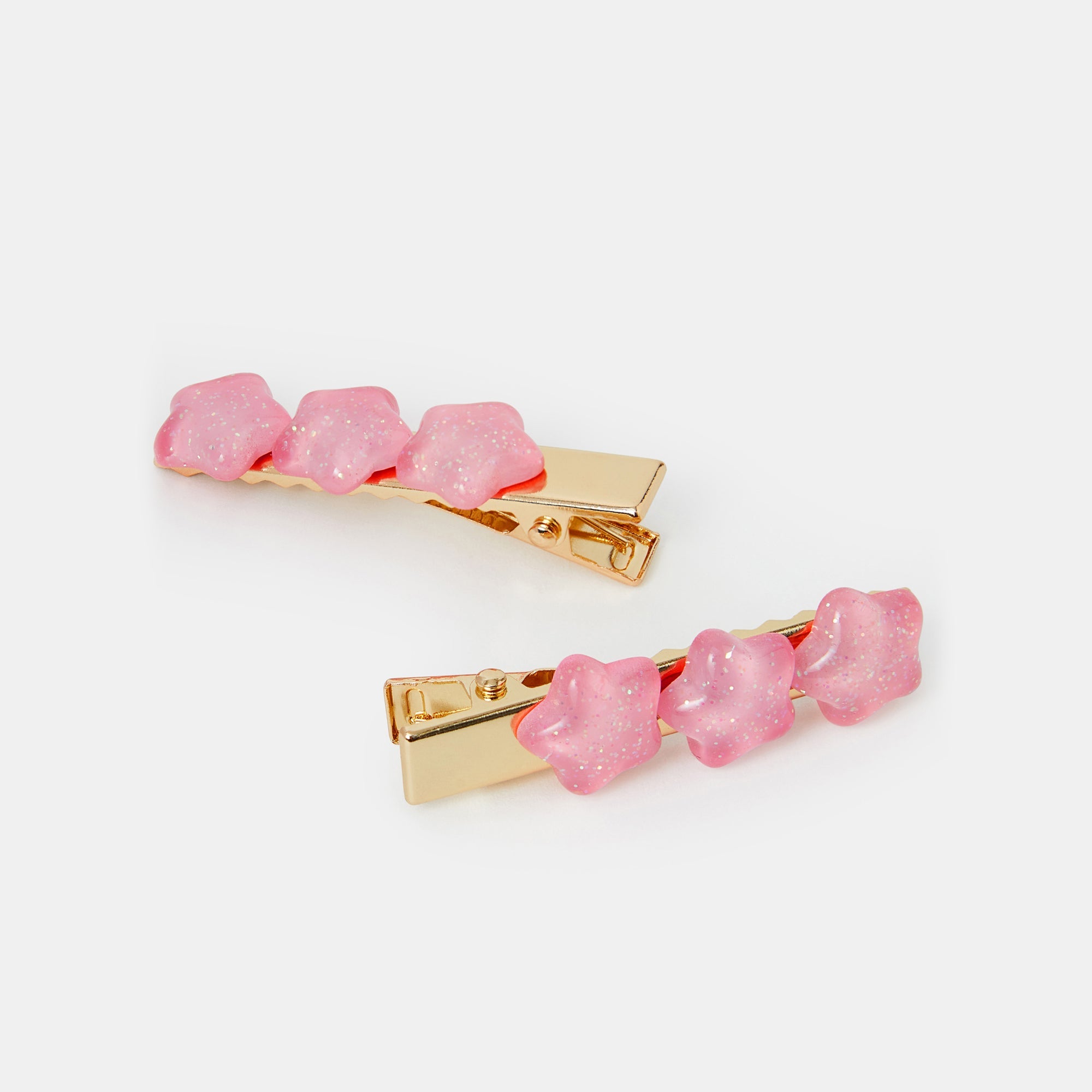 Dress them like the star that they are! Designed with gold-tone slide fastenings, these hair clips are decorated with a trio of pink puffy stars with a glittery finish. Three included.