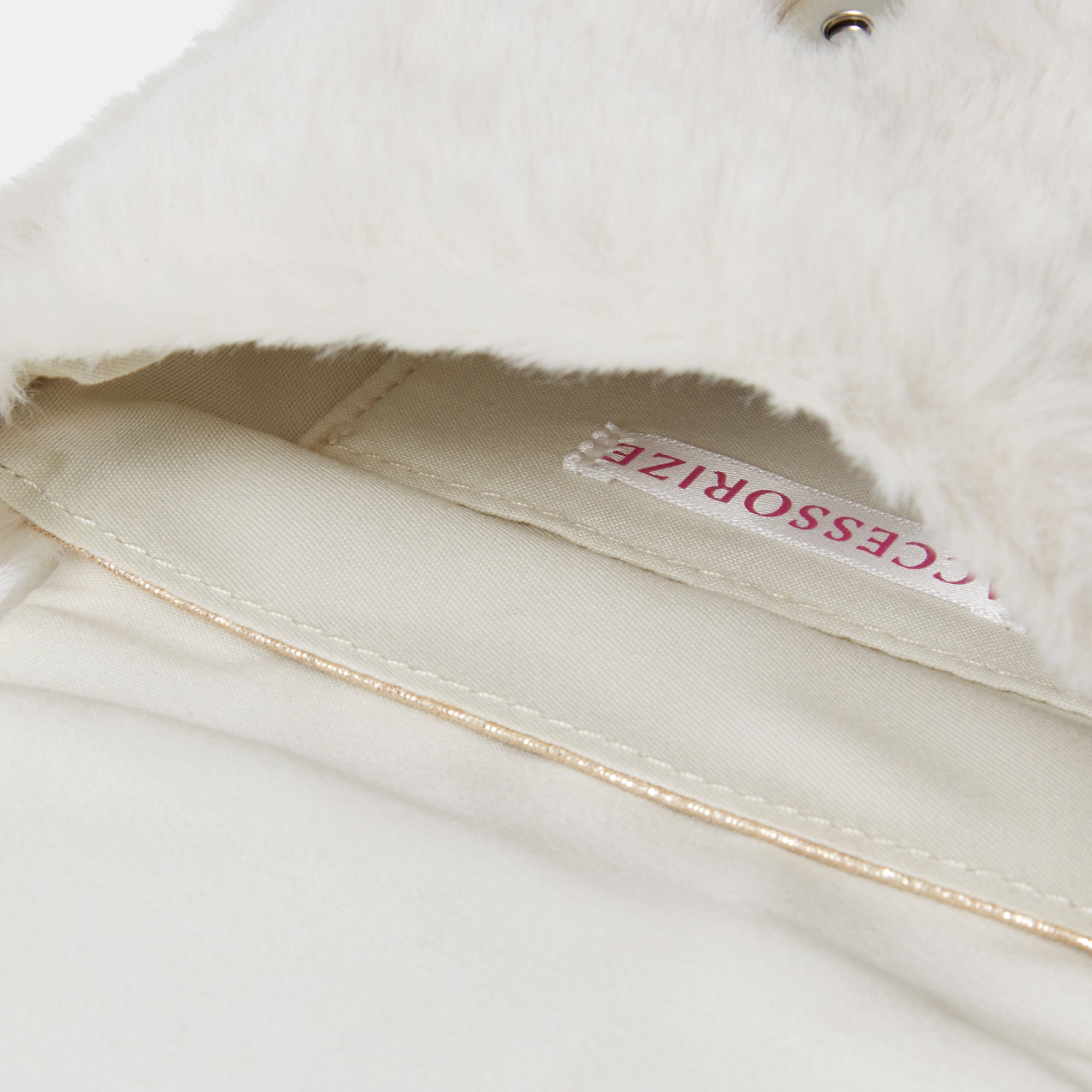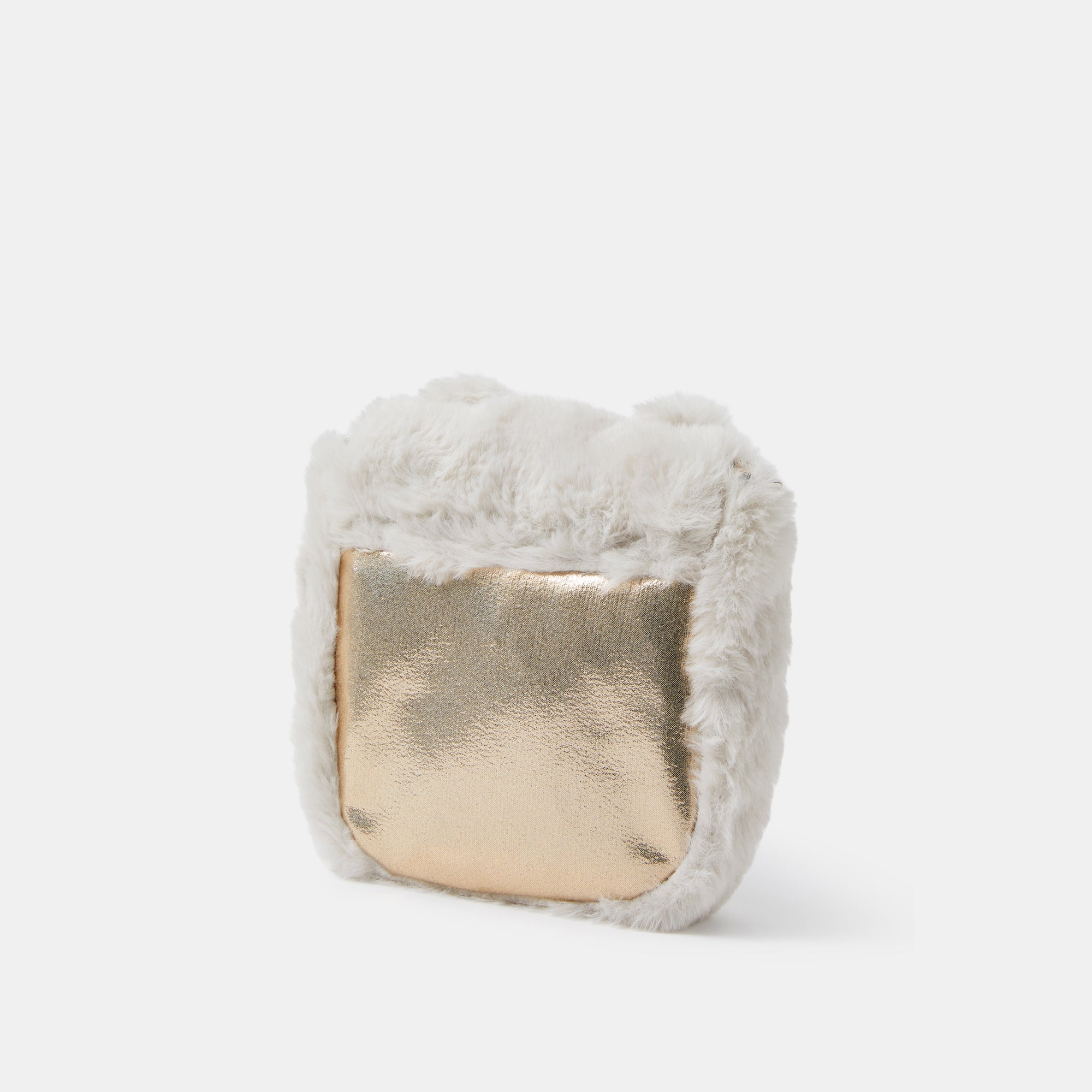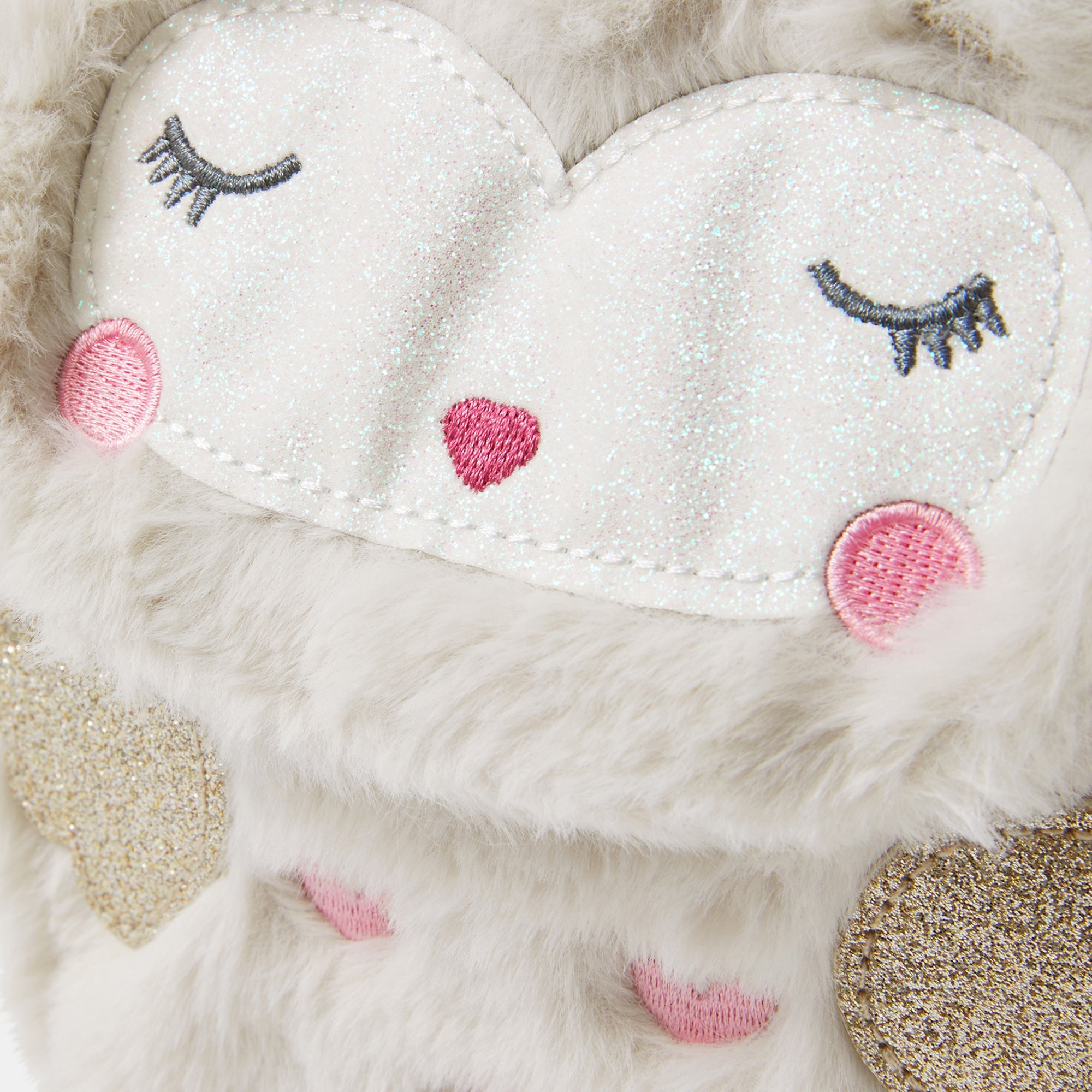 Hoot hoot, how cute! A friendly companion they can style with all their weekend looks, this crossbody bag is made from super fluffy faux fur with a glitzy owl face decorating the front. Features a magnetic button closure, inside slip pocket and long strap in a gold metallic finish.