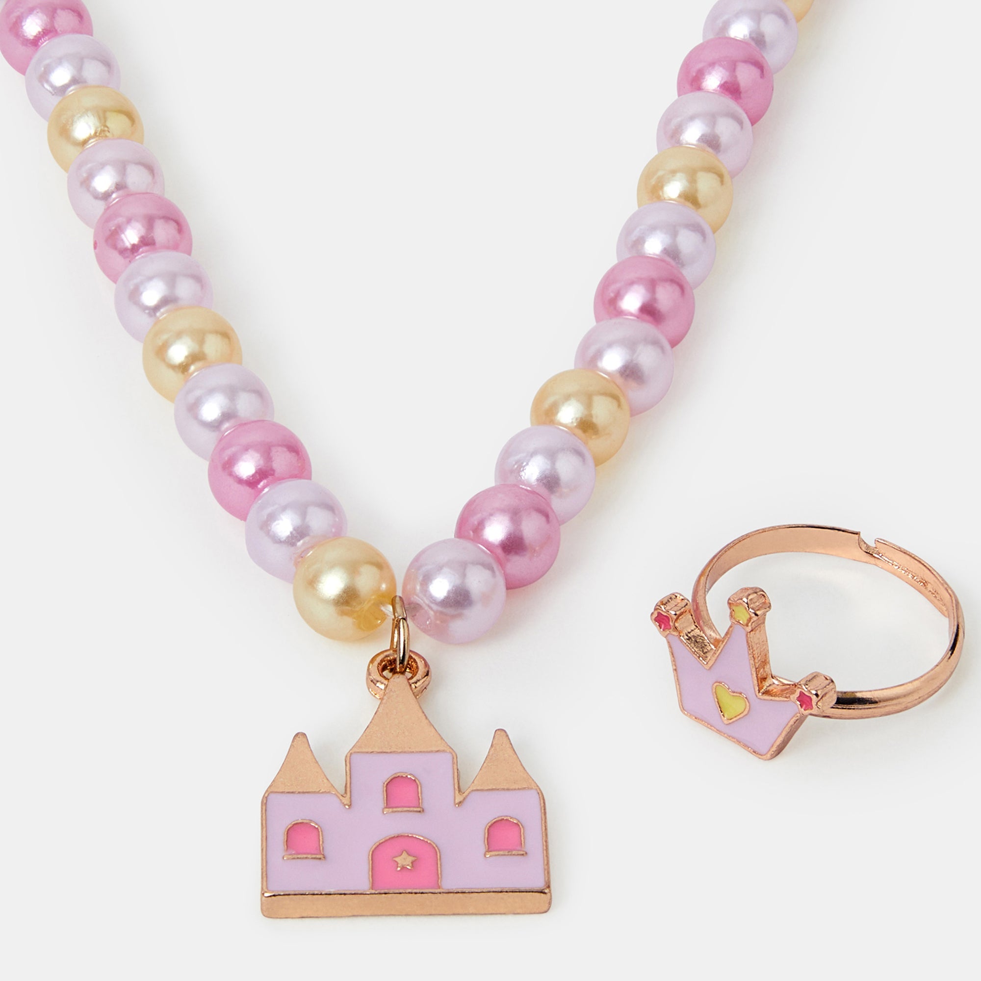 Jewels fit for a princess! Decorated with pearly pastel beads and princess-inspired charms, this set includes a necklace and adjustable ring.