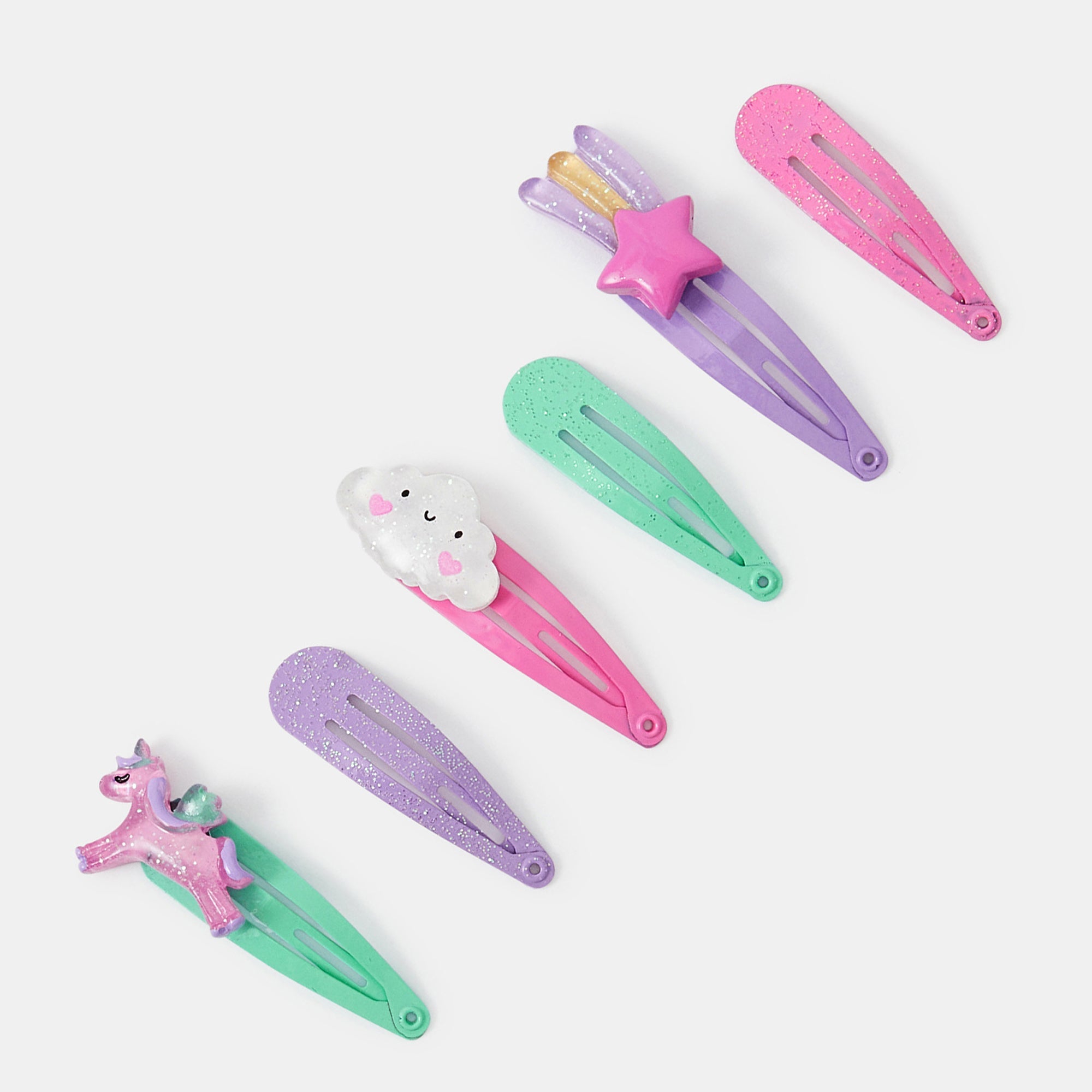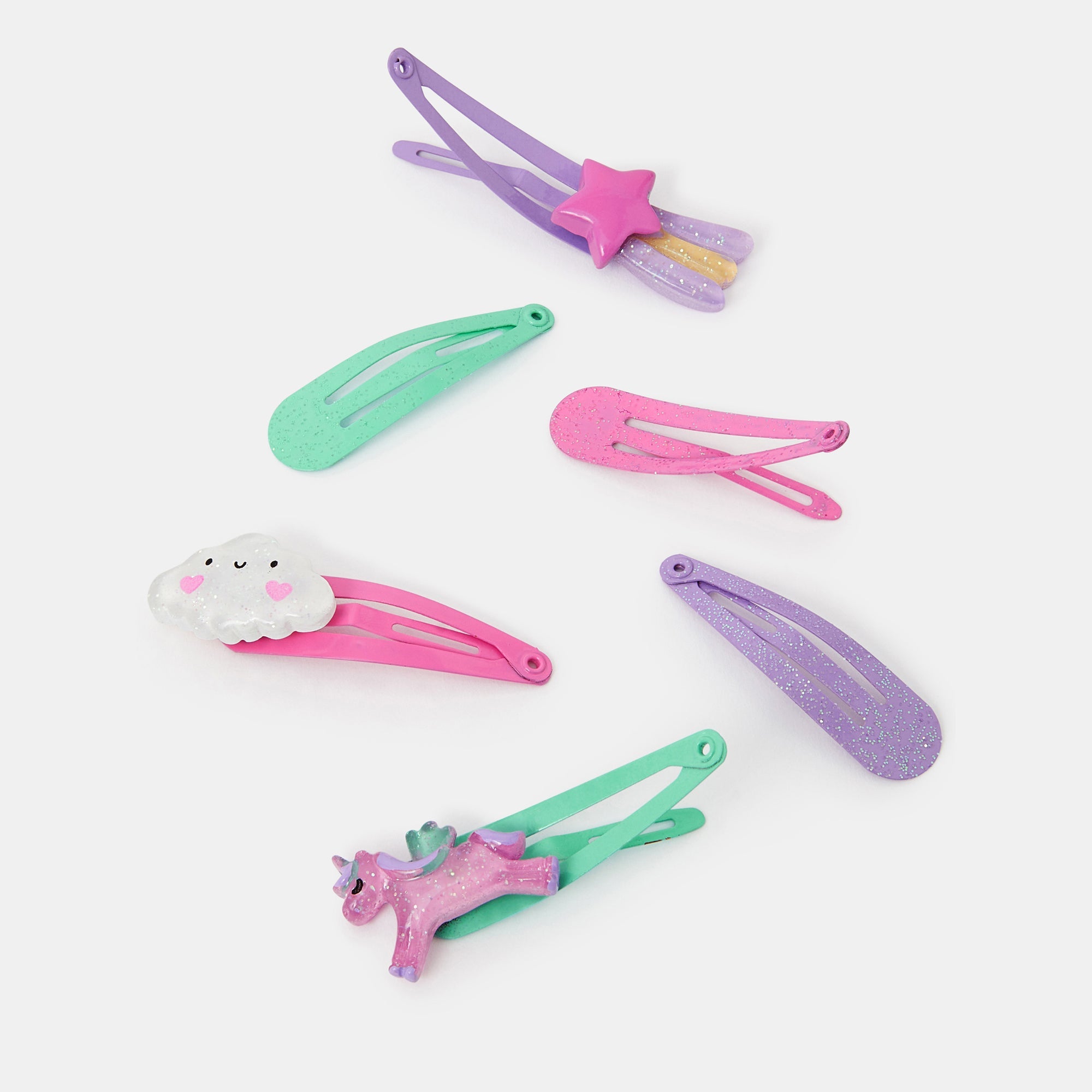 A magical addition to their hairstyles, these hair clips come in pink, purple and green. Three are covered in glitter whilst the others have a shooting star, happy cloud and unicorn motif to finish. Six included.