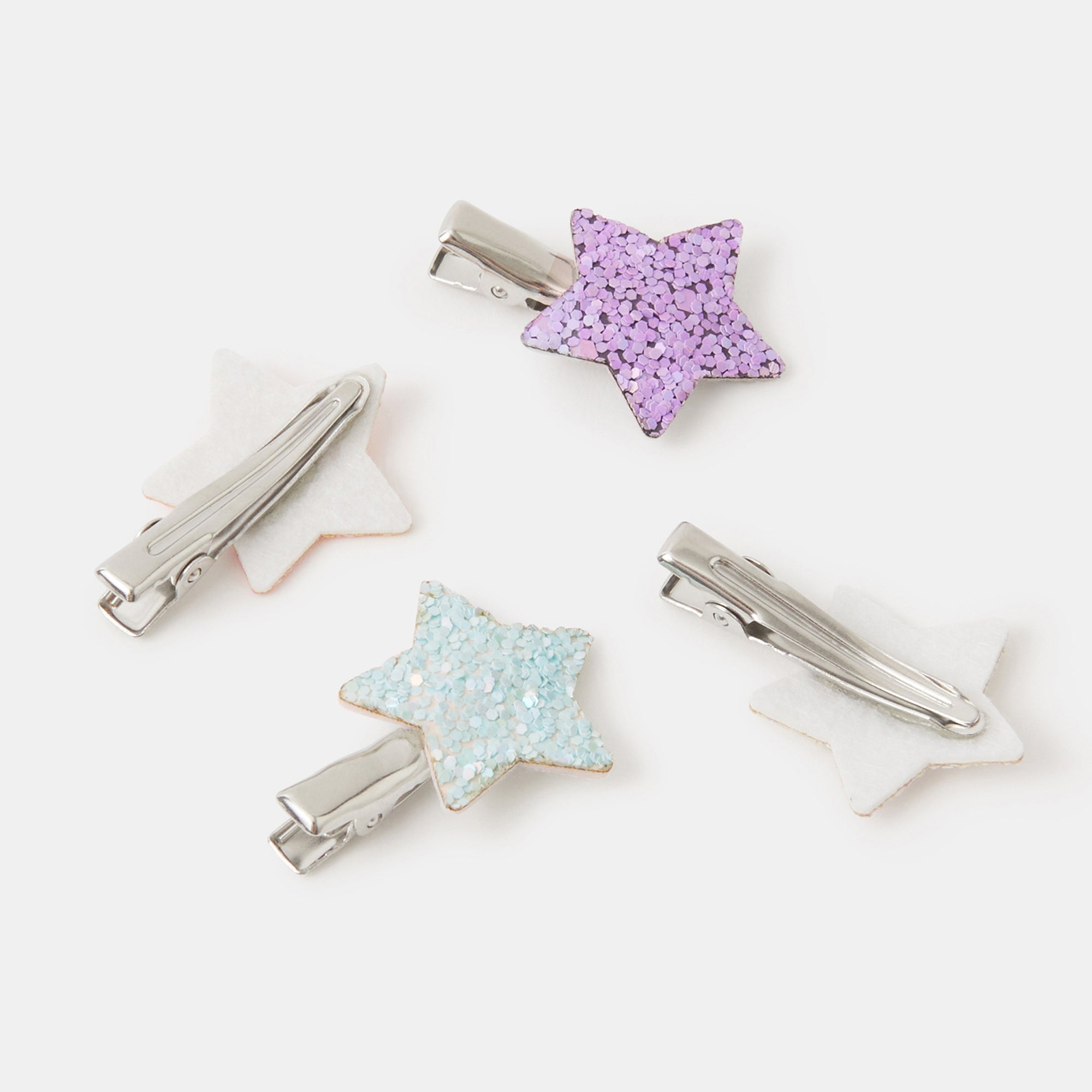 Accessories for little ones with style that's out of this world! These hair clips feature glitter stars in purple, peach, blue and pink sitting atop silver-tone salon clips. Four included.