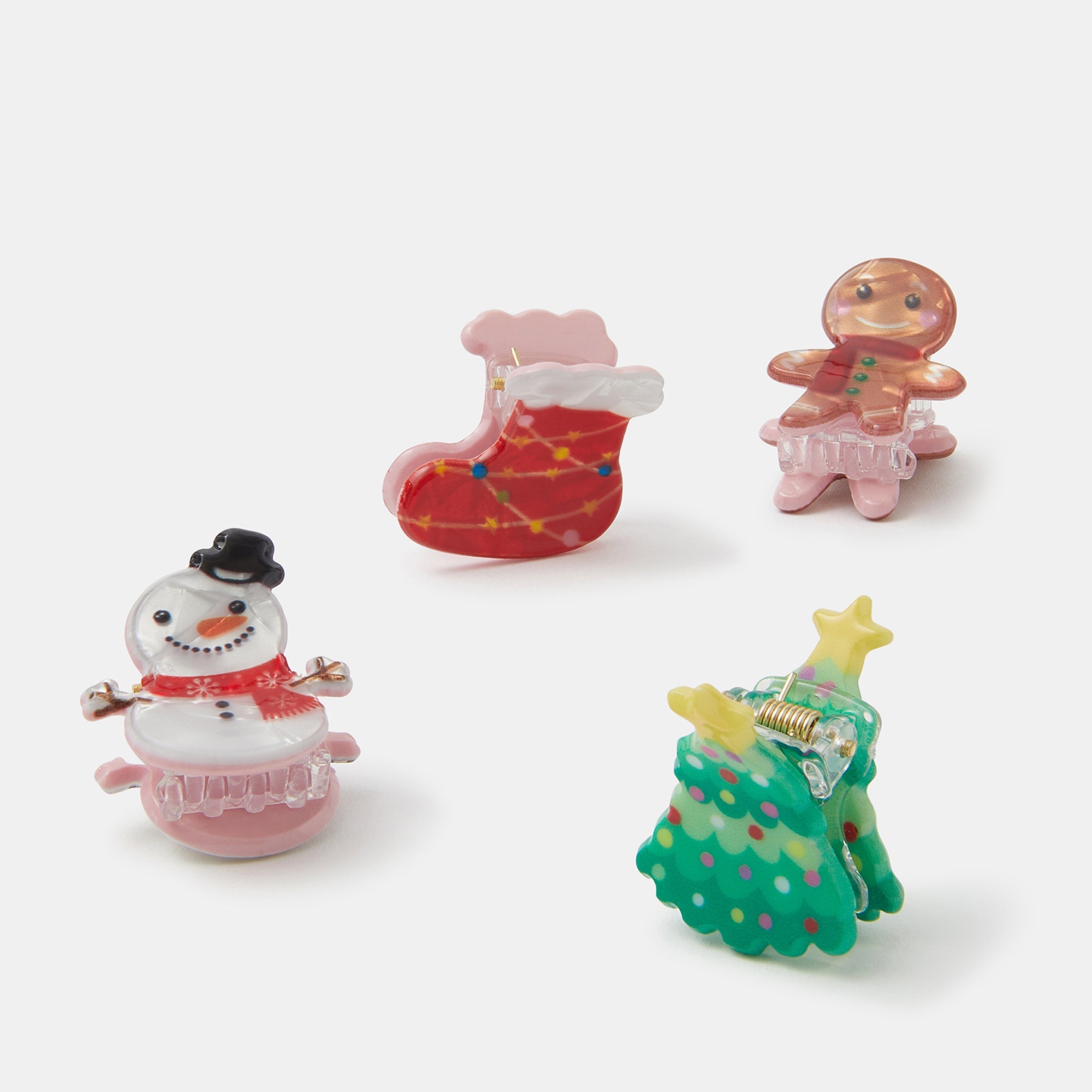 Designed in a shiny resin finish, these festive claw clips feature a Christmas tree, stocking, snowman and gingerbread man design. Four included.