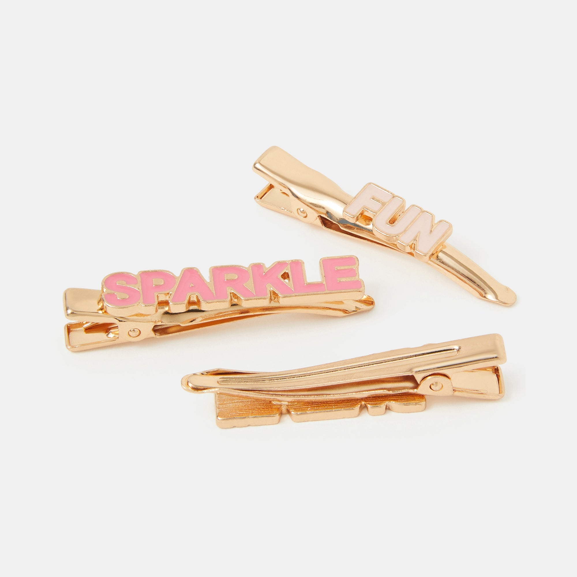 Words to live by... Slide some fun into their looks with these hair clips. Dipped in a golden tone, the slogans include 'Fun', 'Dream' and 'Sparkle' in pretty pastel resin colours. Three included.