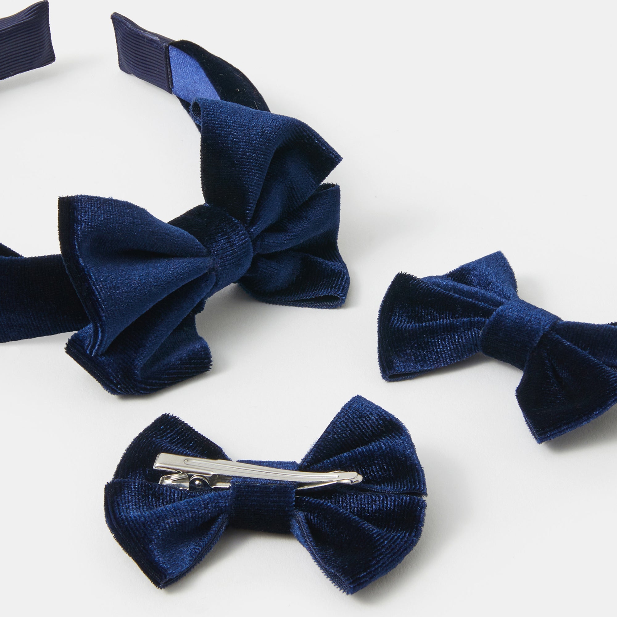 Made with a soft velvet finish, these hair accessories are perfect for when they're heading back to school. Set includes a bow headband and two bow hair clips to match.