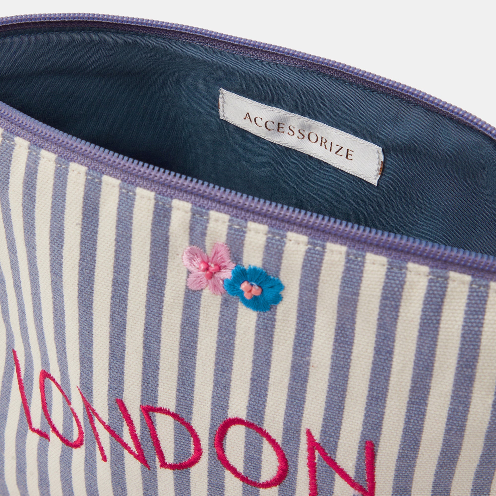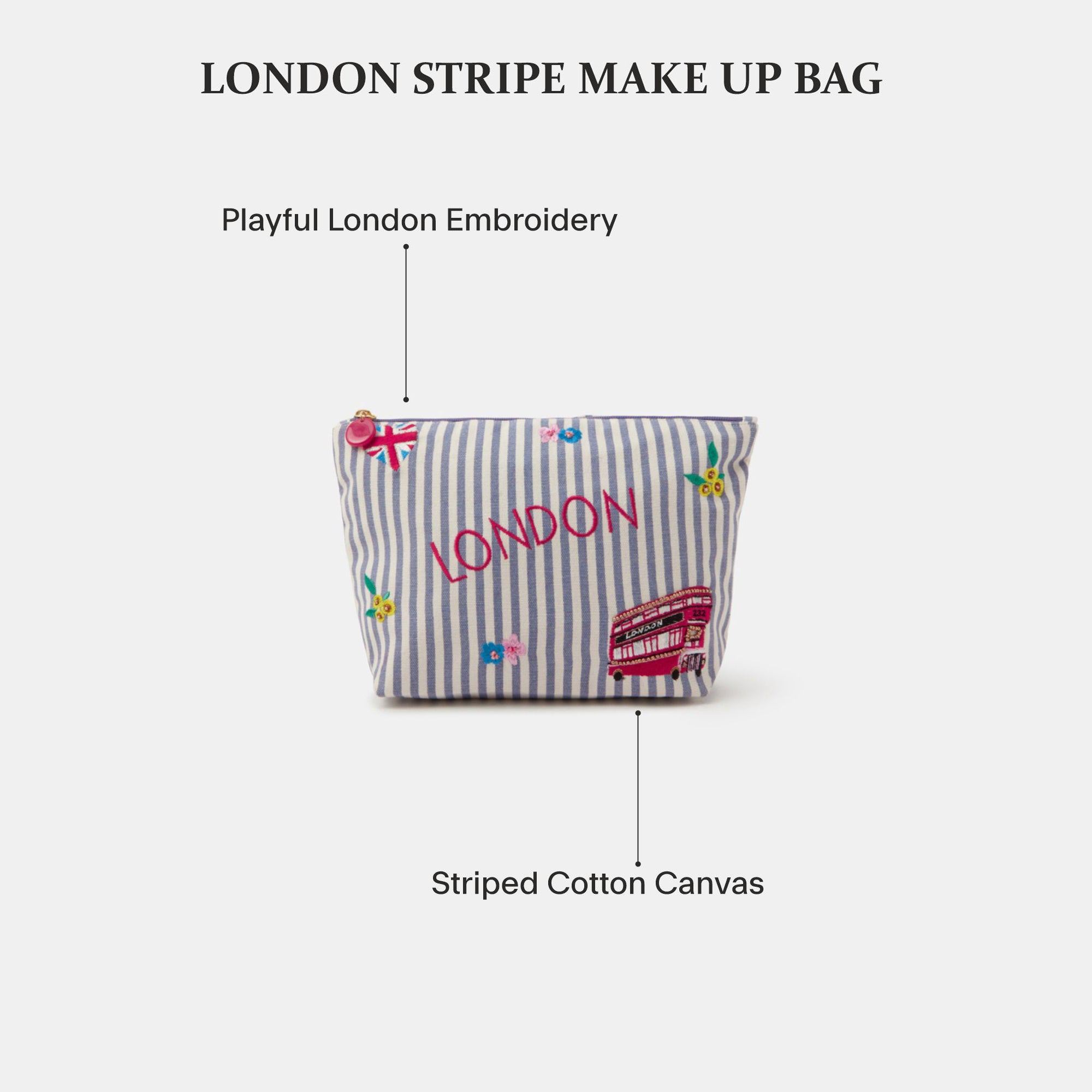 Celebrate city vibes with the London Stripe Make Up Bag – a playful and practical companion for your daily routine. Crafted in cotton with a striped backdrop, it’s beautifully embroidered with iconic London-inspired motifs like buses, crowns, and florals. Compact yet spacious, this makeup bag keeps your beauty essentials neatly organised with its zip-top fastening, making it perfect for travel or everyday use.