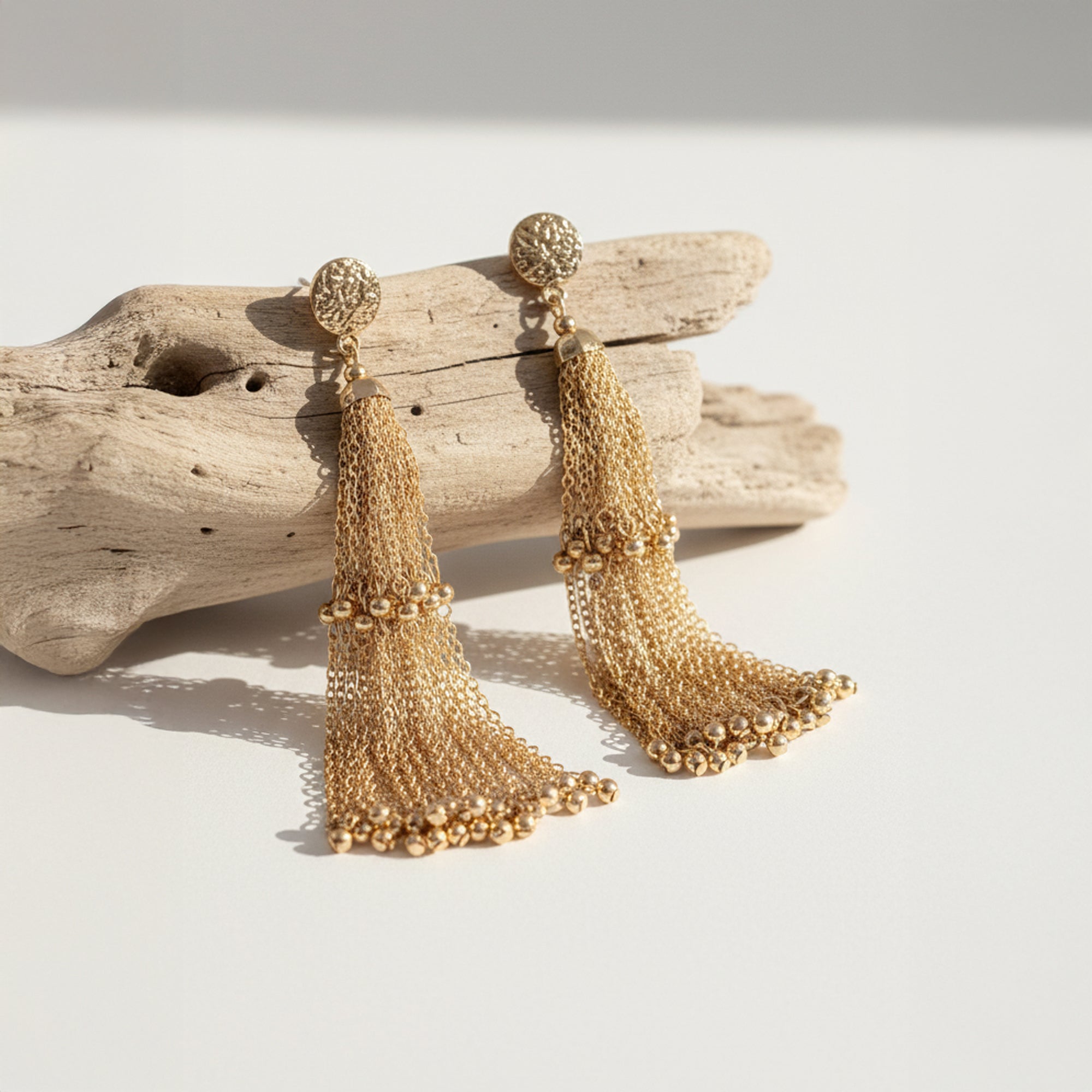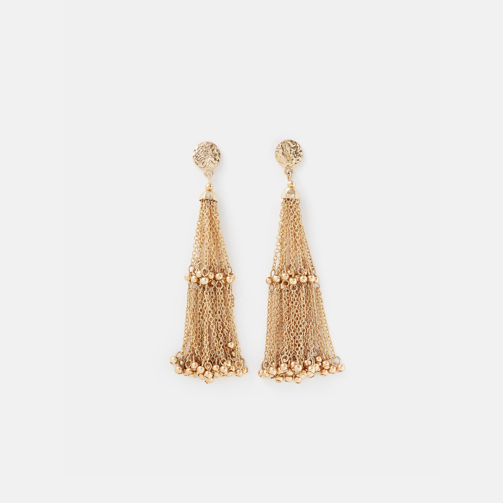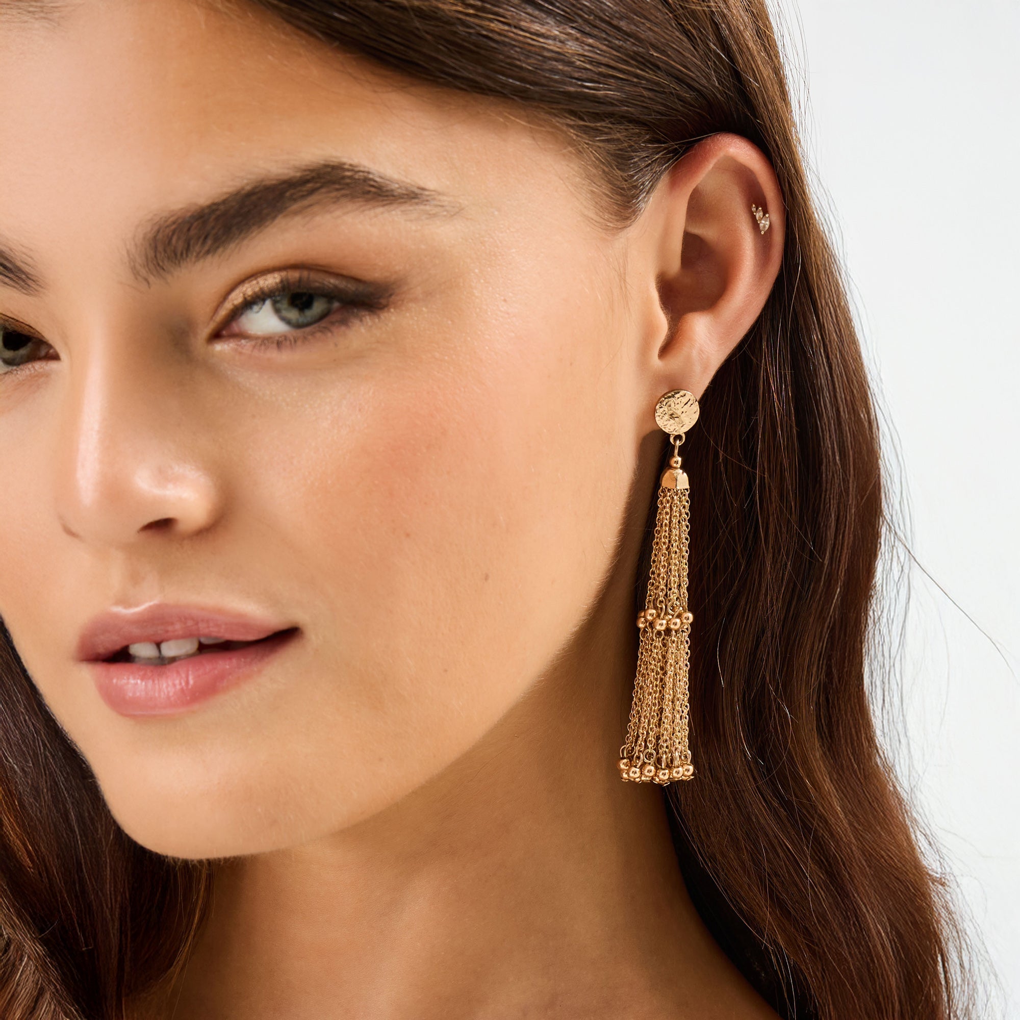 Like a chandelier in a ballroom, these earrings are a dazzling finisher for all your night-out looks. Designed with golden chain tassel dangling from a textured coin stud. Swish, swish.
