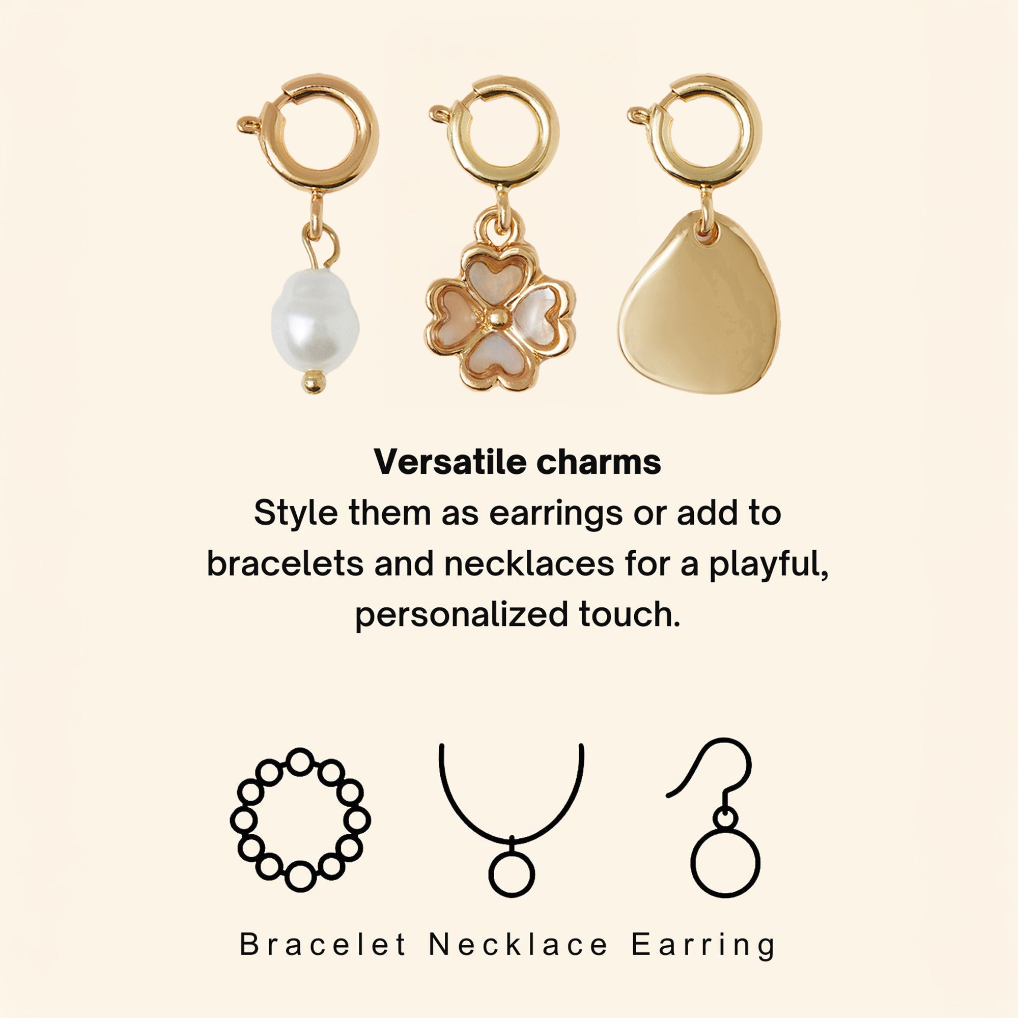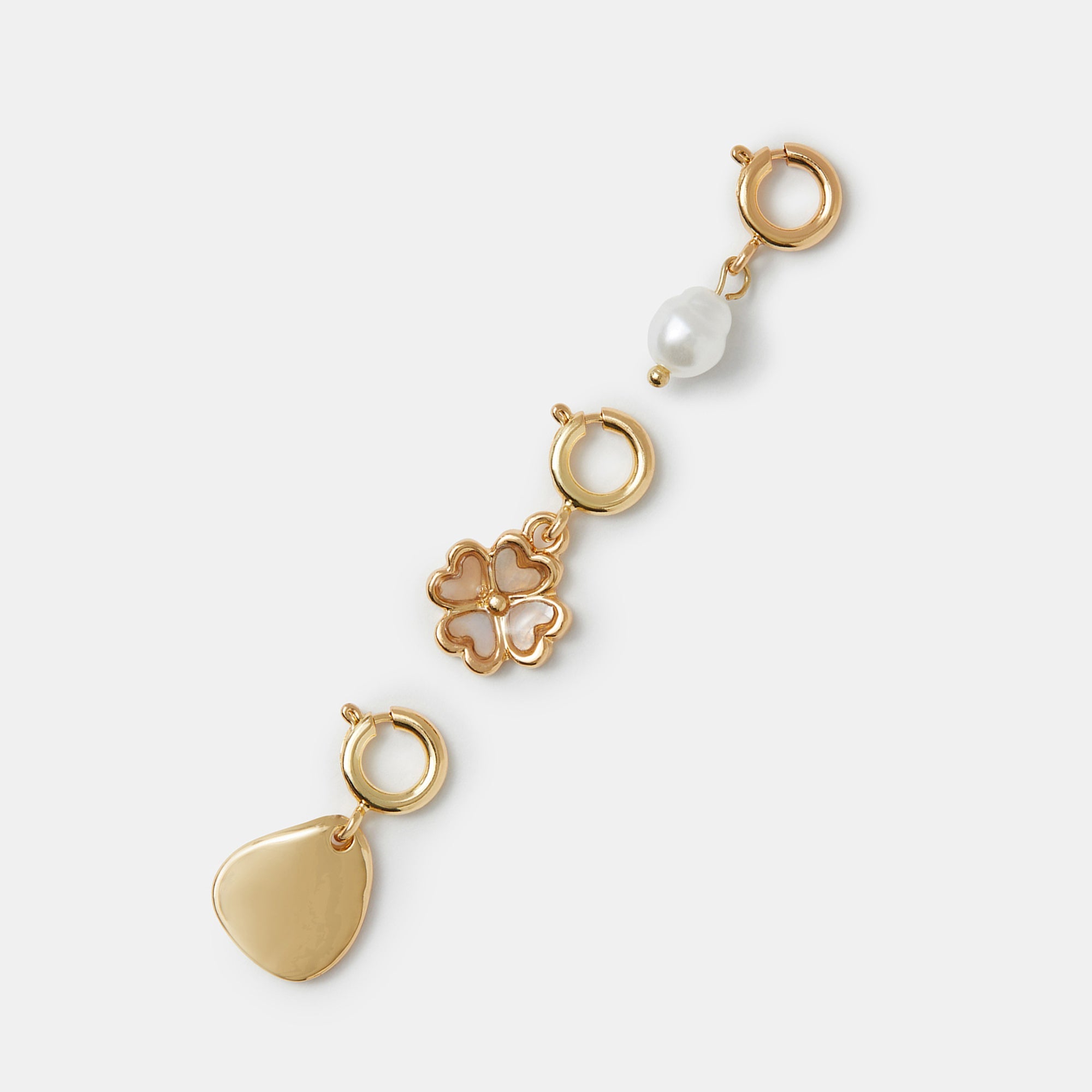 Looking for ways to personalise your jewellery? Well, you're in luck. Dipped in a golden tone, this set of charms includes a four-leaf clover, (faux) pearl bead and sculptural disc design, with clasp fastenings to clip to any bracelet, necklace or hoop earring in your collection. Sold as a set.