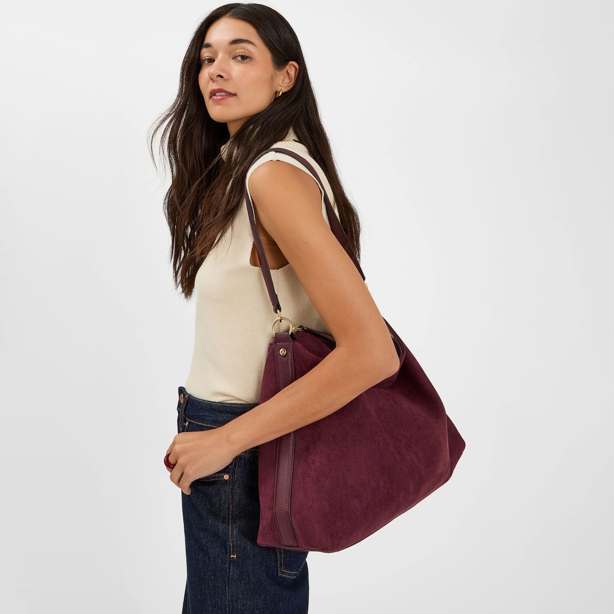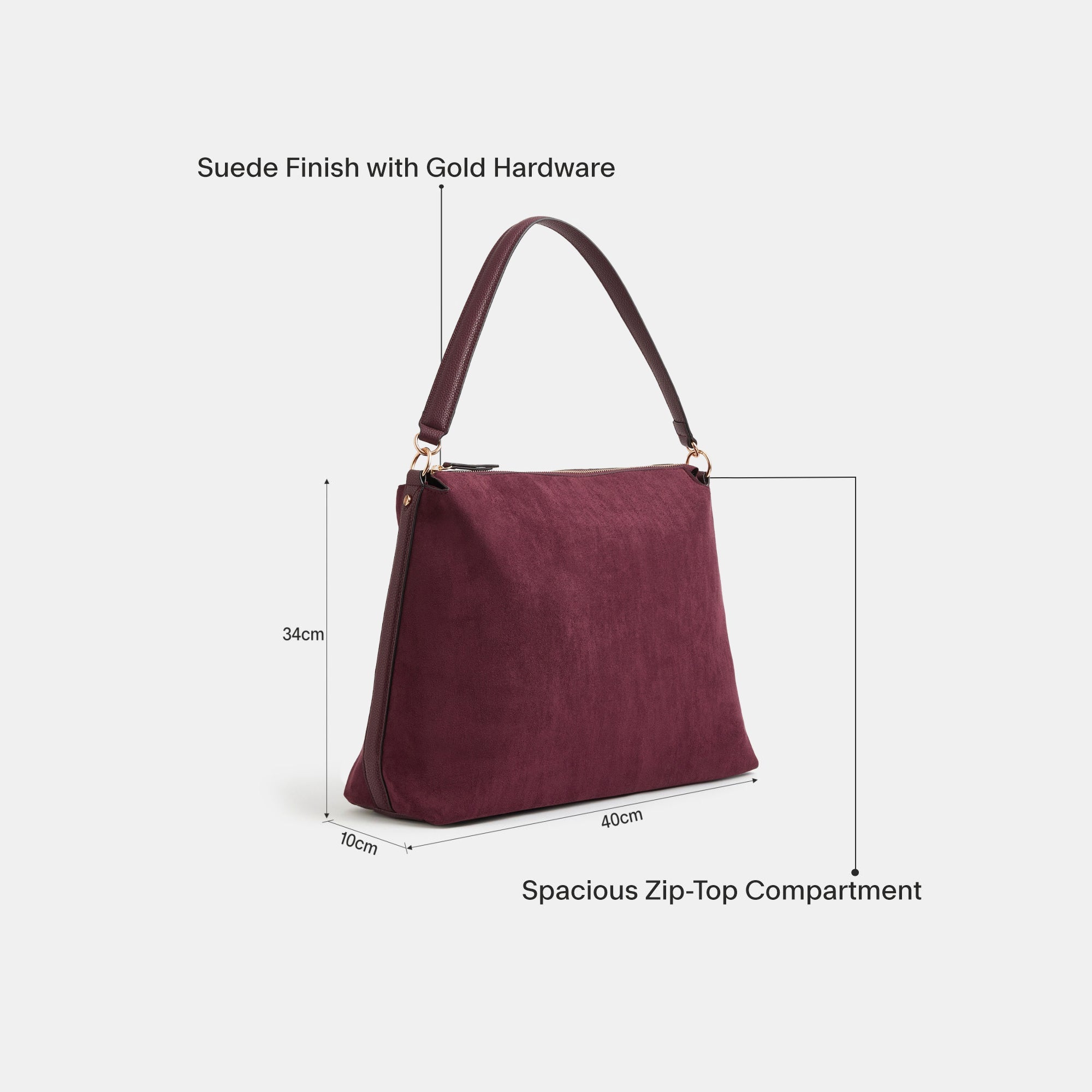From runway to the high street, you'll see (faux) suede everywhere this season. Slouchy and chic, this bag features a big, slouchy profile with a single shoulder strap. Finished with a main zip compartment and small zip pocket inside. Red