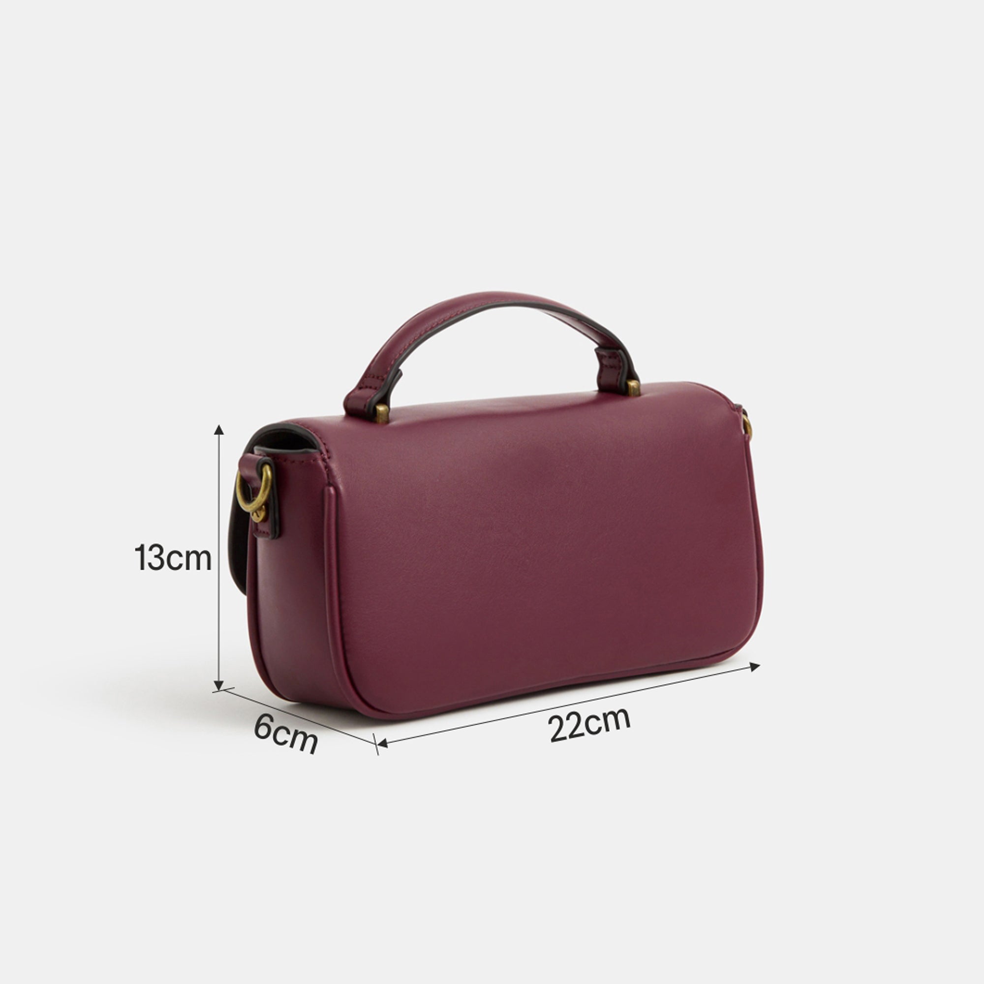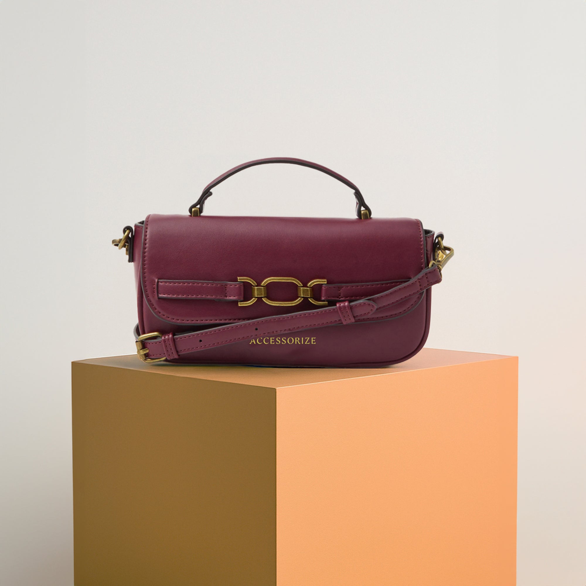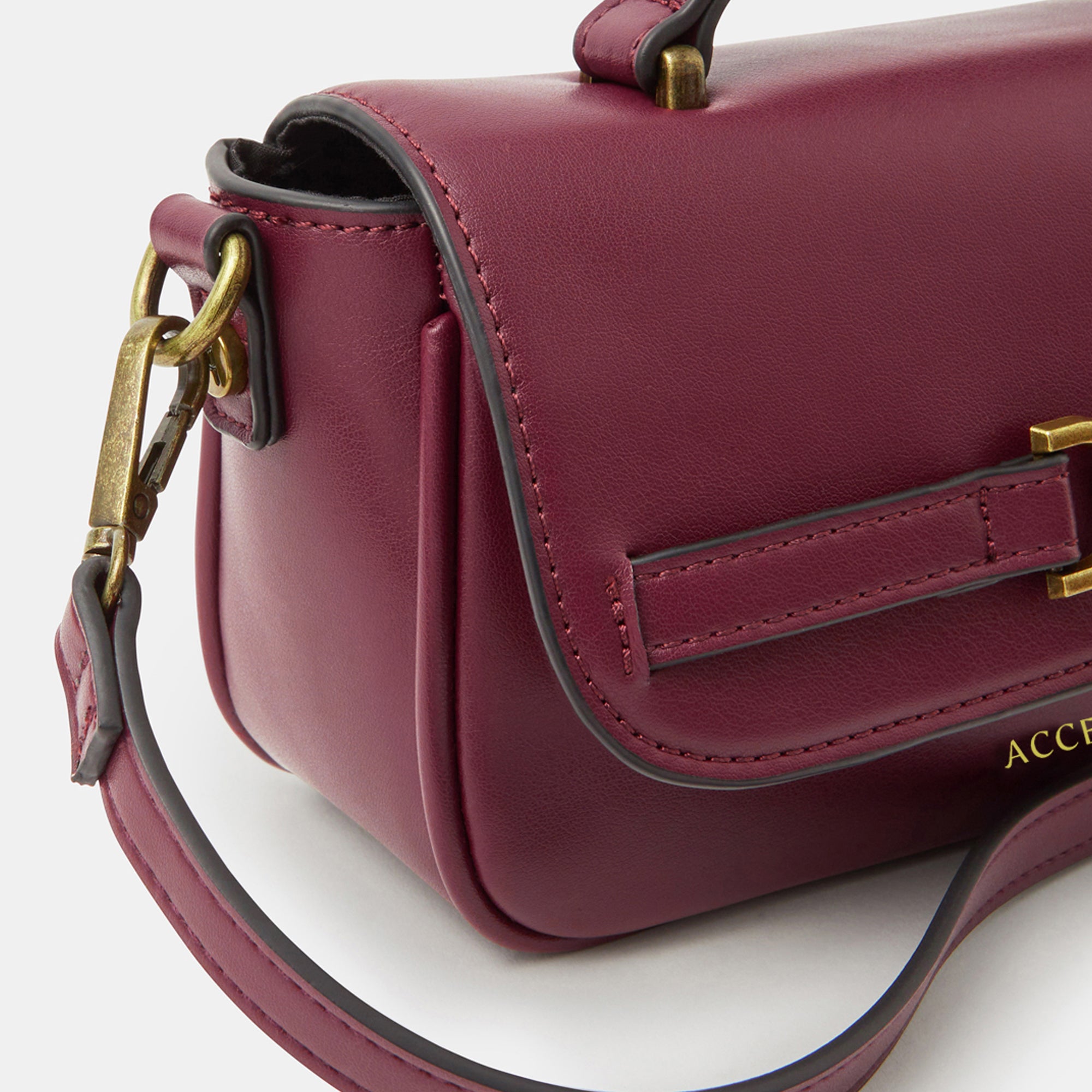 A chic way of adding a pop of colour into your look, this crossbody is made of faux leather with brassy hardware for a vintage-inspired feel. Featuring a snaffle buckle detail, magnetic button fastening, top handle and detachable strap. Maroon