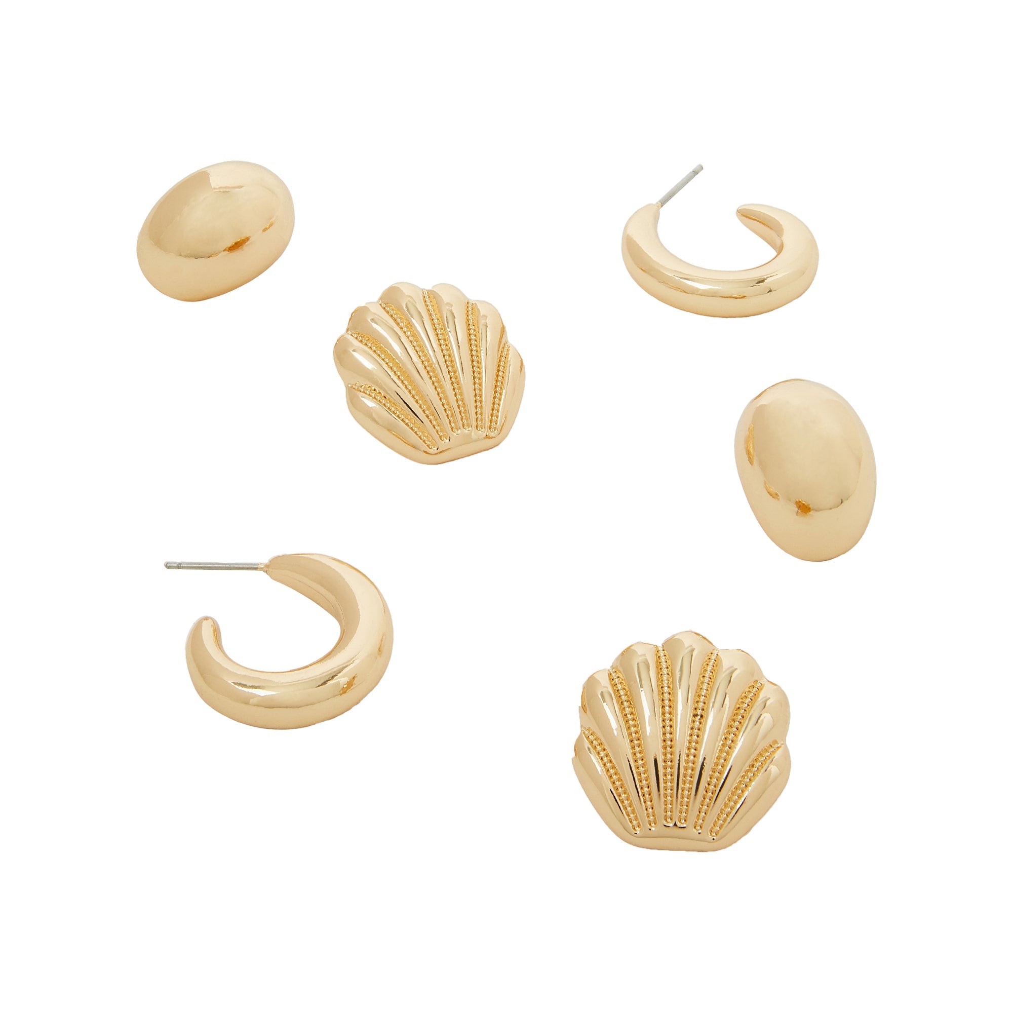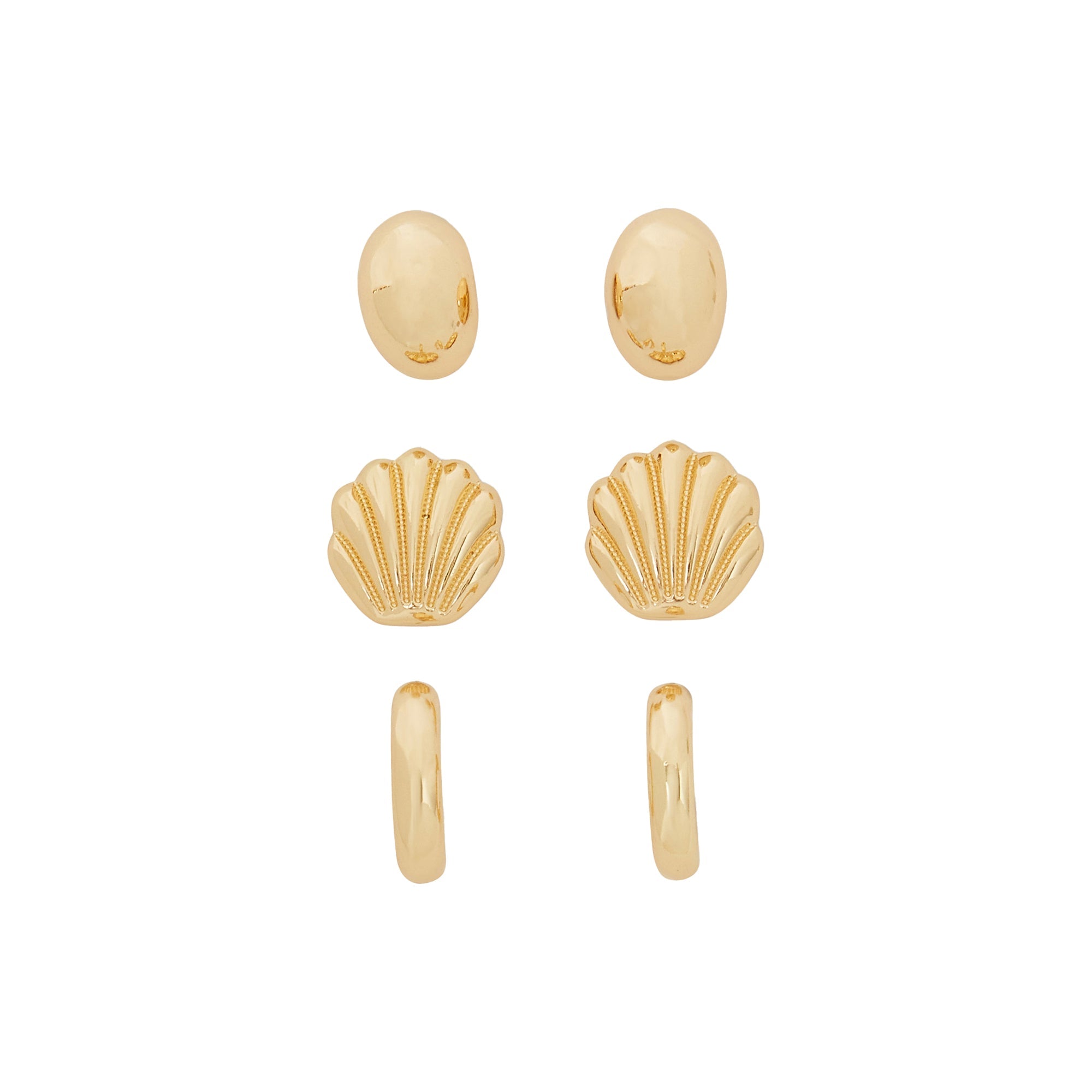 An Ariel ear-stack, this dazzling trio includes smooth pebble studs, seashell studs and a plain pair of hoops, all dipped in a shiny golden finish. Three pairs of earrings included.