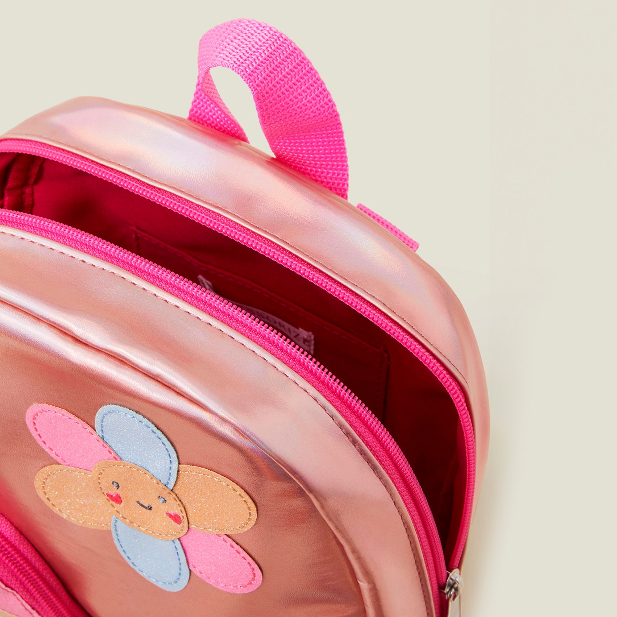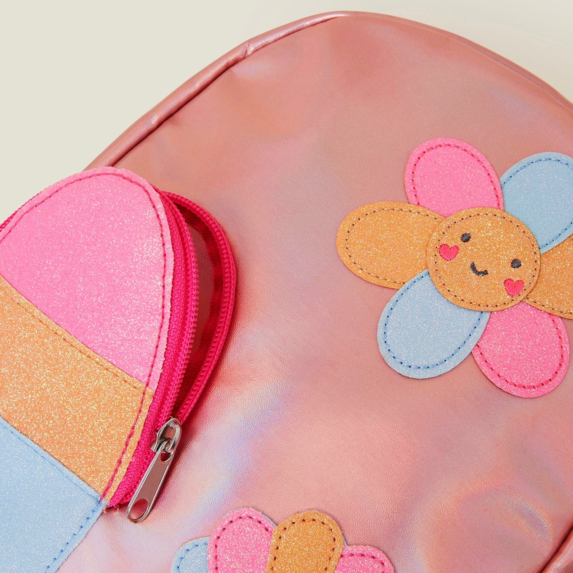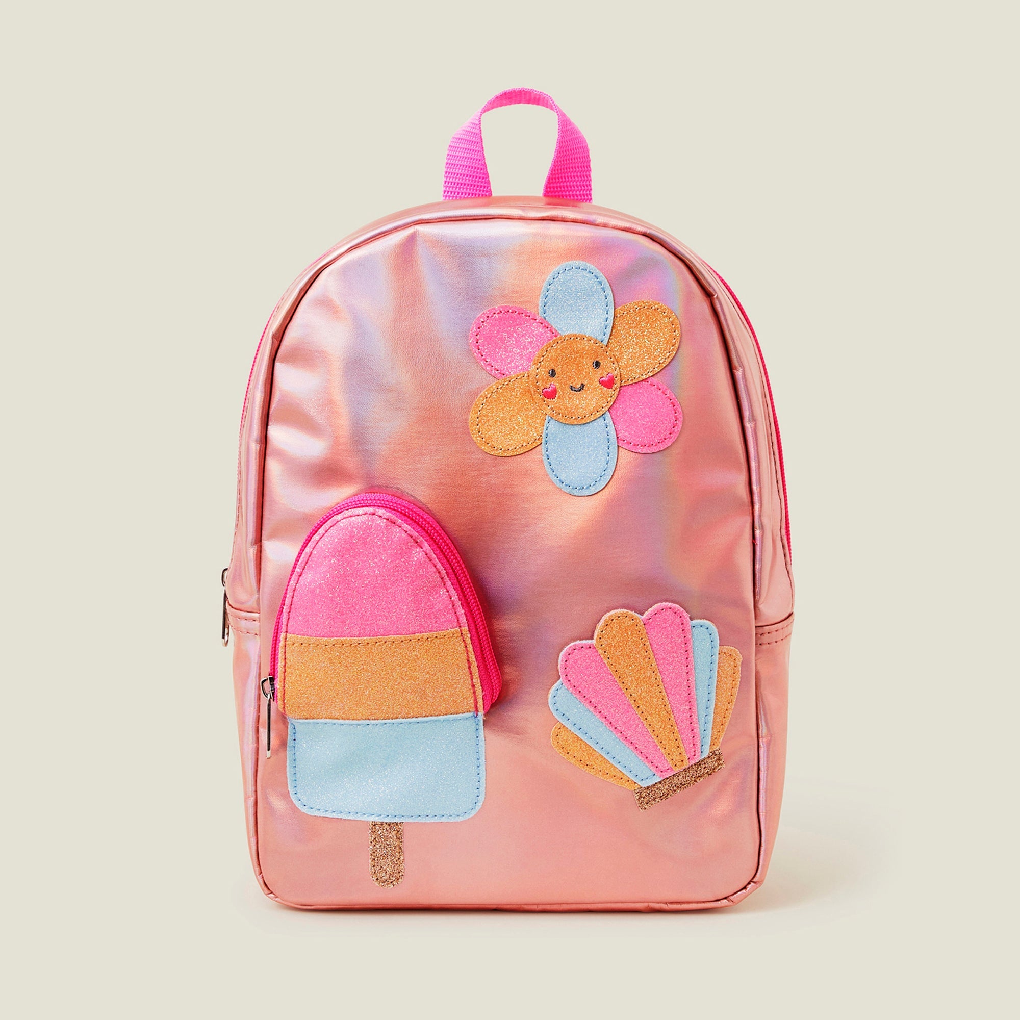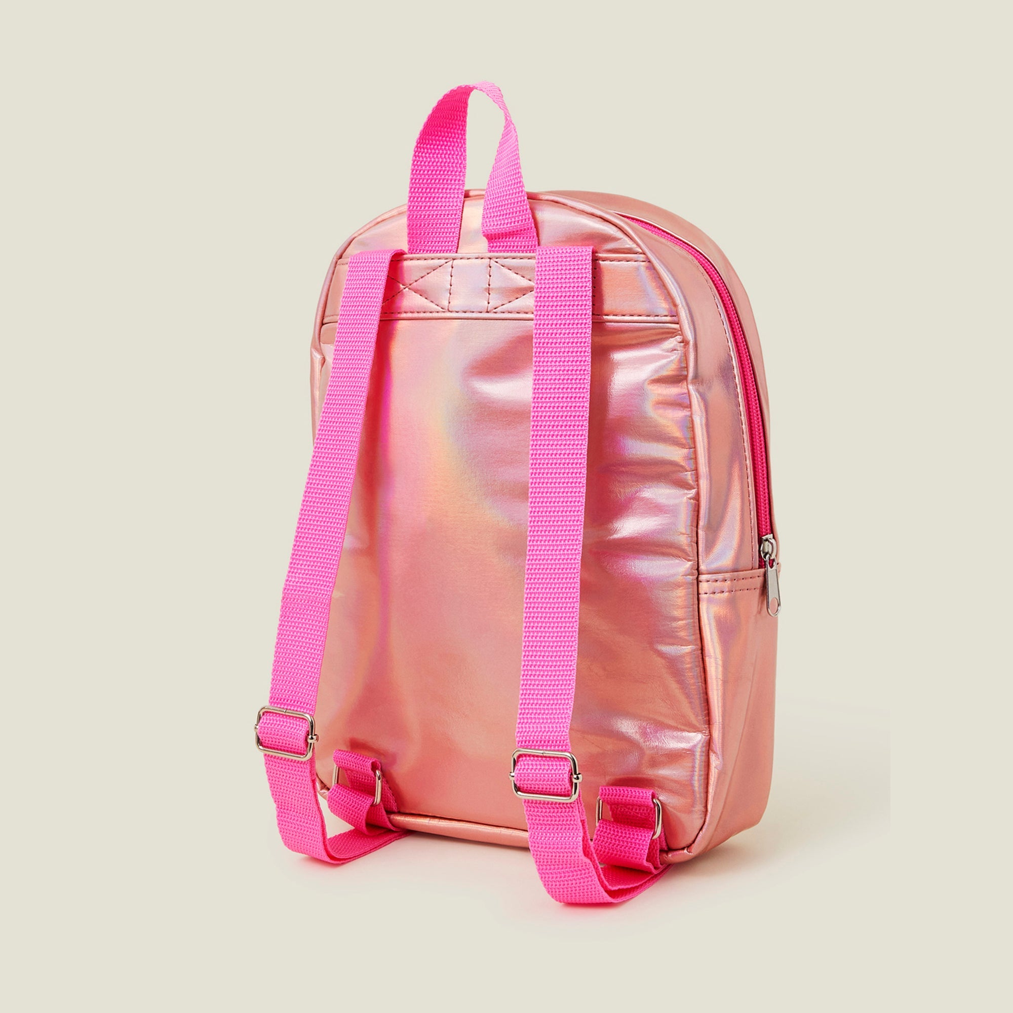 From this day forward, they'll always want to carry their own bits-and-bobs thanks to this fun backpack holding it for them! Designed with a holographic backdrop, it features colorful embroidered patches to the front. Finished with a front zip fastening, top handle and adjustable straps.