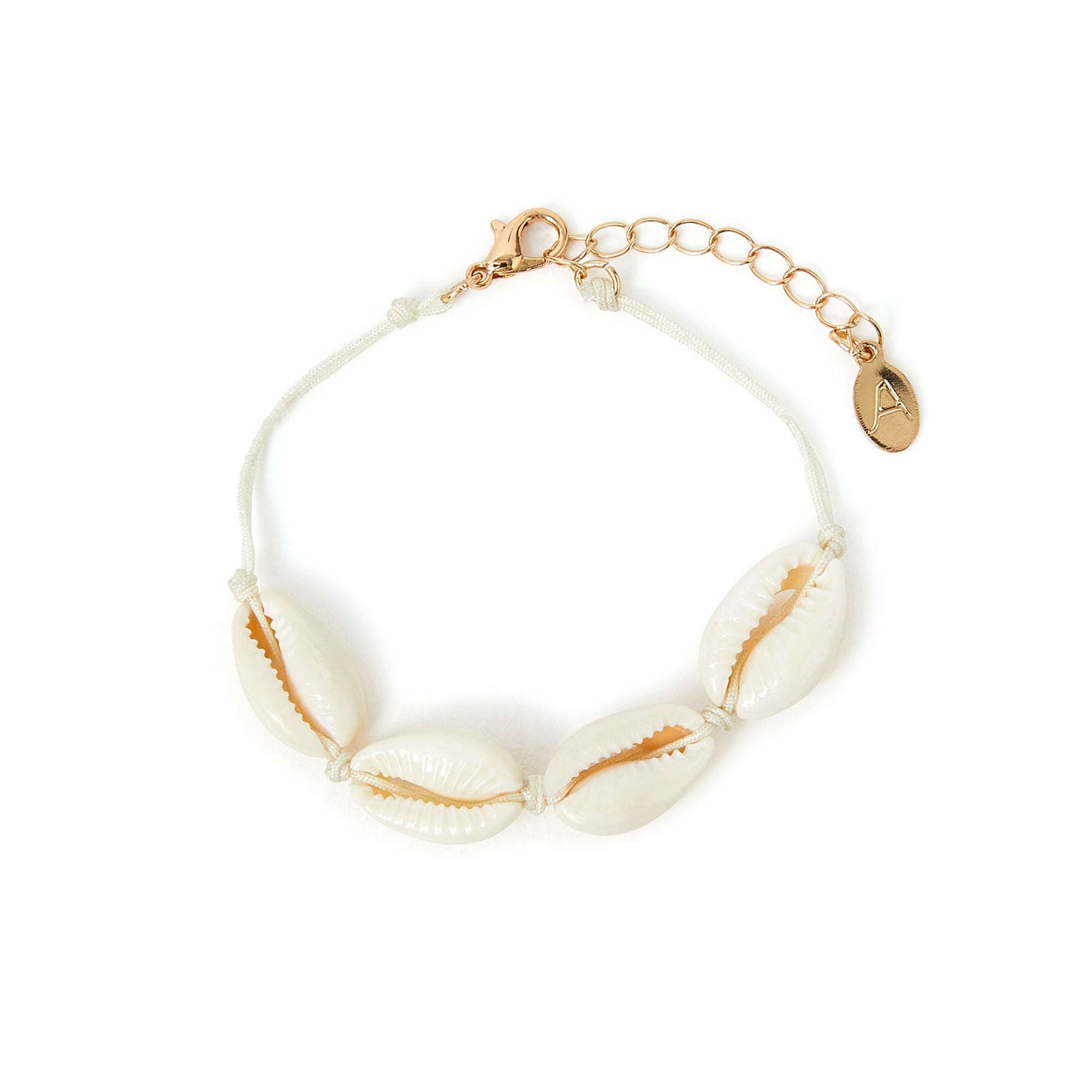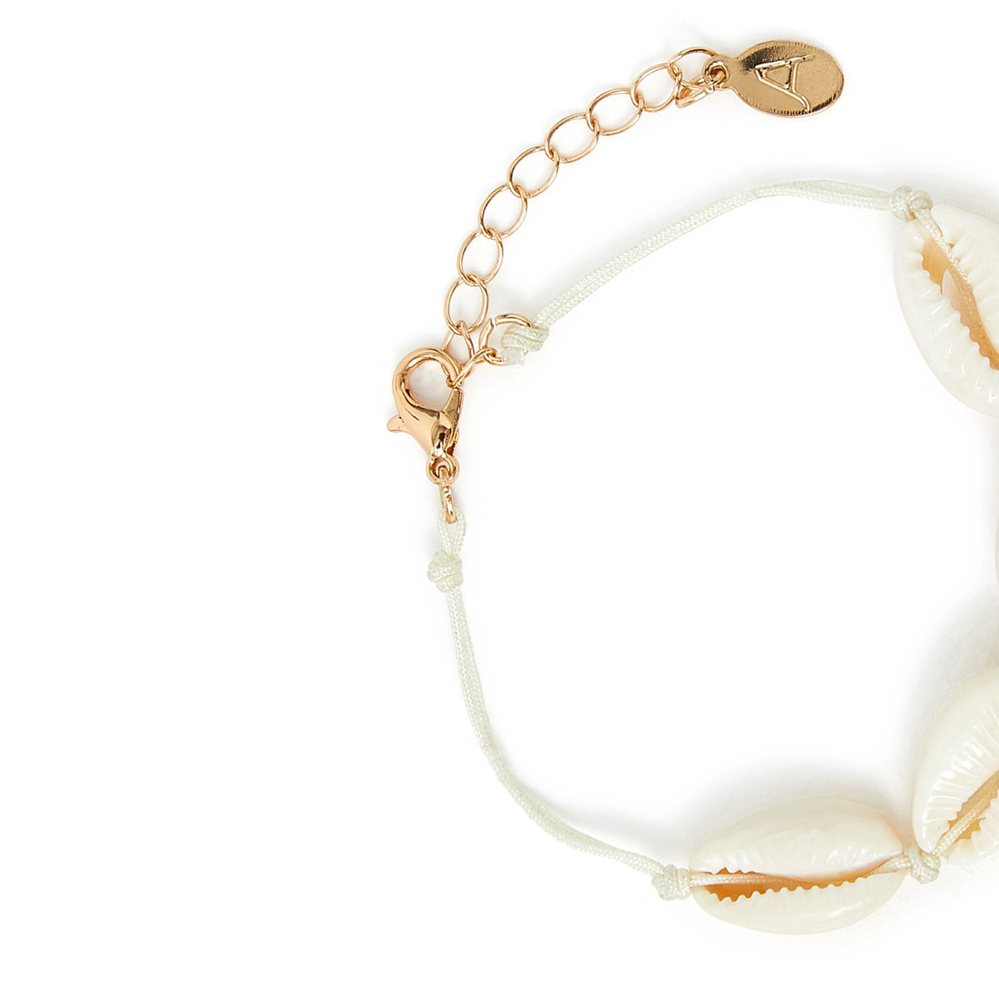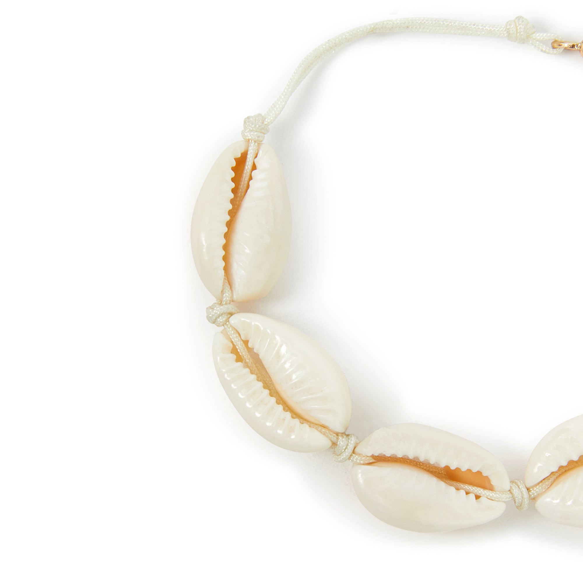 Jewels for the beach babes. Designed with white cord and strung with cowrie shells, this bracelet looks best with nothing but a bikini. Matching necklace available.