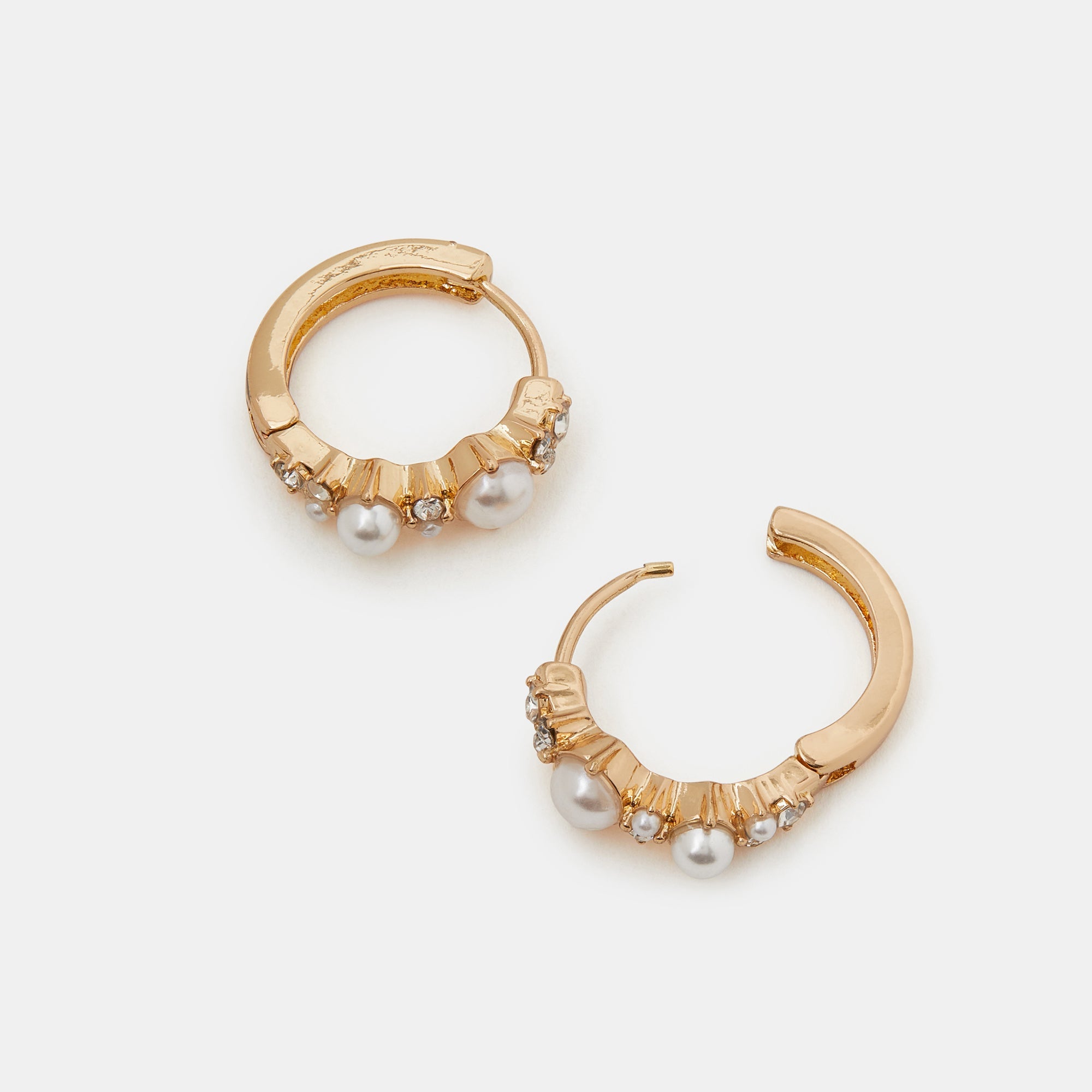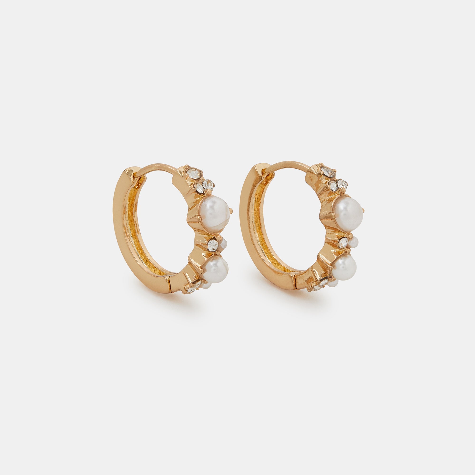 Ready for a pearls night out? Dipped in a golden tone, this dazzling pair is encrusted with sparkly diamantes and shiny faux pearls on the miniature clicker hoop profile. The lever back lock offers both security and ease of wear