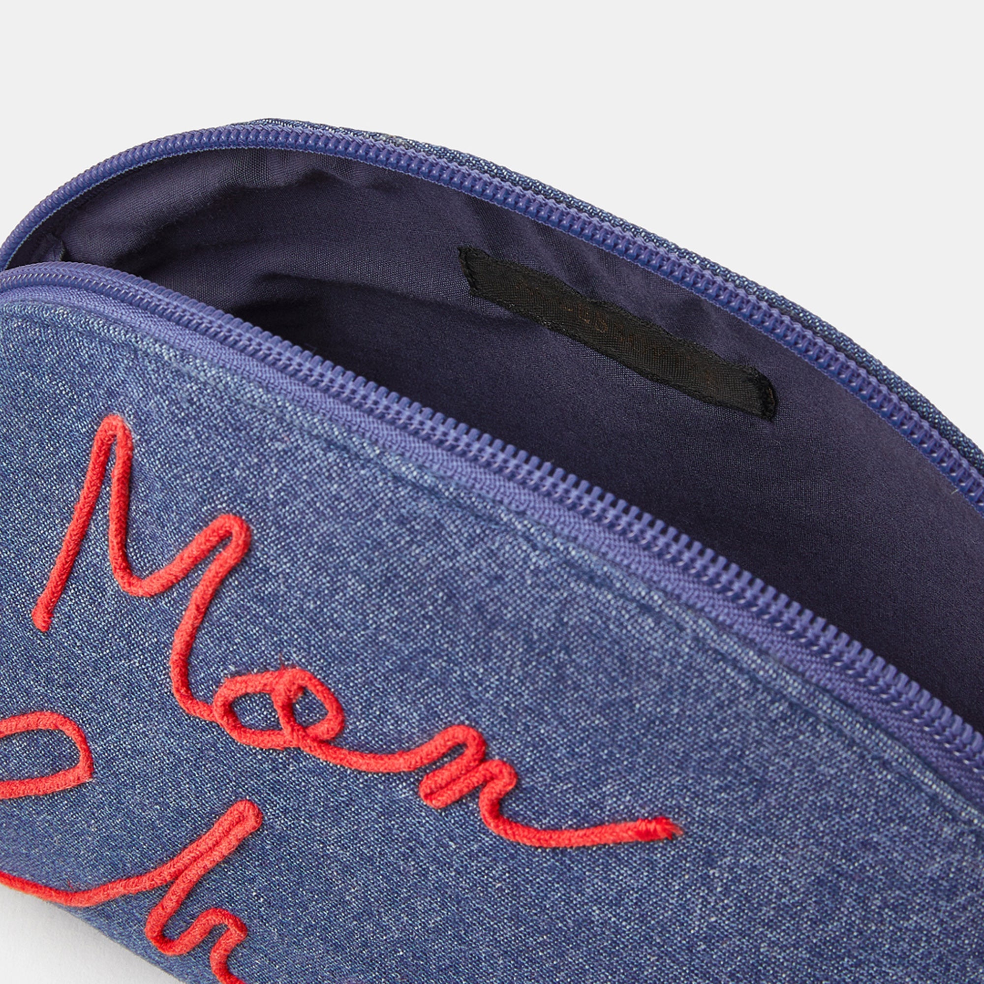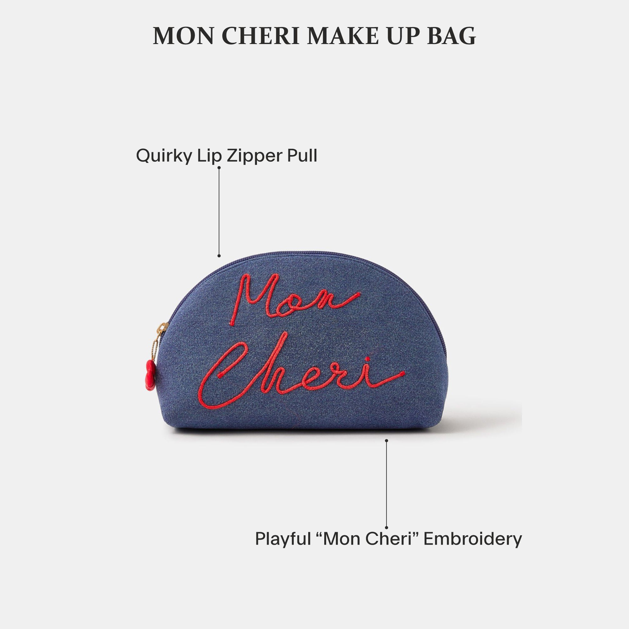 Say bonjour to chic organisation with the Mon Cheri Make Up Bag. Designed in a curved profile and embroidered with the playful “Mon Cheri” slogan in bold red, this makeup pouch adds a Parisian flair to your everyday routine. Finished with a lip-shaped charm on the zip fastening, it’s both fun and functional for carrying your beauty must-haves.