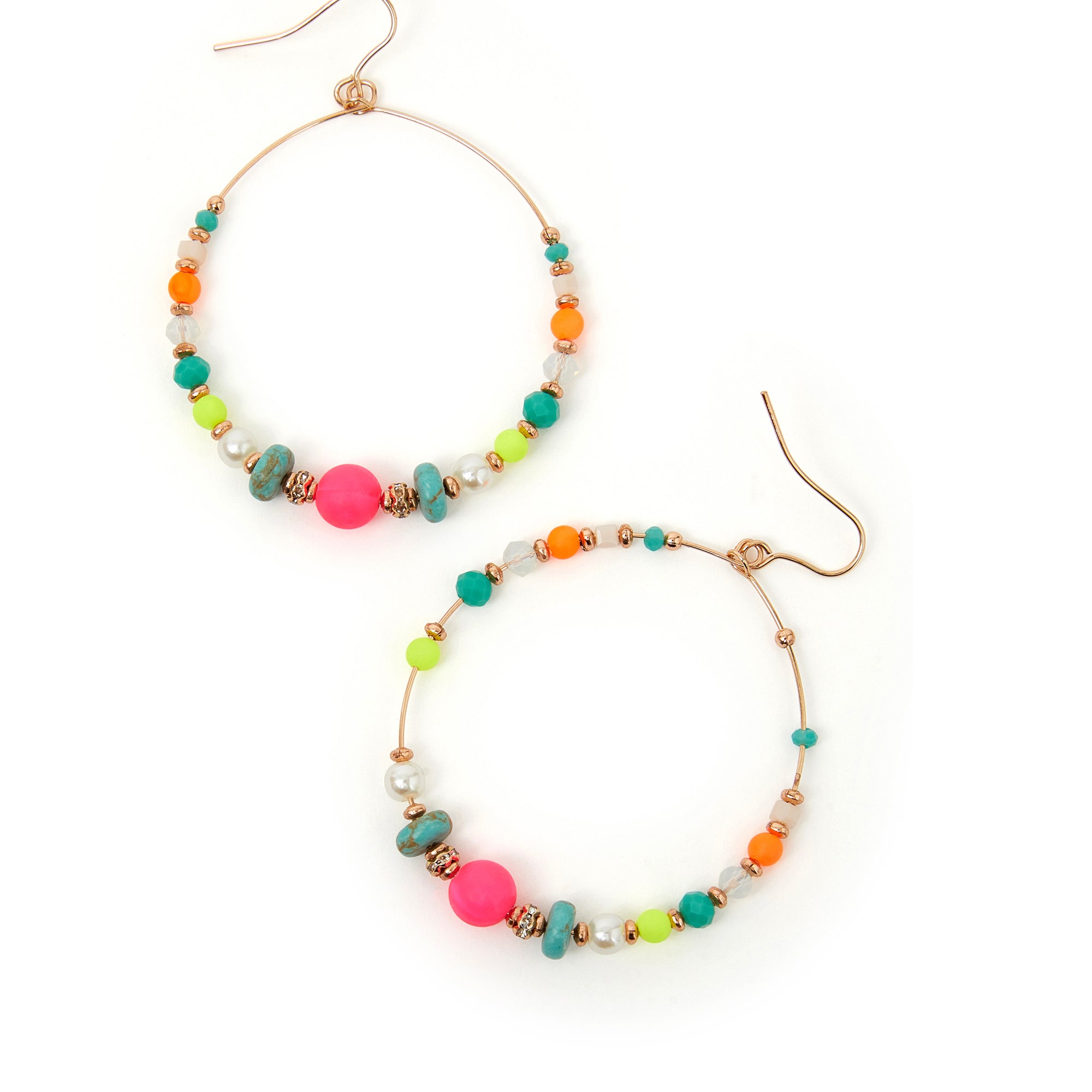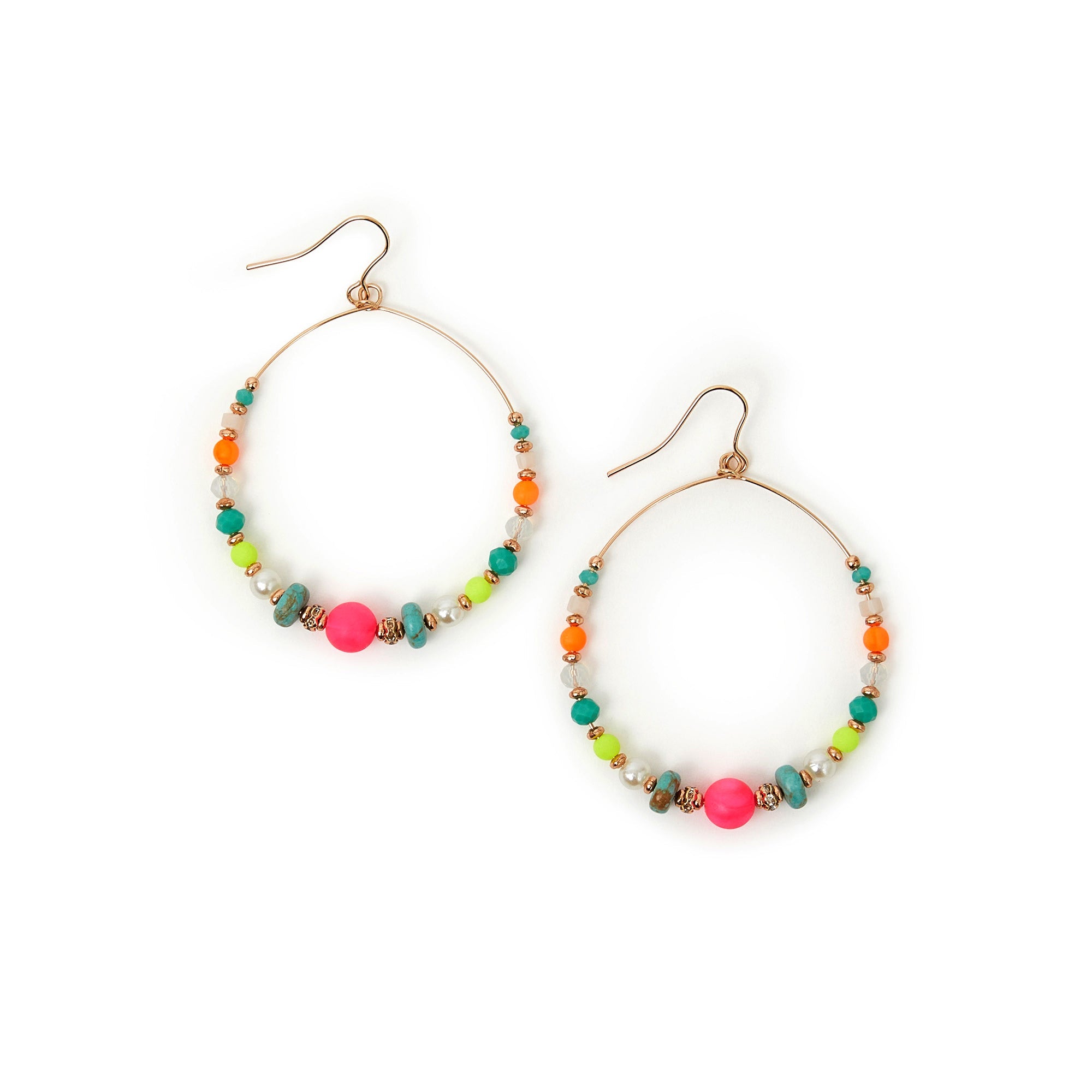 Bright and brimming with boho vibes, these statement summer earrings are decorated with a mix of colourful beads hanging from a hook profile.