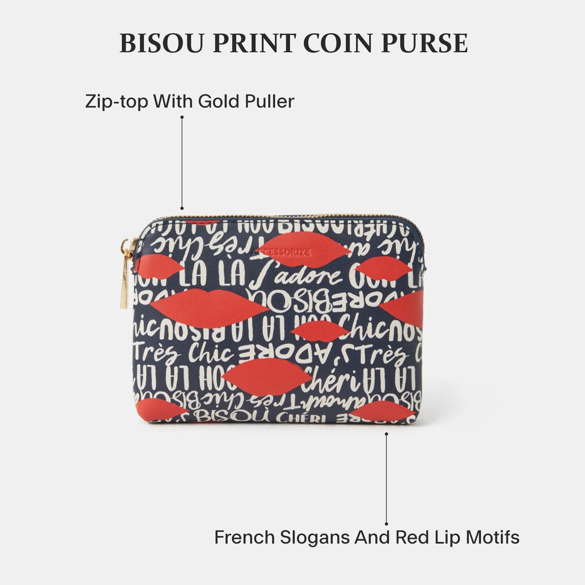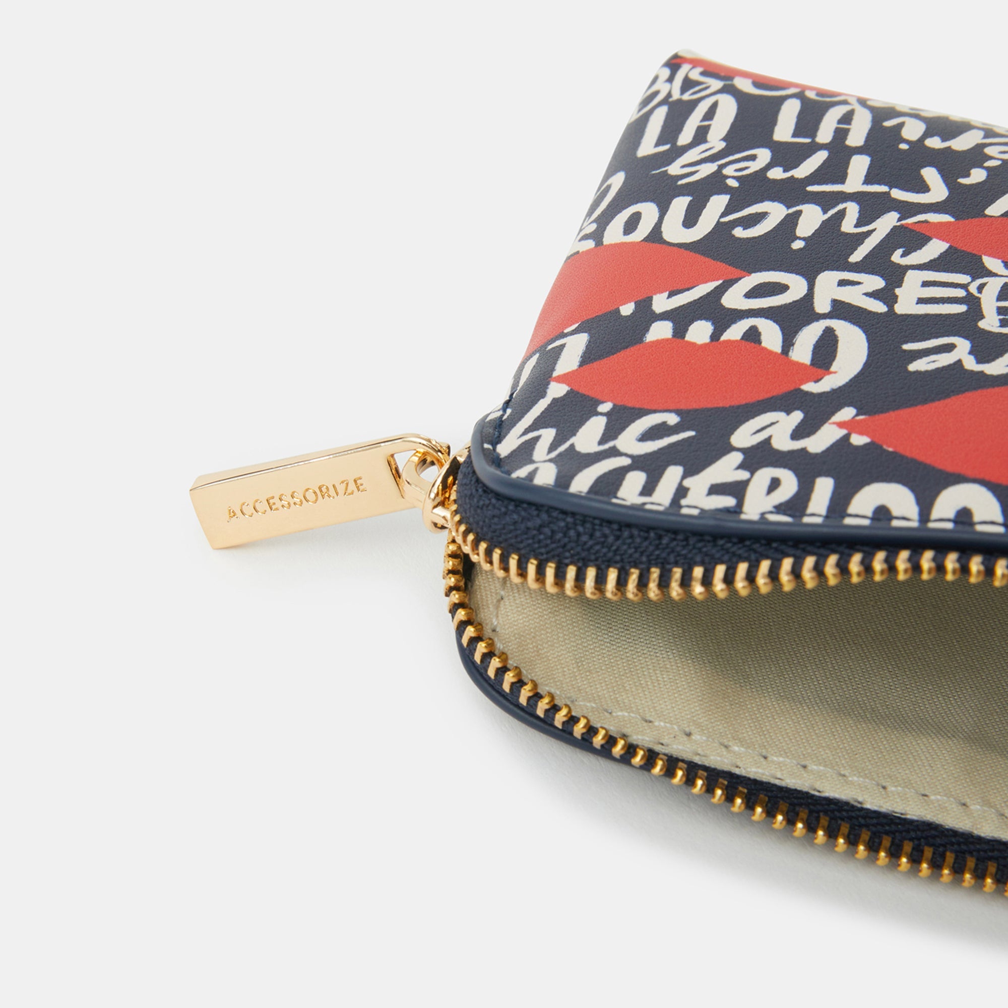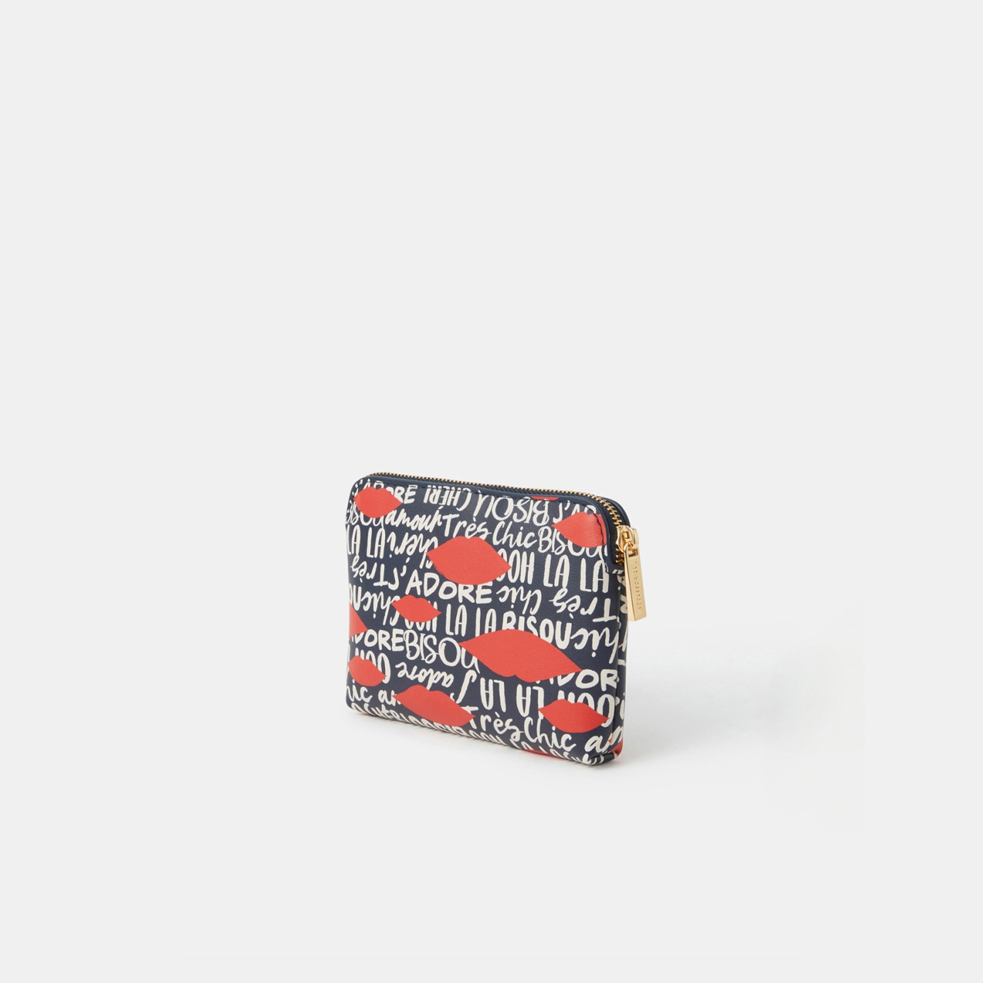 Perfect for storing loose change and small trinkets in your tote, this coin purse is printed with French slogans and red lip motifs. Ooh la la.