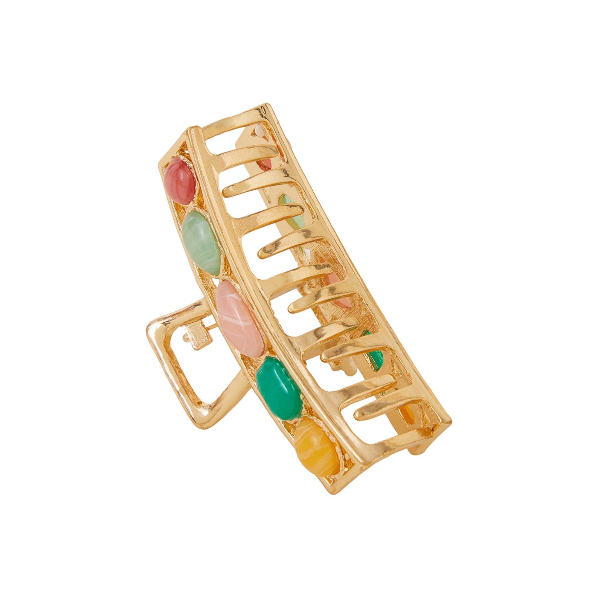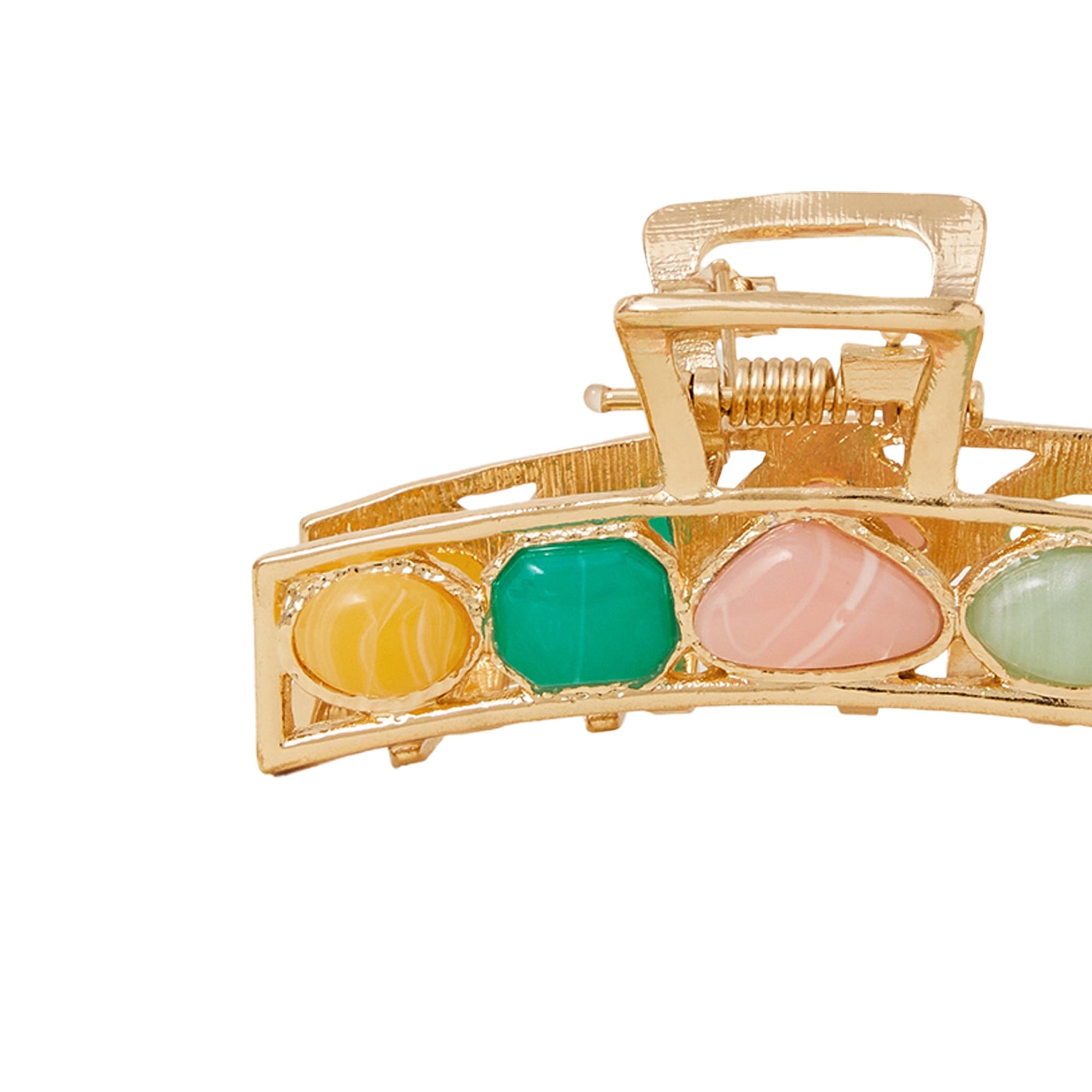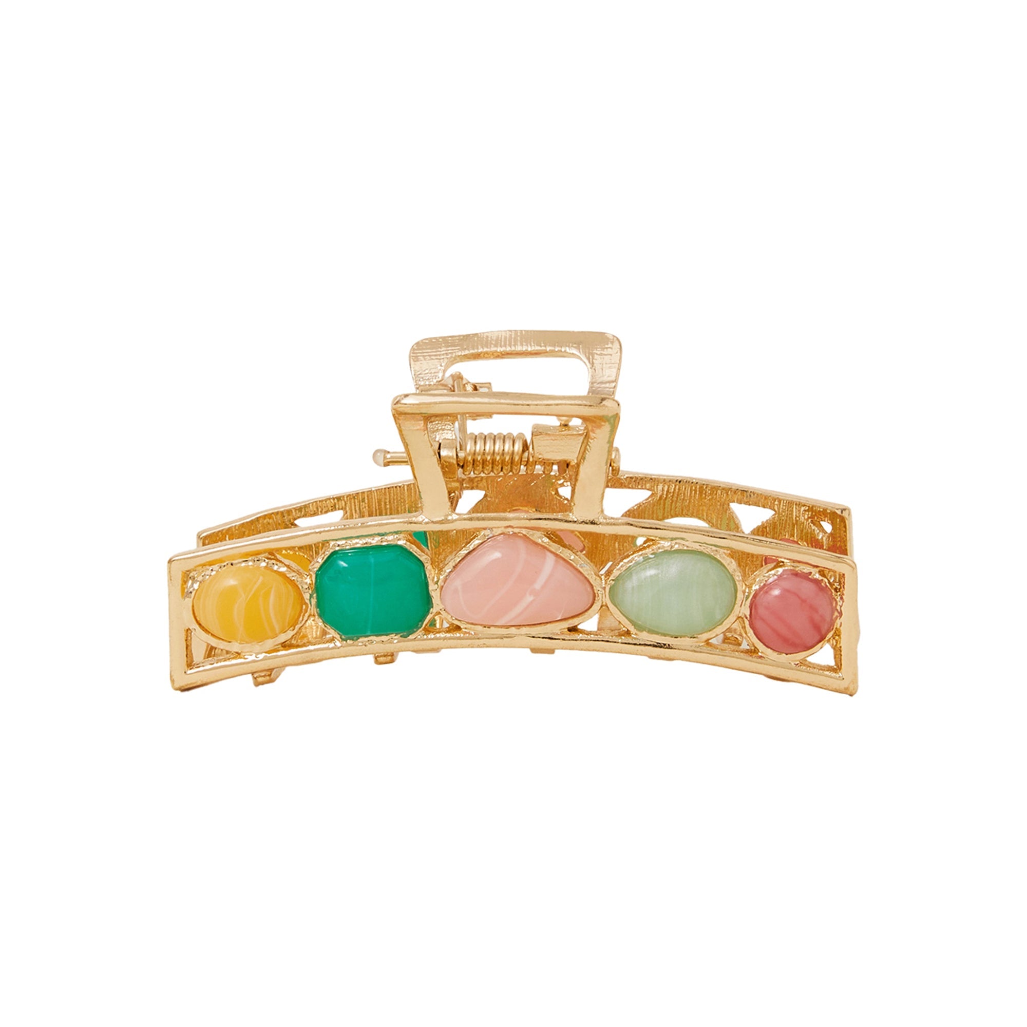 Embellished with green and pink gems that are destined to sparkle in the hair, this claw clip elevates any quick evening updo