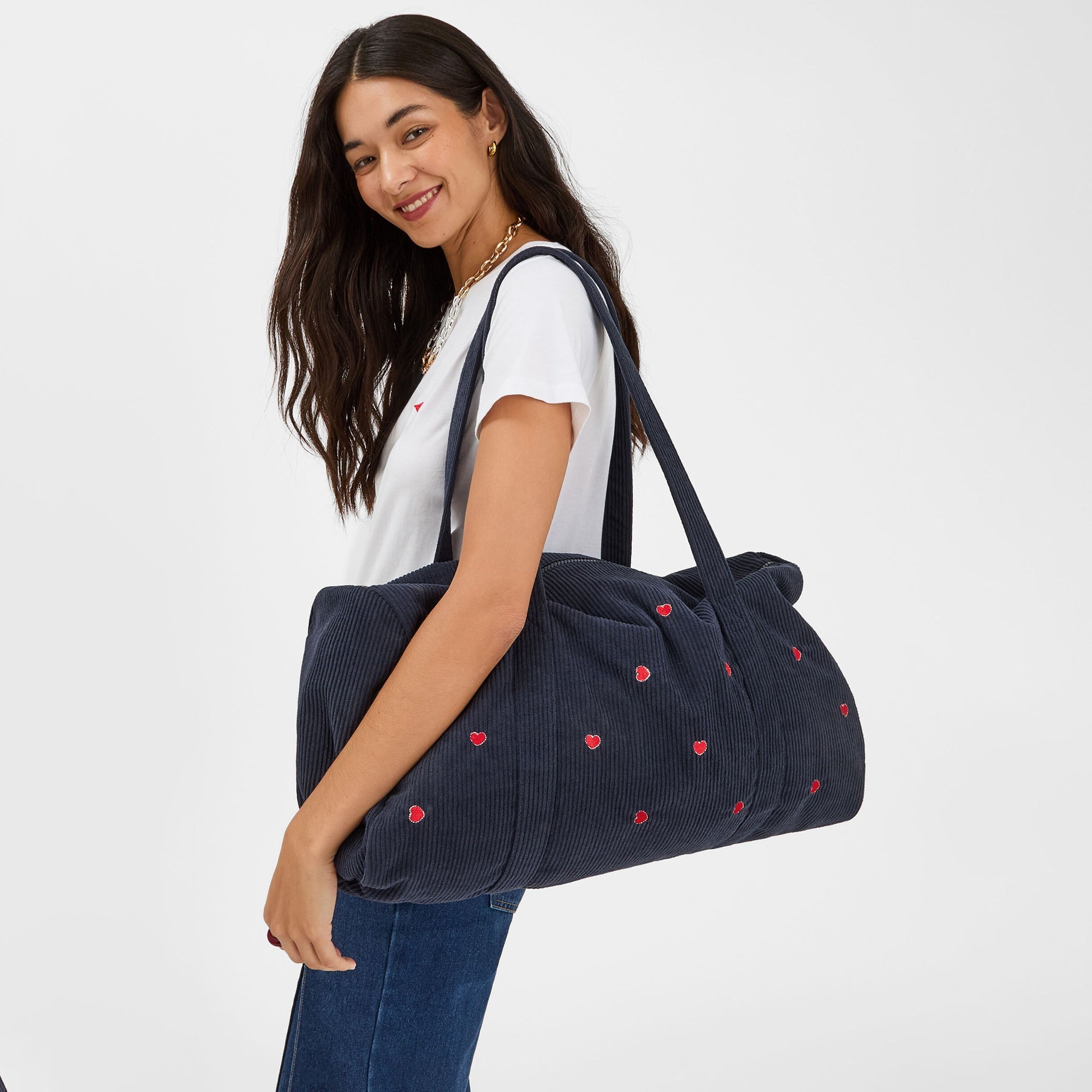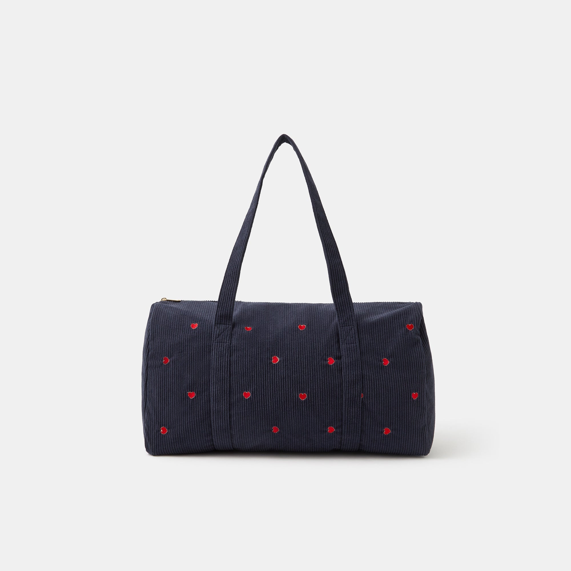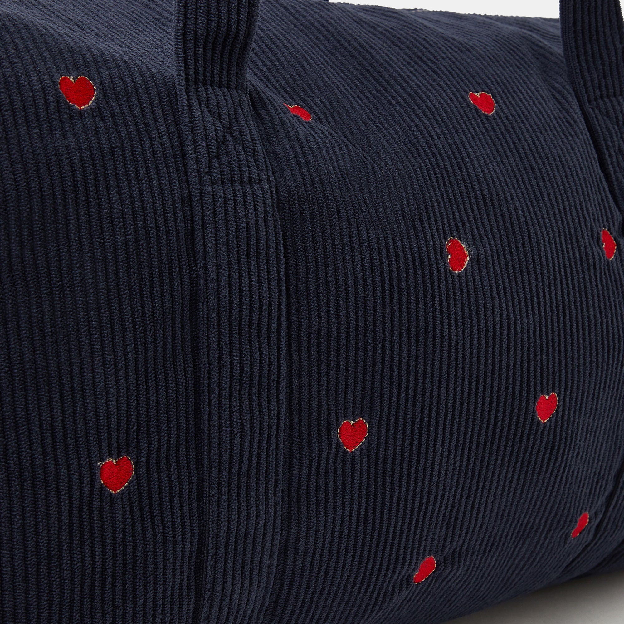 Going somewhere? Perfect for sleepovers or weekends away, this duffle bag is made from soft corduroy with teeny tiny hearts embroidered all-over. Features two shoulder straps, a main zip compartment and small zip pocket inside.