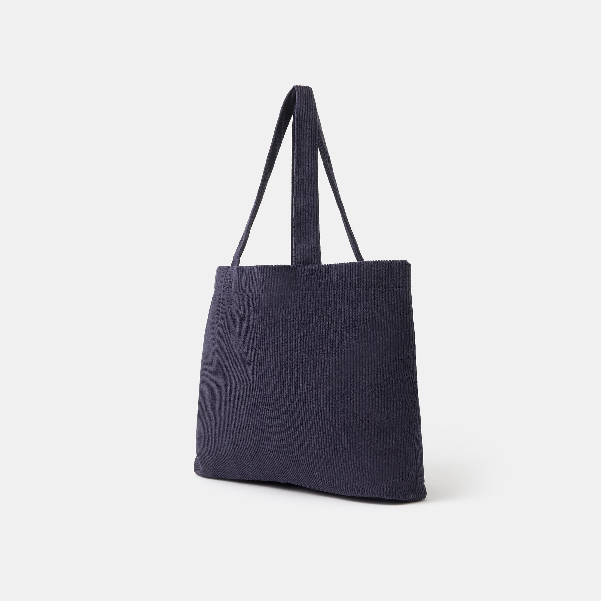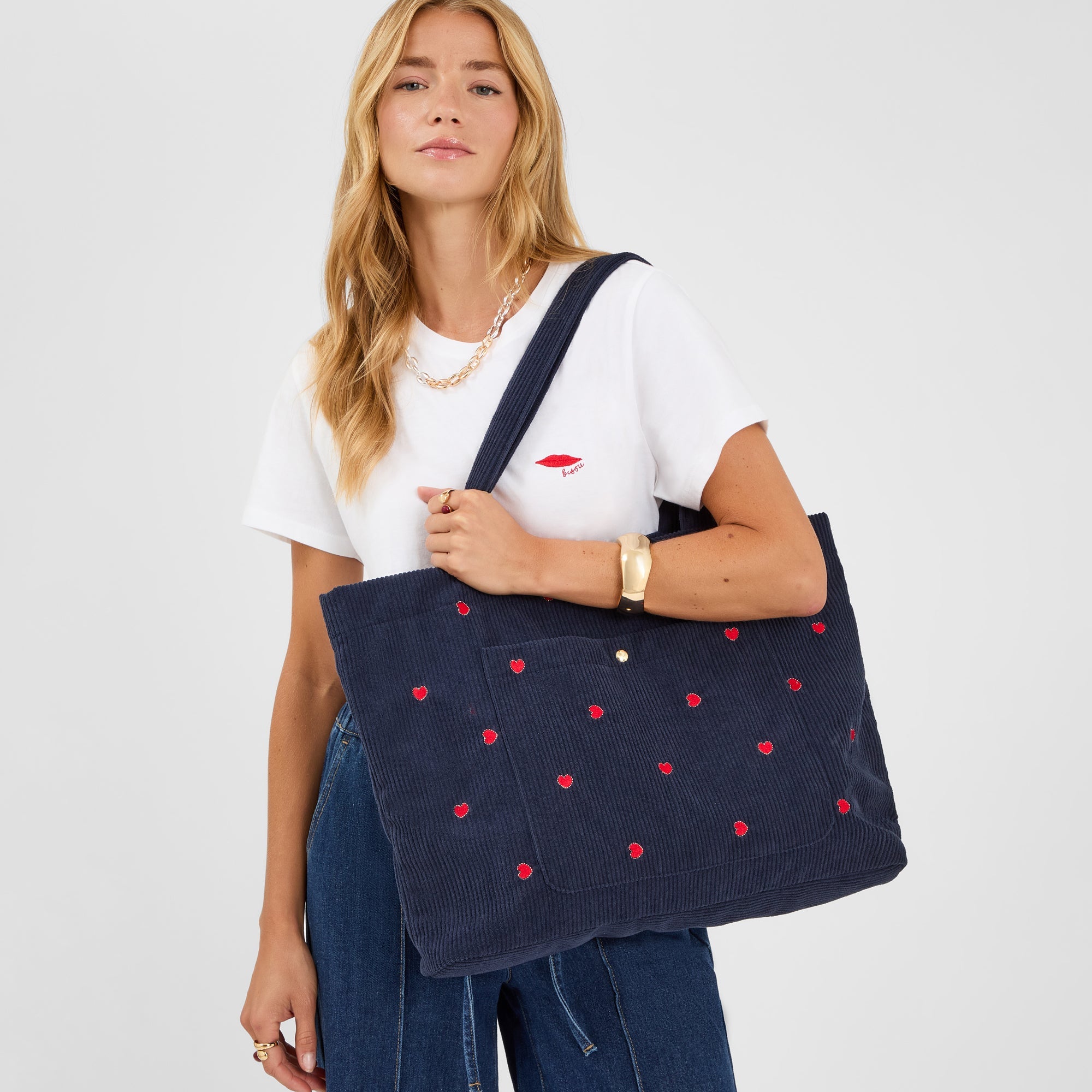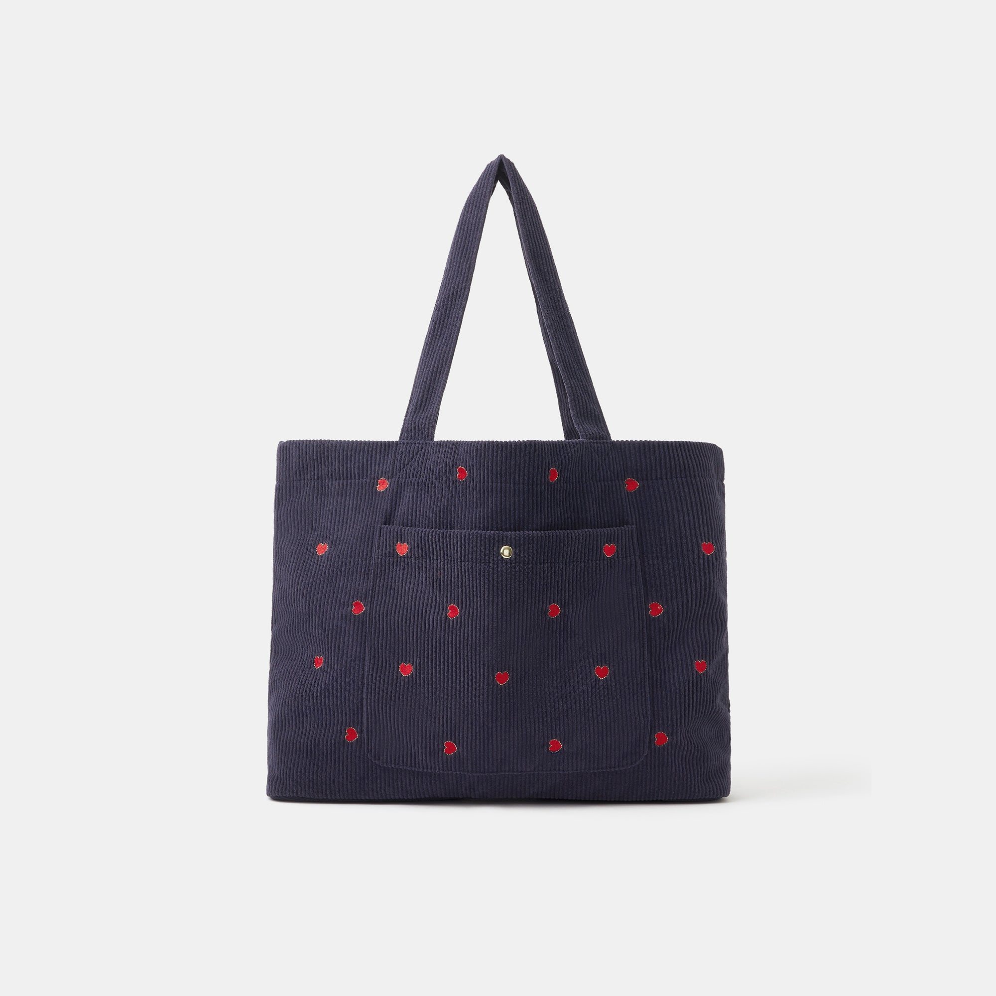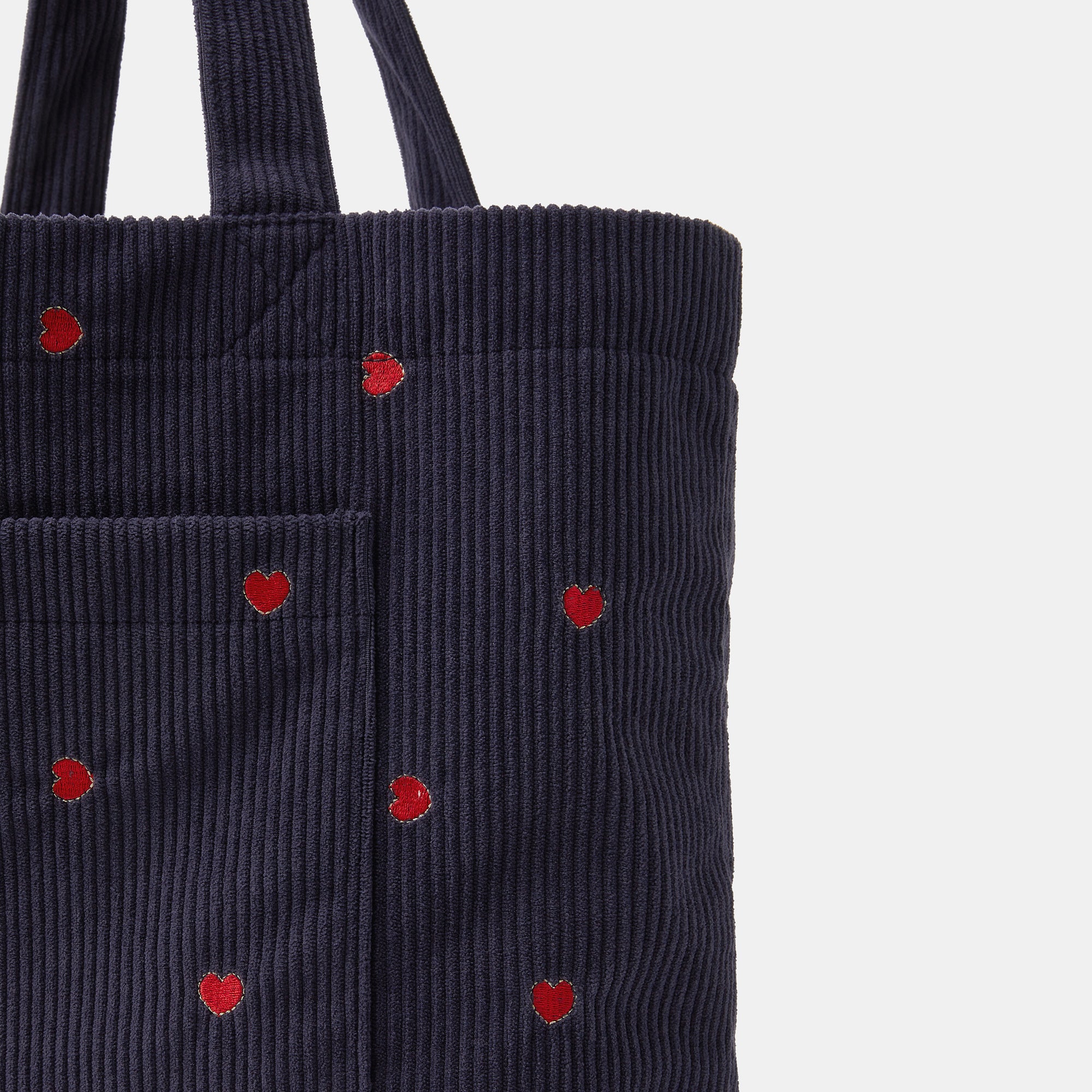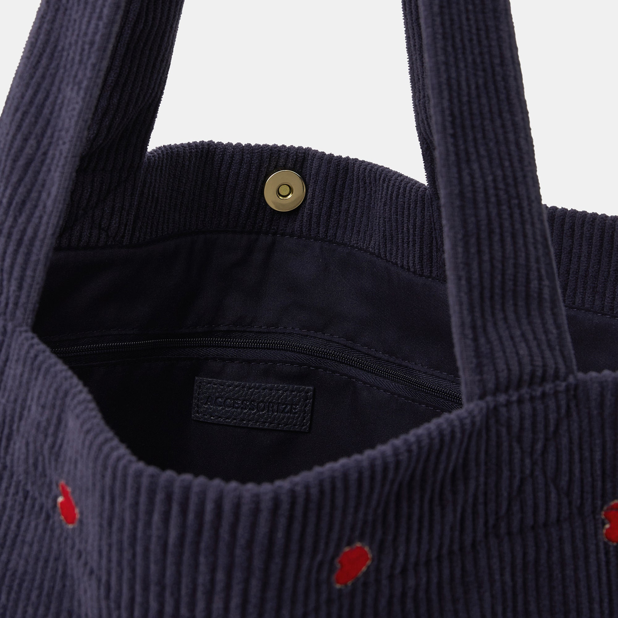 A little love goes a long way.. Made from soft corduroy, this shopper bag is dotted with red love heart embroidery. Features two shoulder straps, a magnetic button closure, front slip pocket and small zip pocket inside.