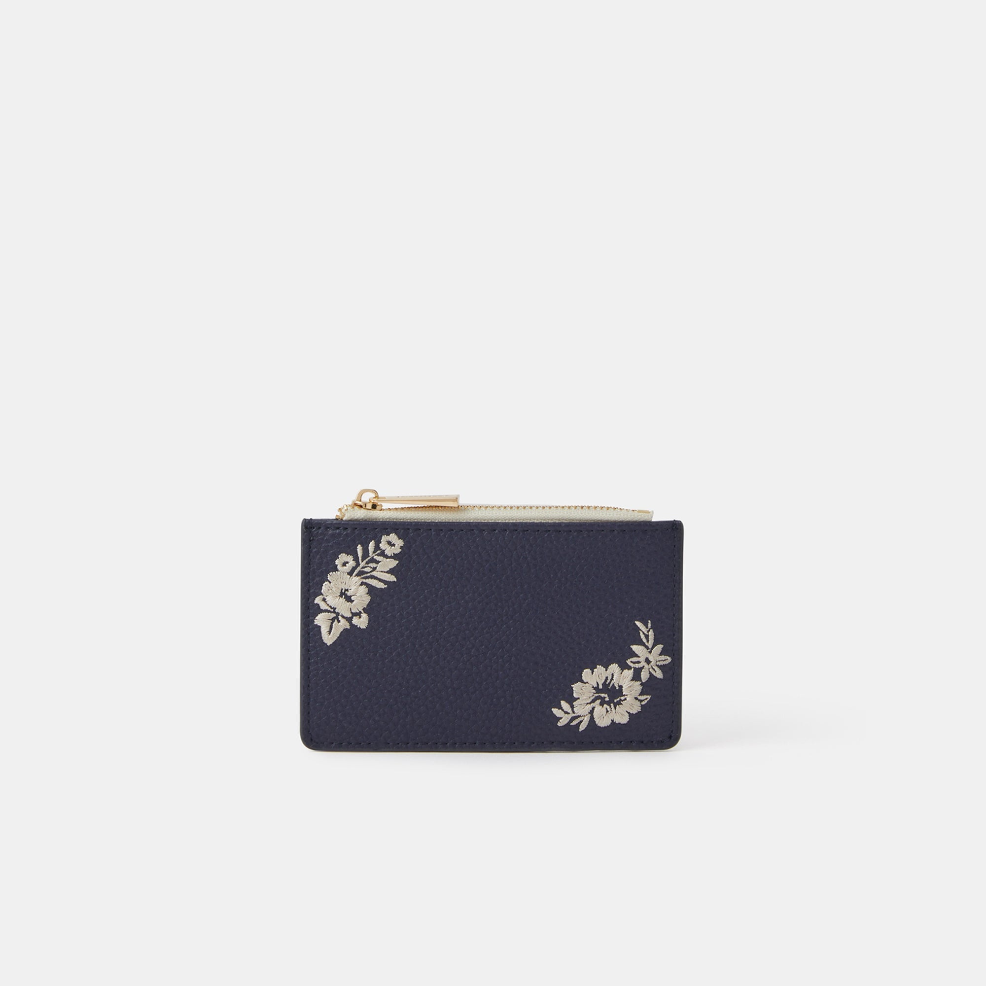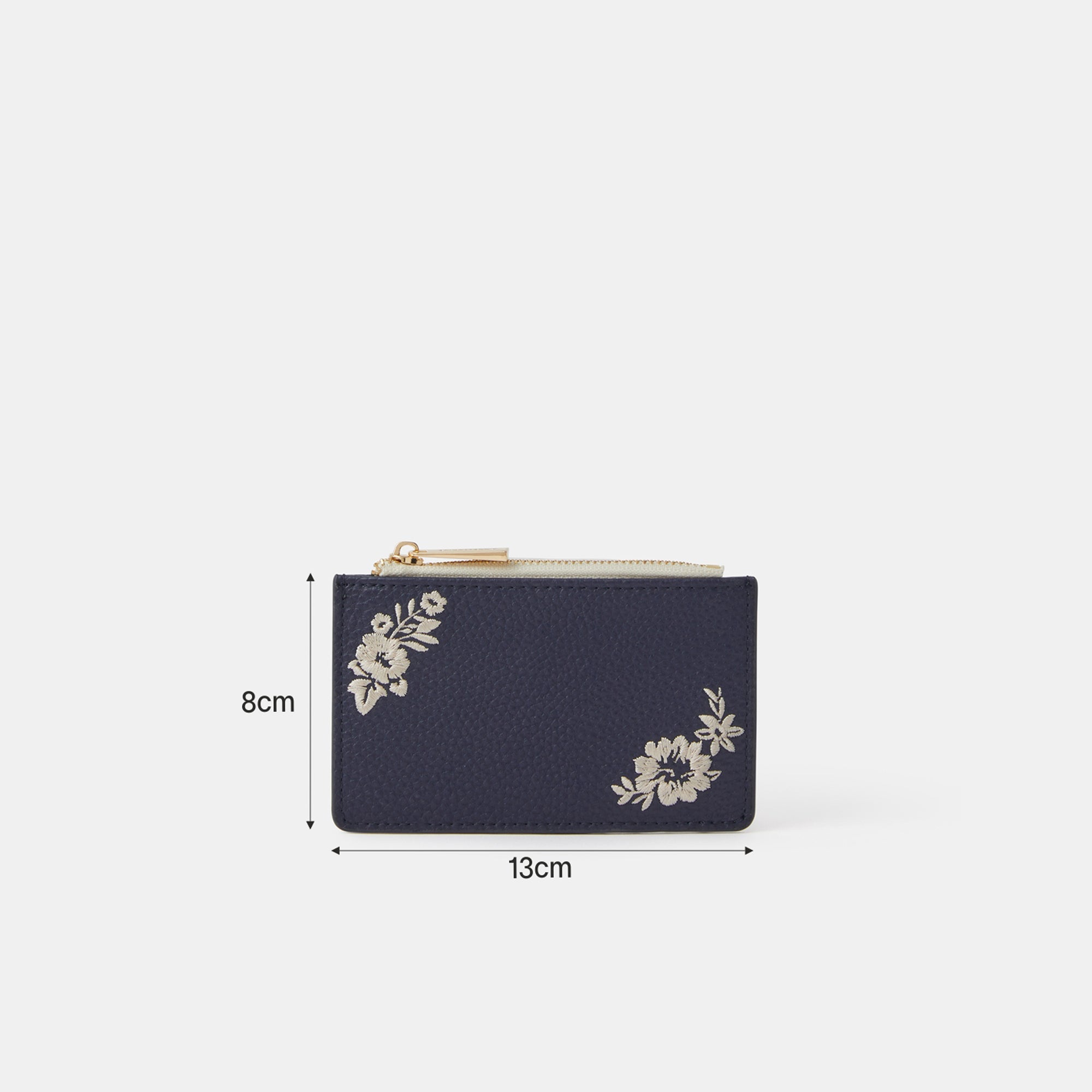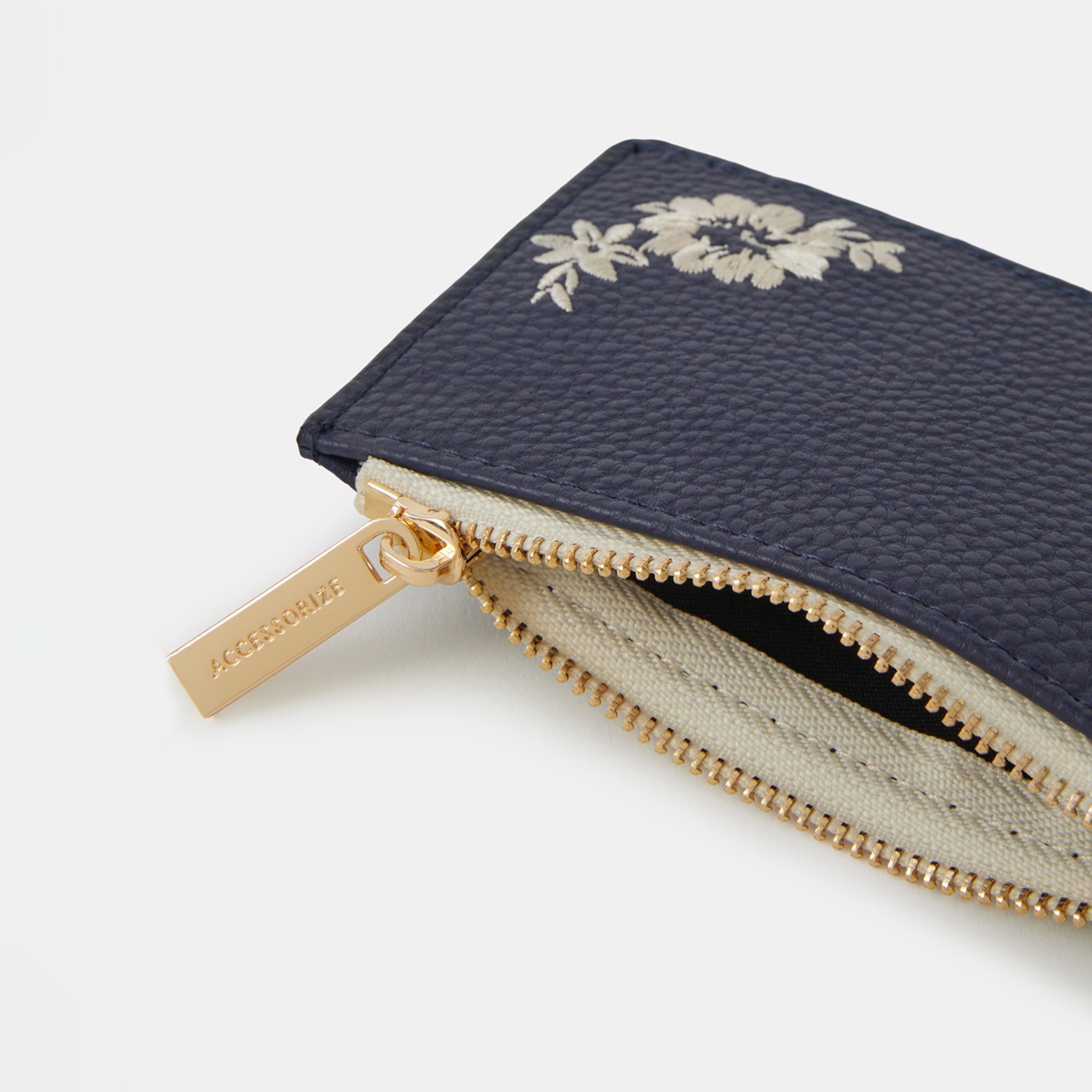 Cute and compact, this card holder is perfectly sized to fit in any of your bags. Embroidered with florals, it features a zip compartment for coins and four card slots to the back.