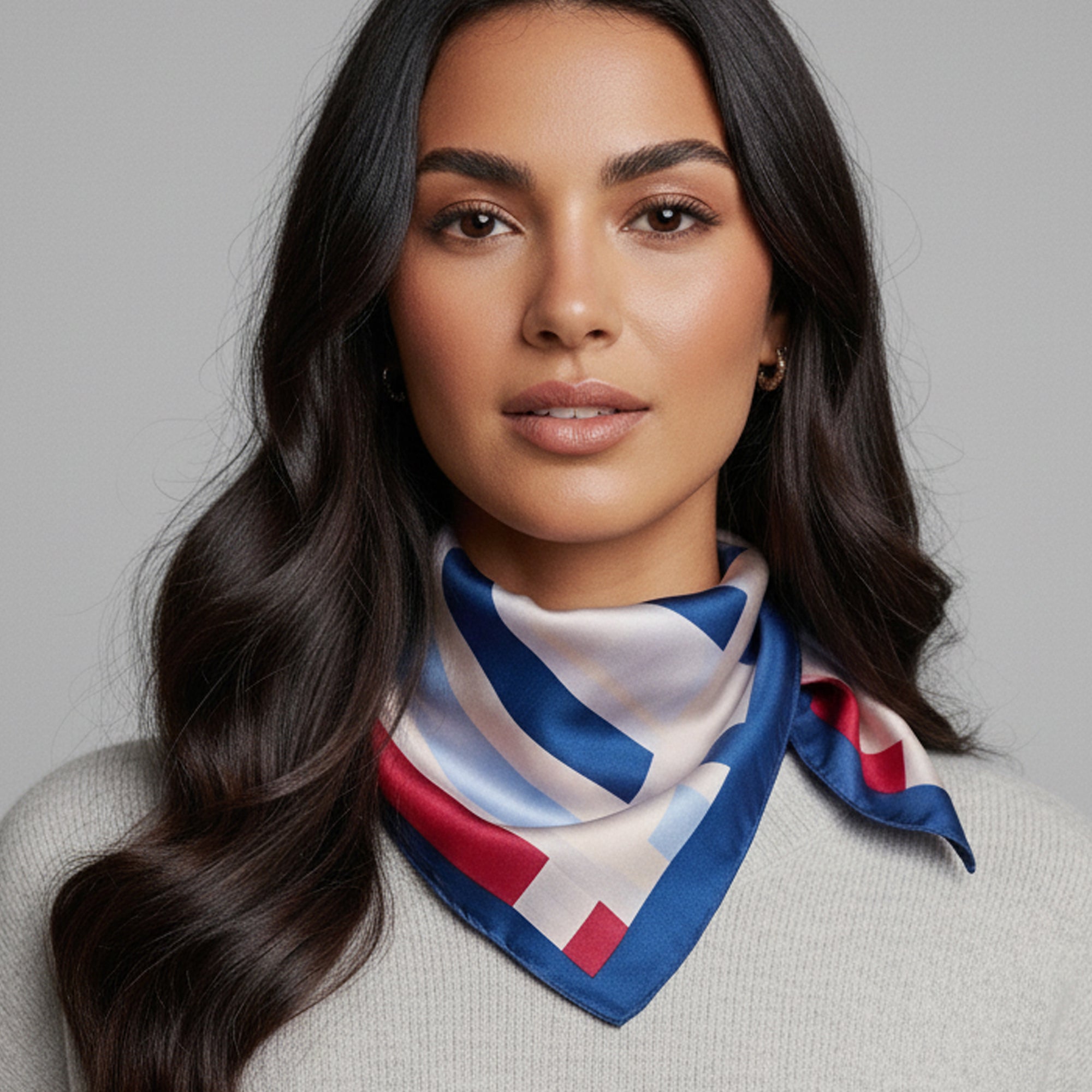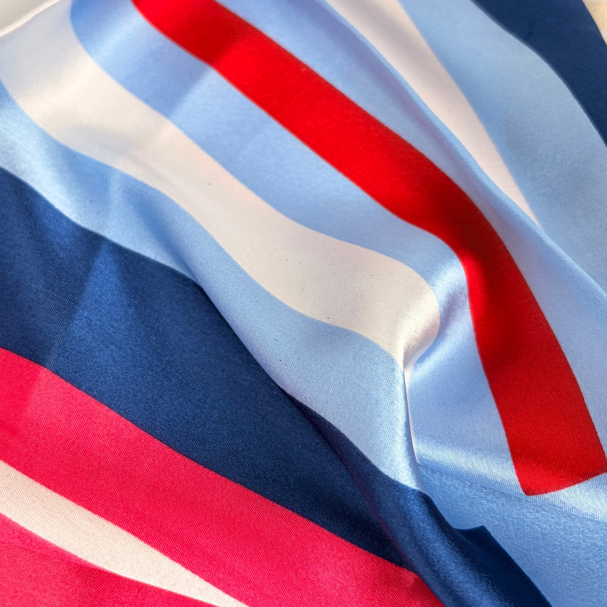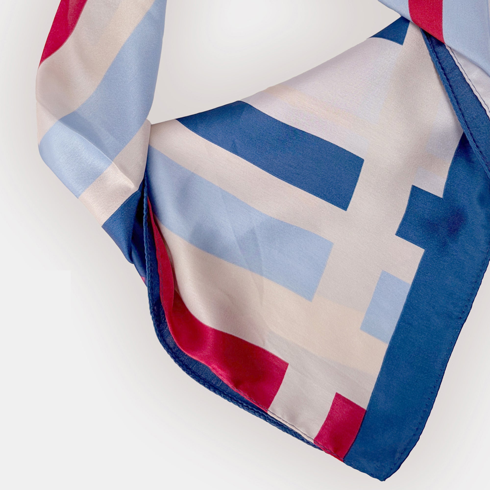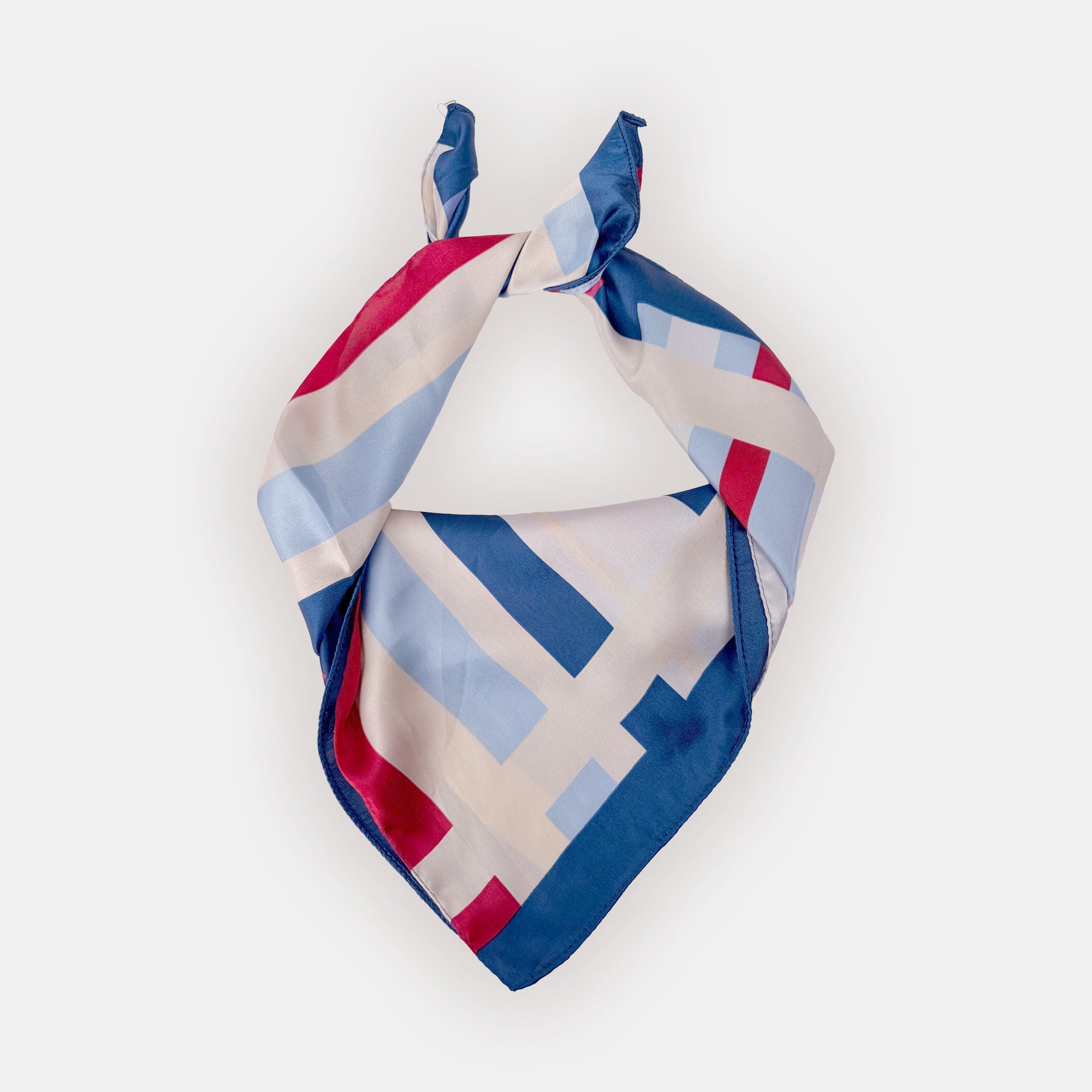 This vibrant, square Nova Lightweight Scarf features a striking modern geometric pattern in bold nautical colors of navy, sky blue, white, and fuchsia. The smooth, satiny fabric is perfect for tying around your neck, wrist, or bag handle to add a chic pop of color.