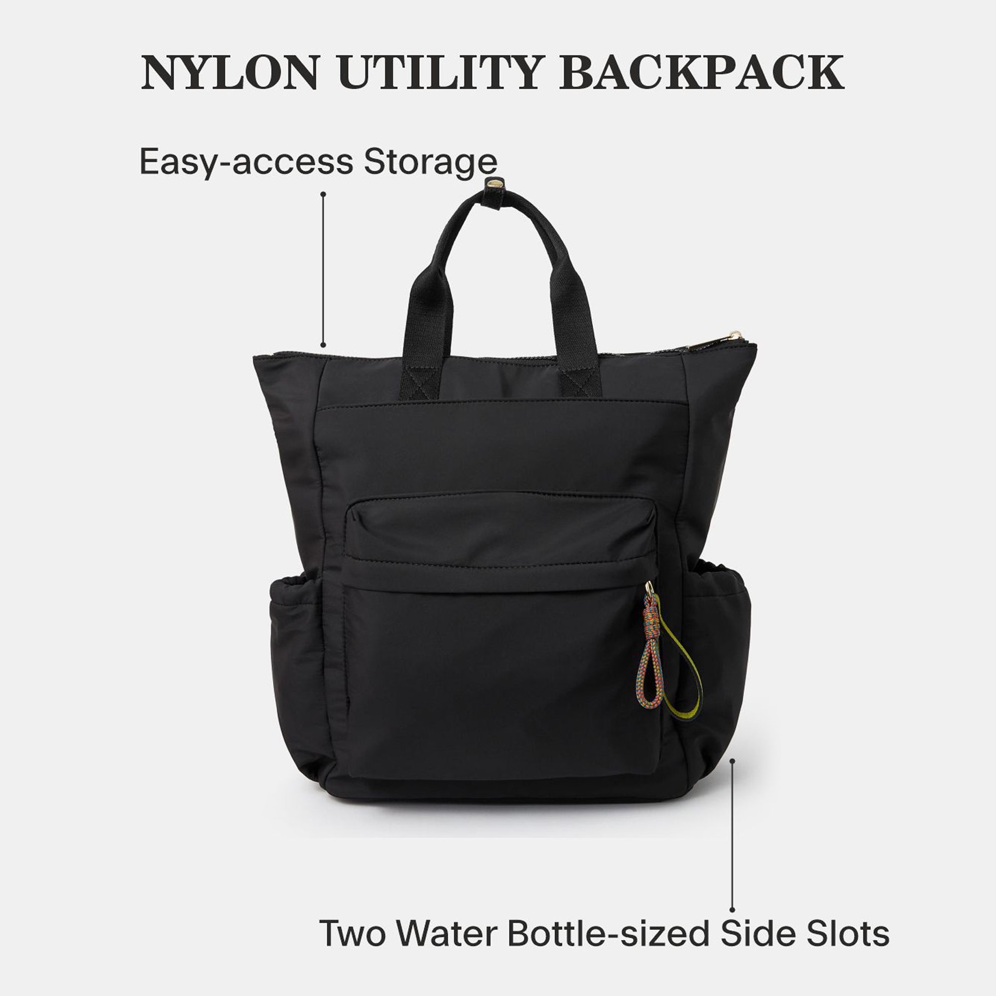 The perfect accessory for every type of commuter. Made from sturdy nylon, this backpack is designed with a main zip compartment, two water bottle-sized side slots, a front zip pocket and top handles for the option to carry by hand.