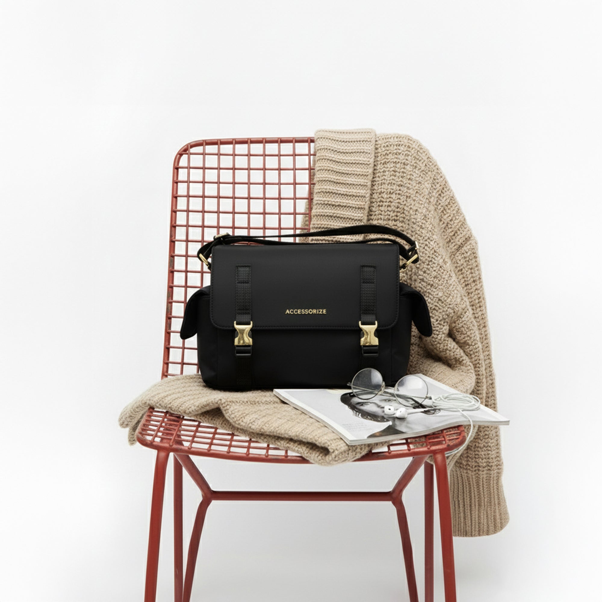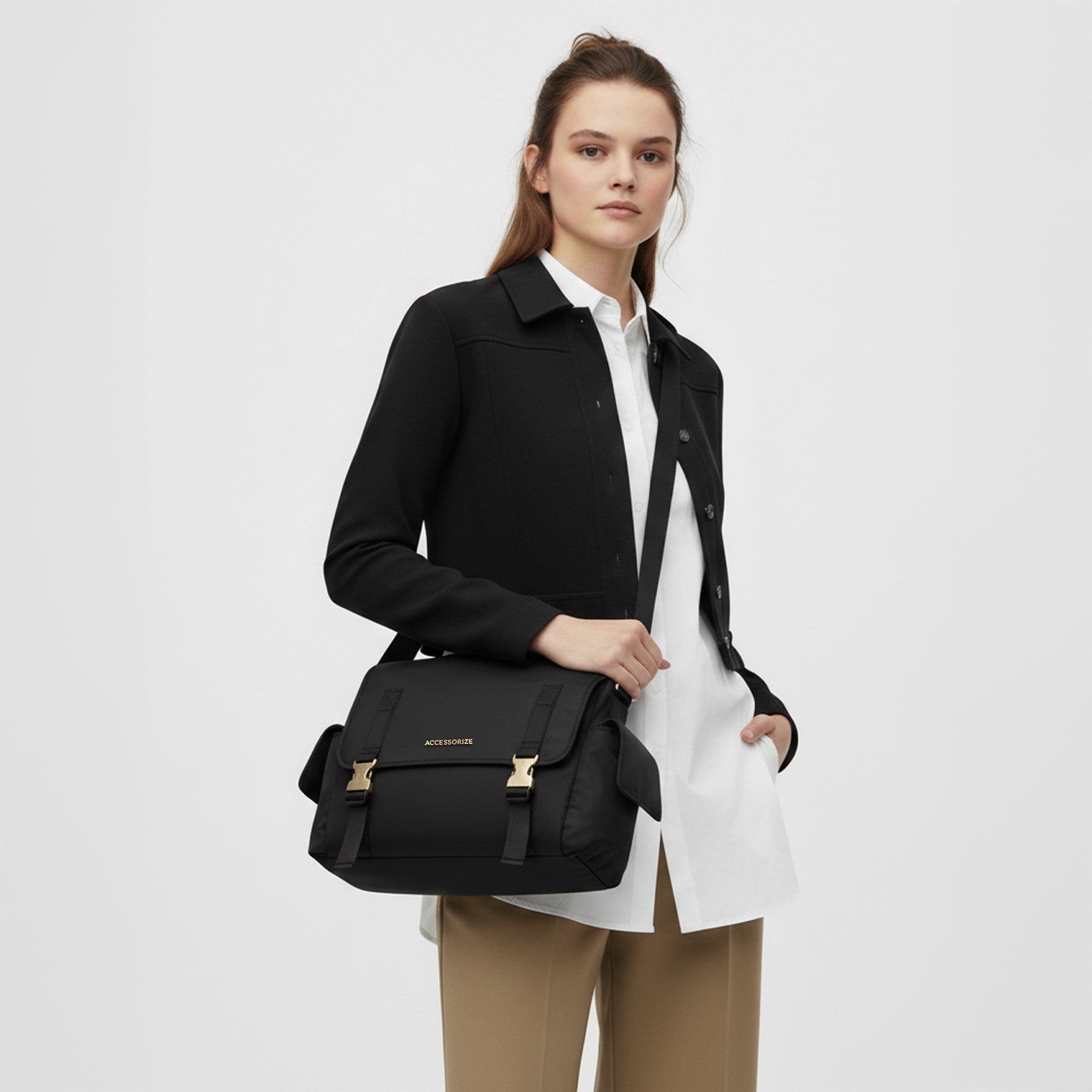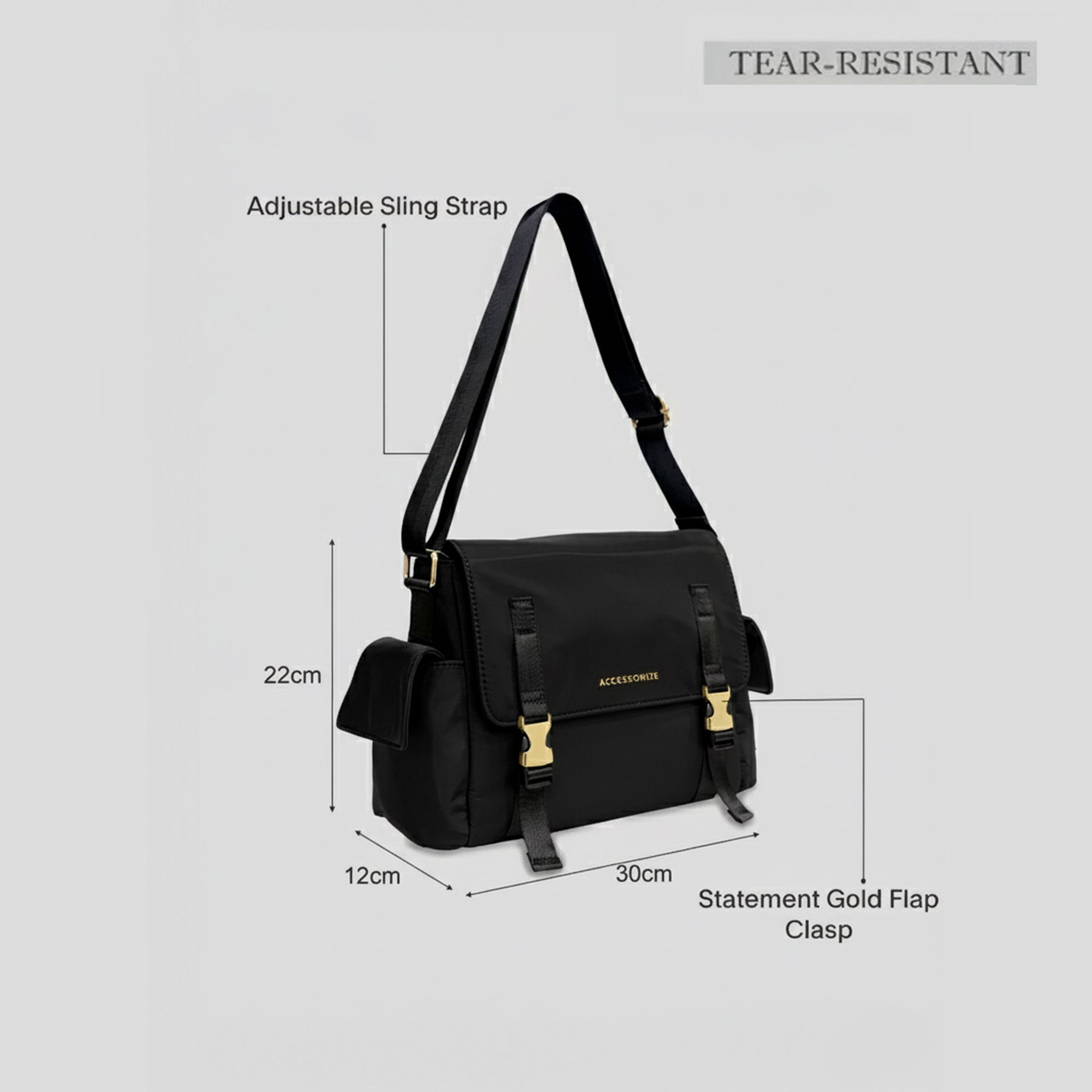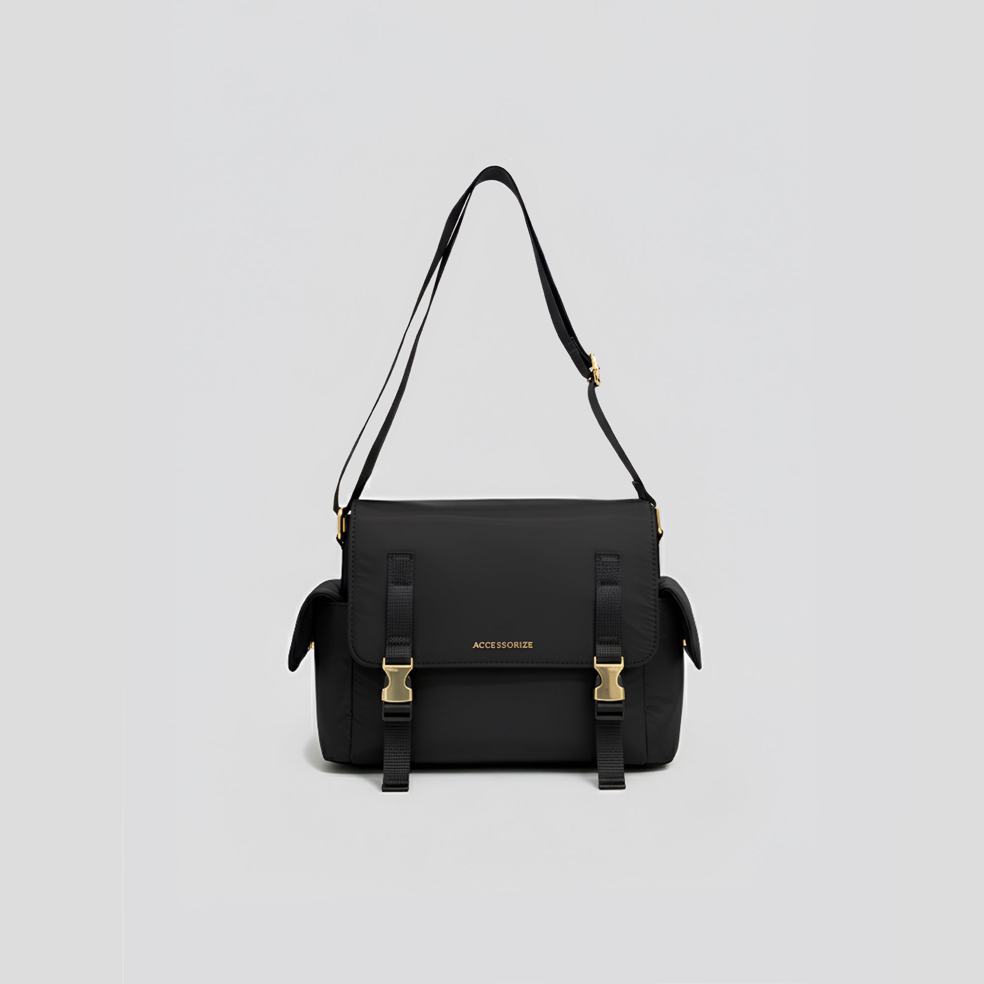 Embrace the utility trend with this stylish and rugged Messenger Crossbody Bag. Crafted from durable, lightweight Black, this bag is designed for both function and fashion. It features a bold flap closure secured by two eye-catching statement gold-tone buckles and military-inspired webbing straps. The unique side flap pockets offer extra storage and a distinct silhouette. Complete with a wide, comfortable black webbing sling strap for hands-free wear, this messenger bag is the perfect accessory to inject an adventurous, utilitarian edge into your everyday look.