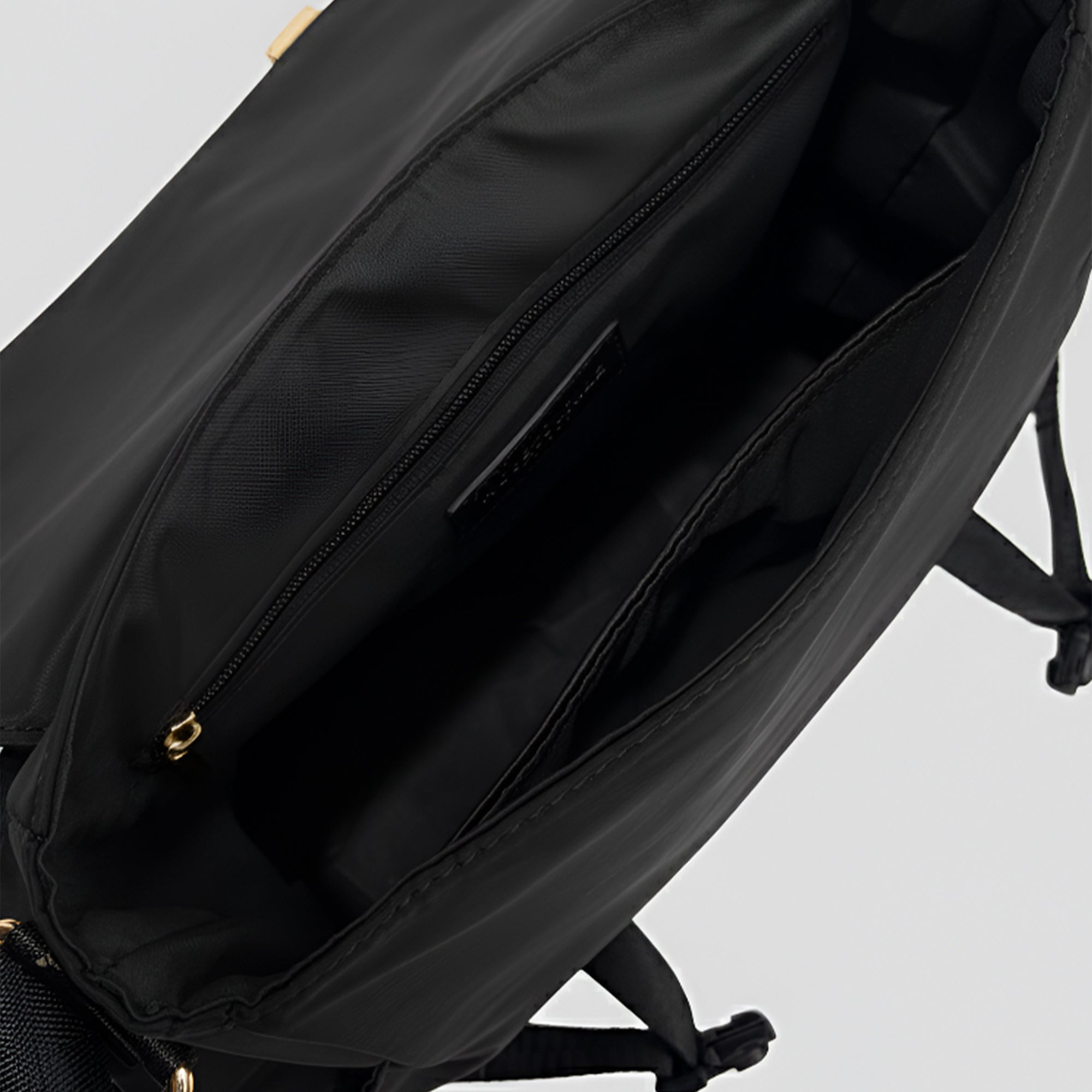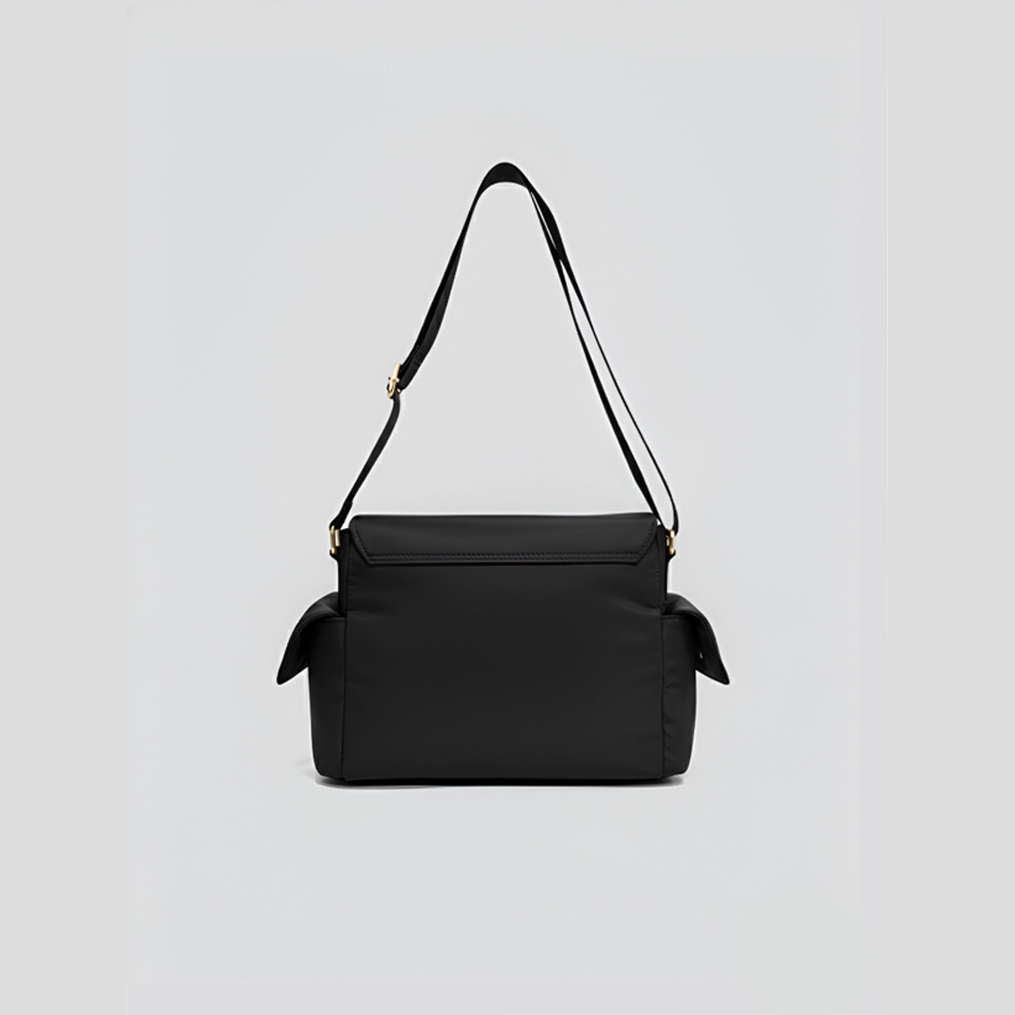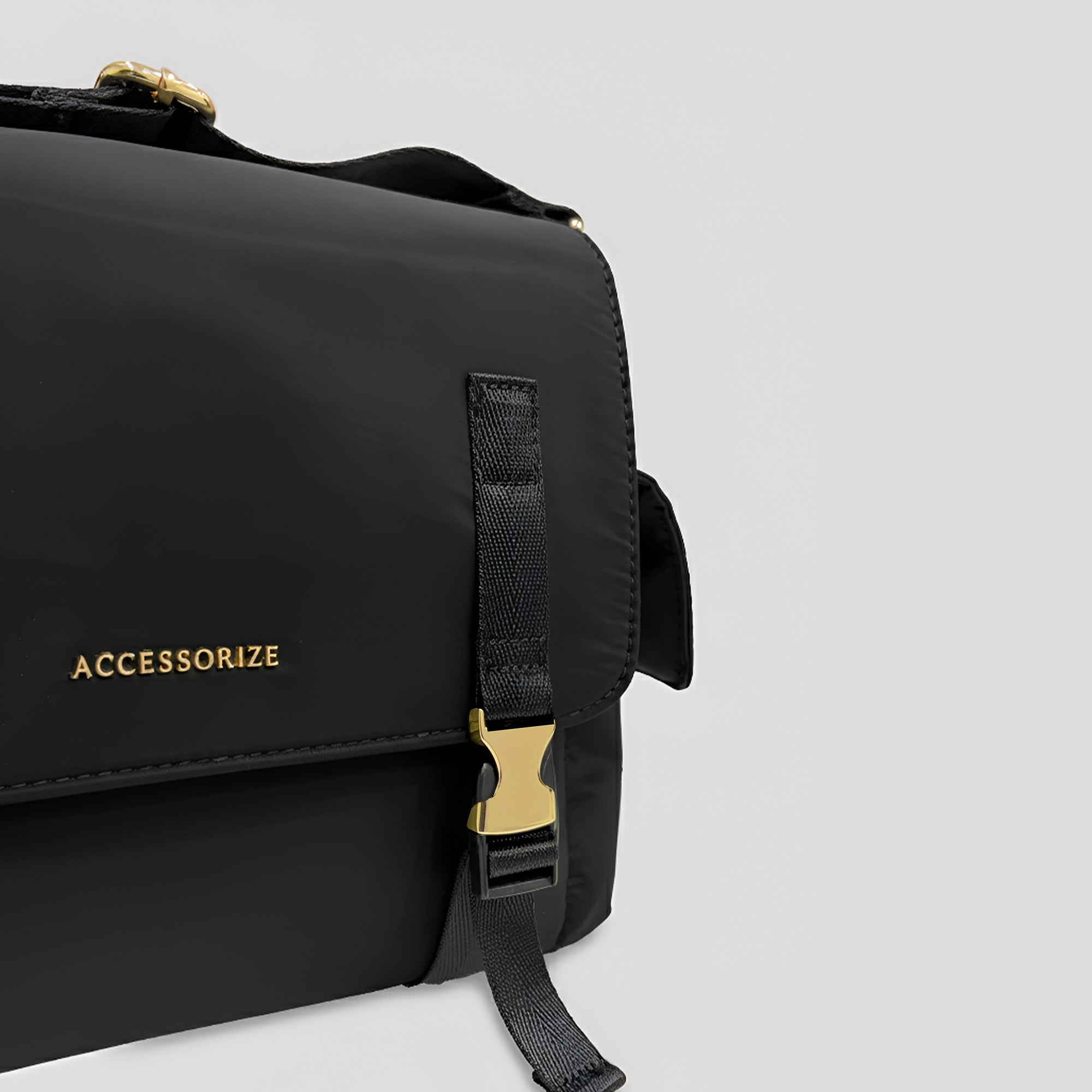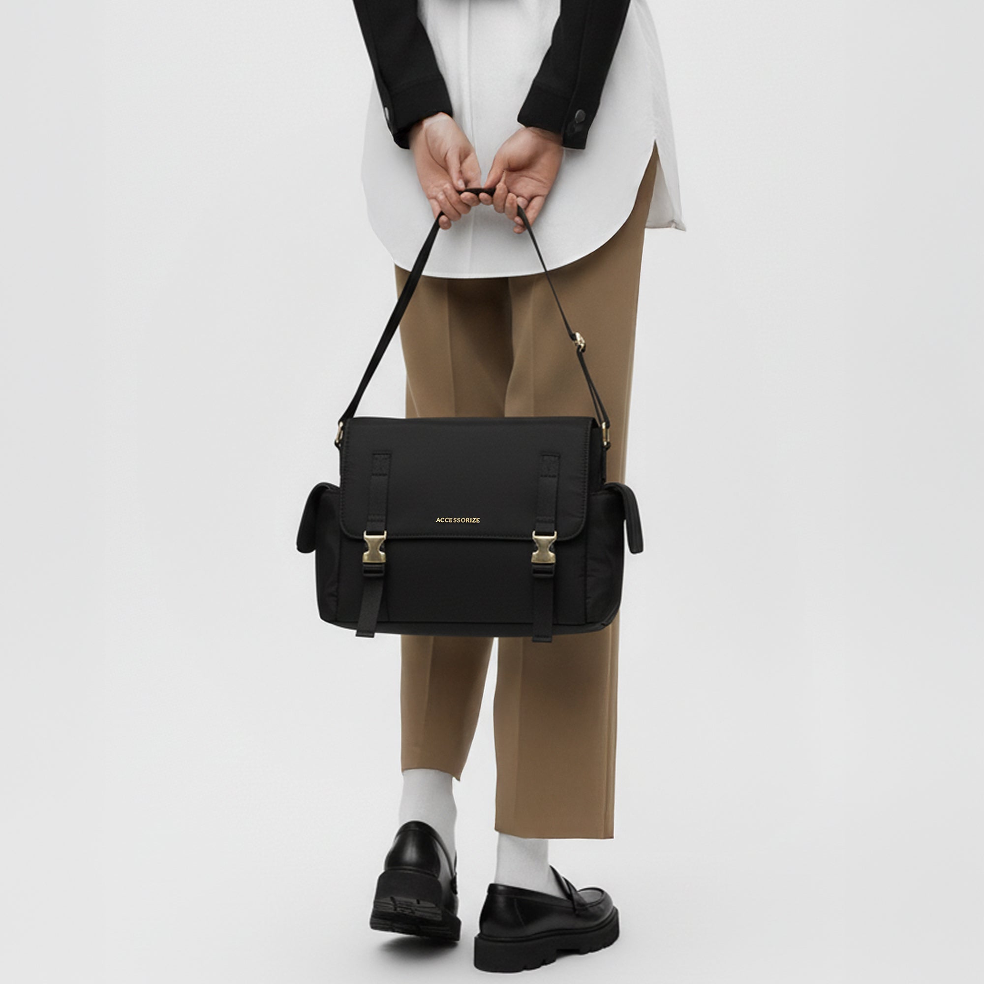 Embrace the utility trend with this stylish and rugged Messenger Crossbody Bag. Crafted from durable, lightweight Black, this bag is designed for both function and fashion. It features a bold flap closure secured by two eye-catching statement gold-tone buckles and military-inspired webbing straps. The unique side flap pockets offer extra storage and a distinct silhouette. Complete with a wide, comfortable black webbing sling strap for hands-free wear, this messenger bag is the perfect accessory to inject an adventurous, utilitarian edge into your everyday look.