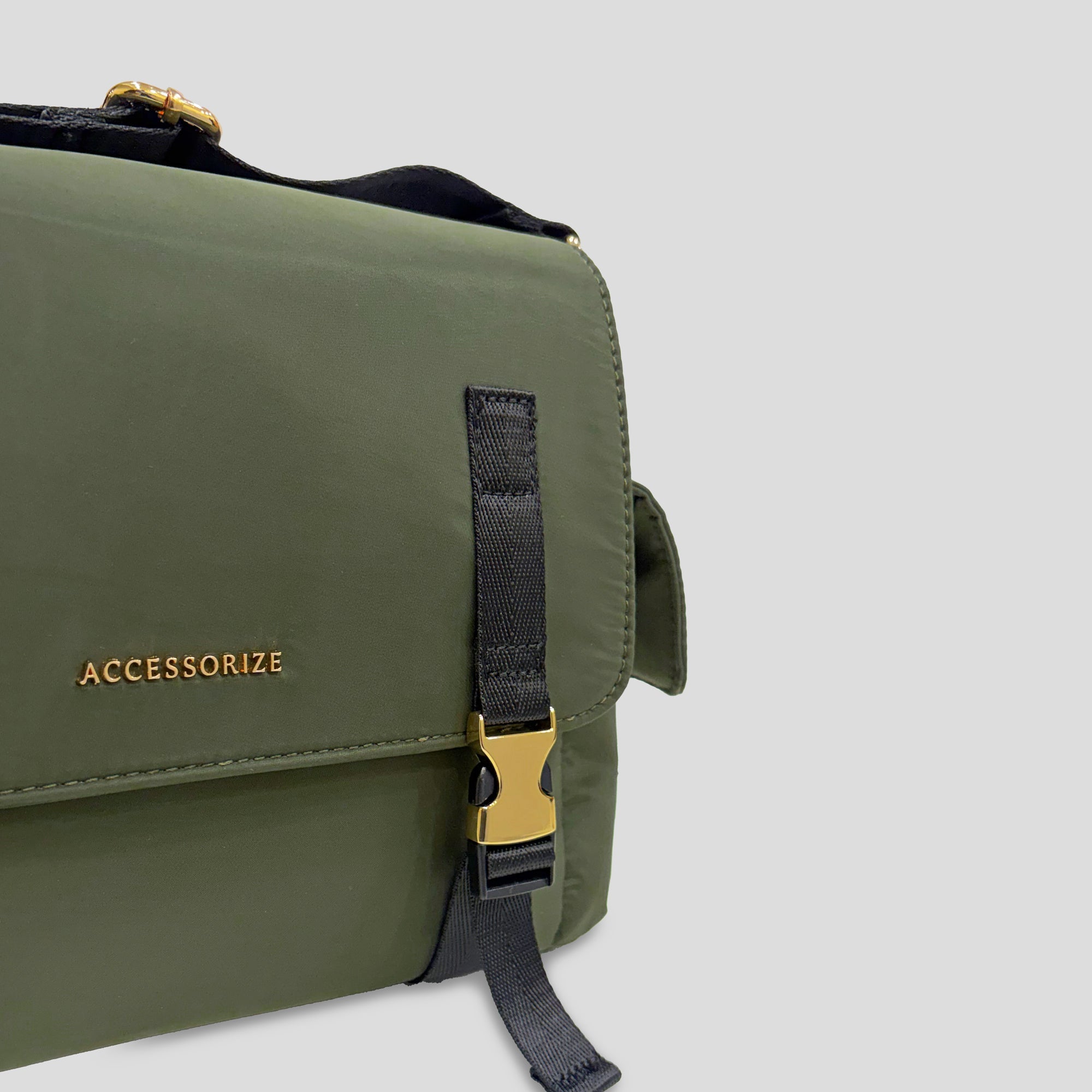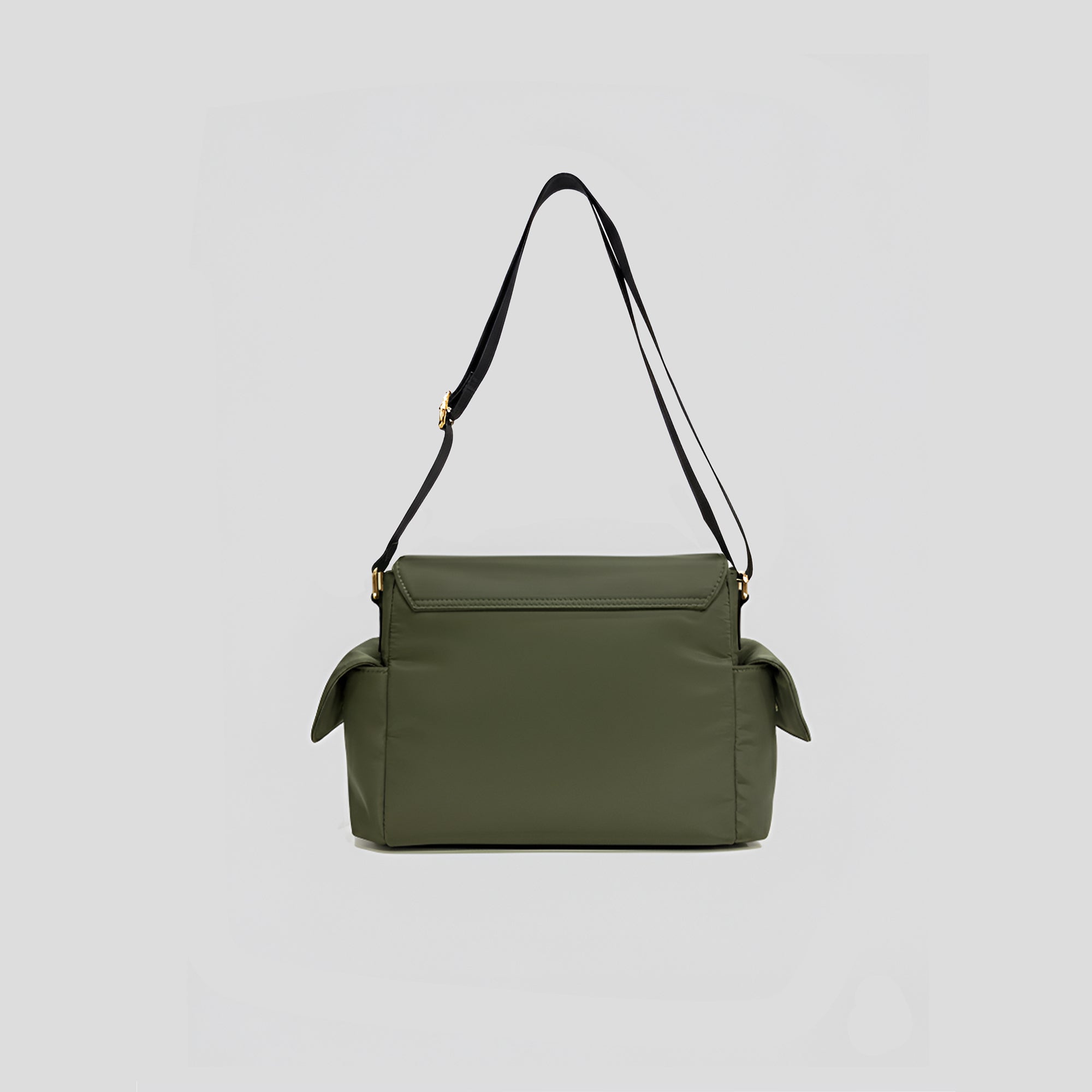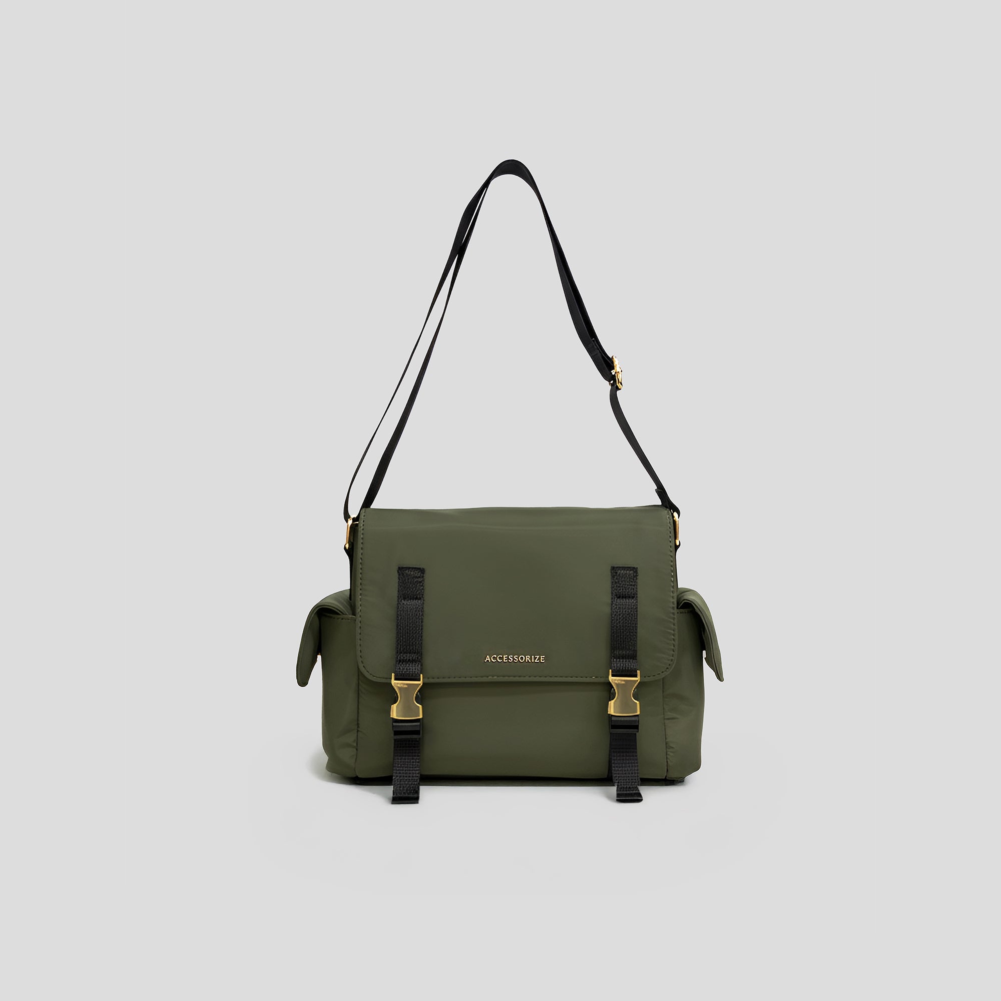 Embrace the utility trend with this stylish and rugged Messenger Crossbody Bag. Crafted from durable, lightweight Olive Green nylon, this bag is designed for both function and fashion. It features a bold flap closure secured by two eye-catching statement gold-tone buckles and military-inspired webbing straps. The unique side flap pockets offer extra storage and a distinct silhouette. Complete with a wide, comfortable black webbing sling strap for hands-free wear, this messenger bag is the perfect accessory to inject an adventurous, utilitarian edge into your everyday look.