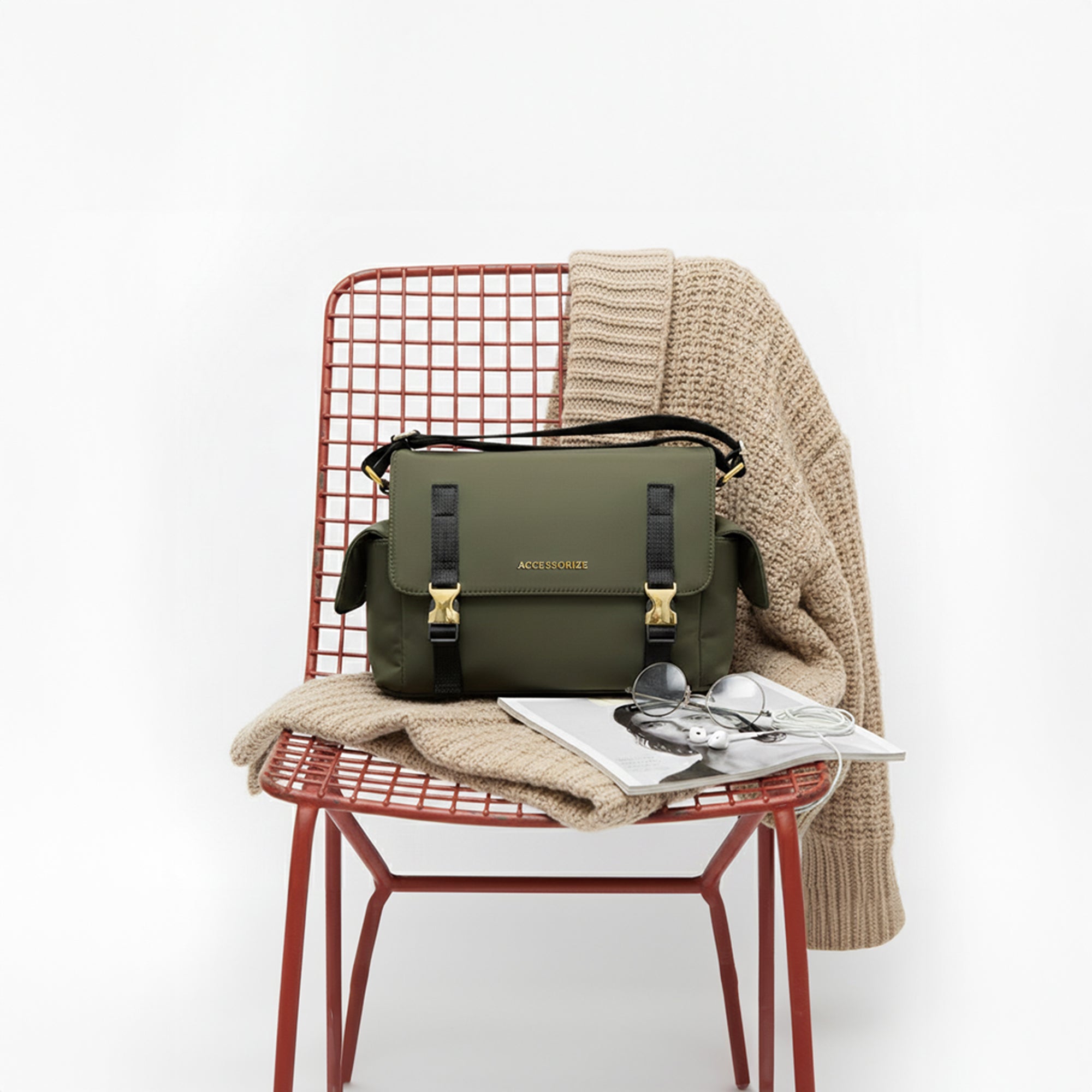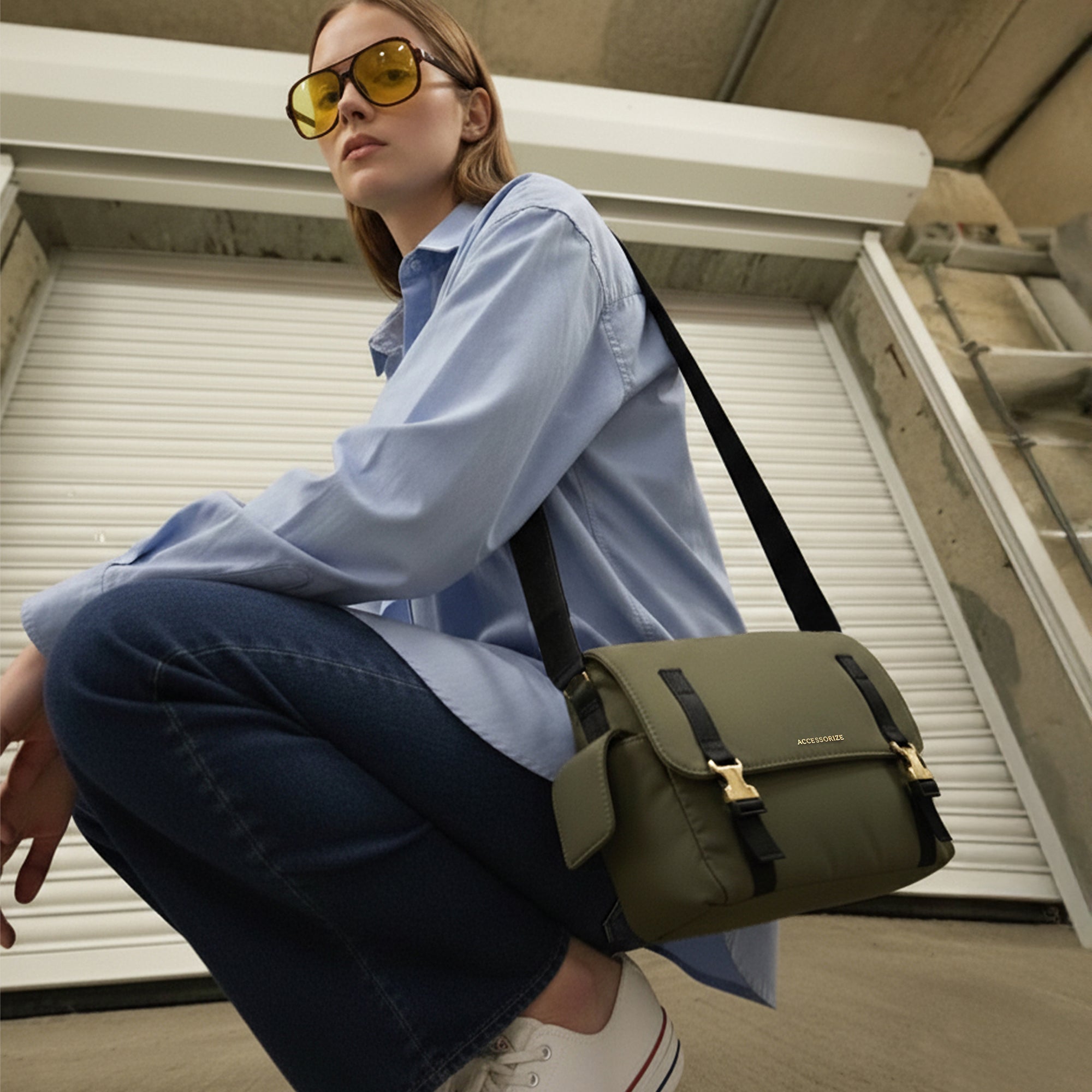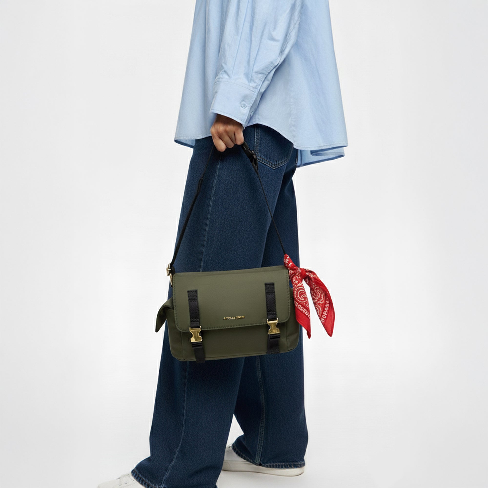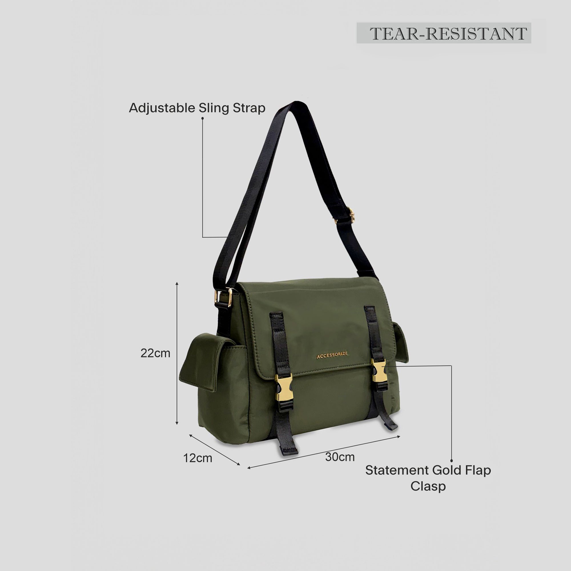 Embrace the utility trend with this stylish and rugged Messenger Crossbody Bag. Crafted from durable, lightweight Olive Green nylon, this bag is designed for both function and fashion. It features a bold flap closure secured by two eye-catching statement gold-tone buckles and military-inspired webbing straps. The unique side flap pockets offer extra storage and a distinct silhouette. Complete with a wide, comfortable black webbing sling strap for hands-free wear, this messenger bag is the perfect accessory to inject an adventurous, utilitarian edge into your everyday look.