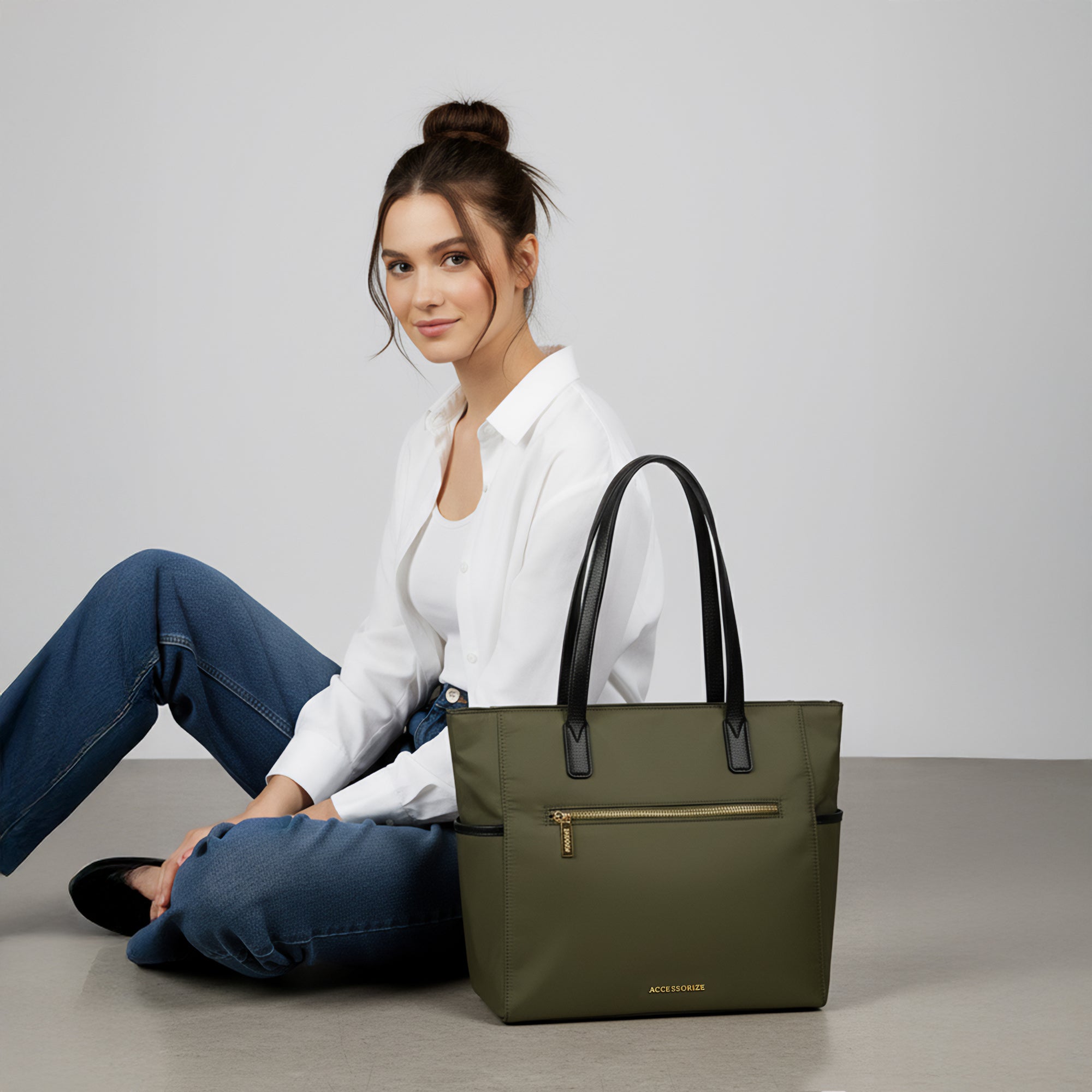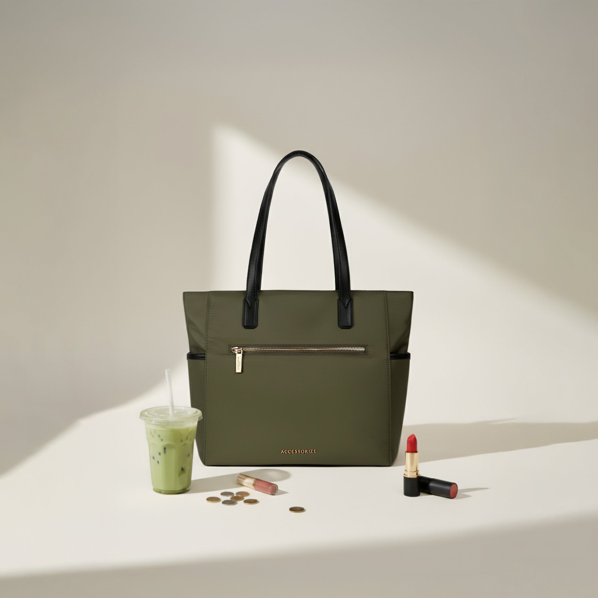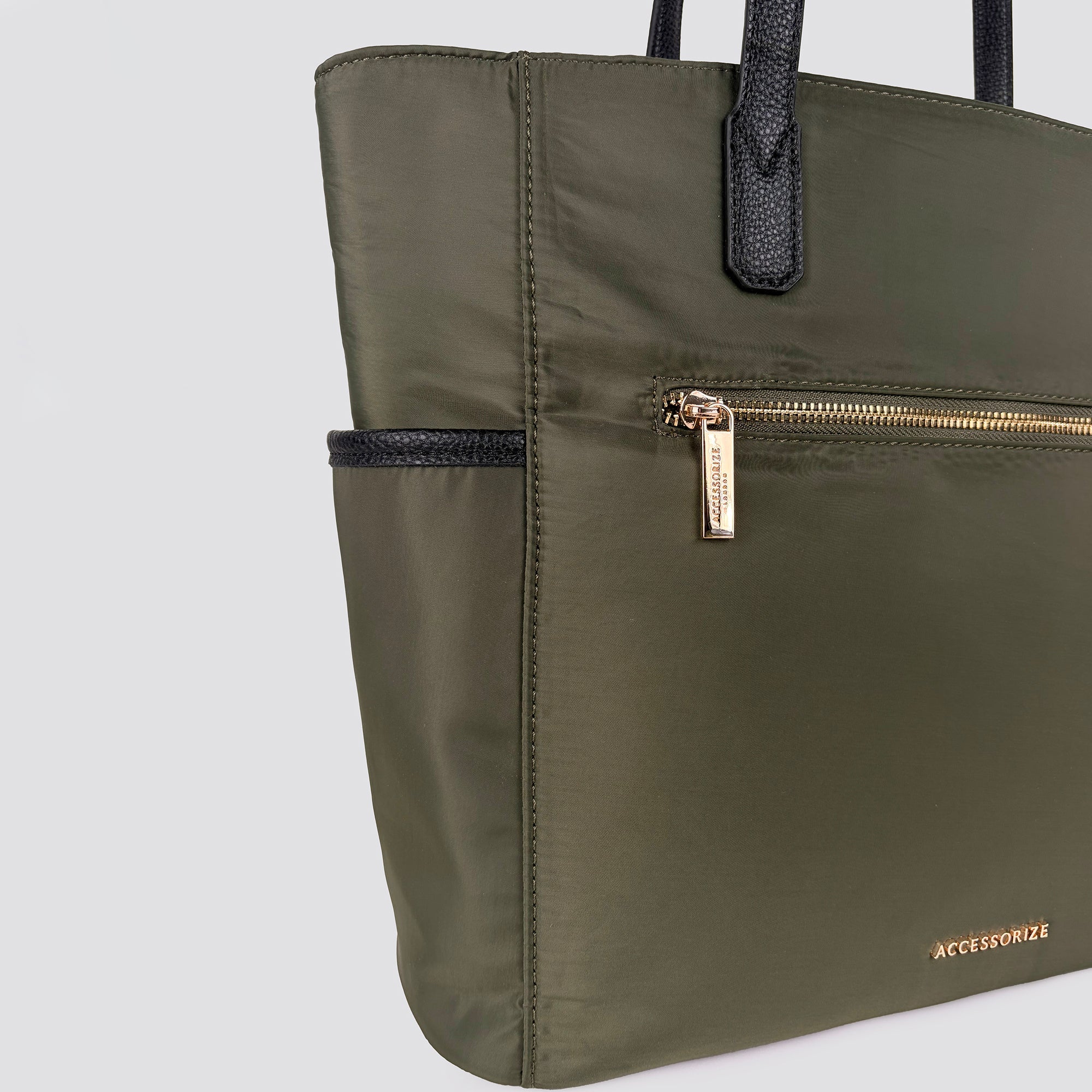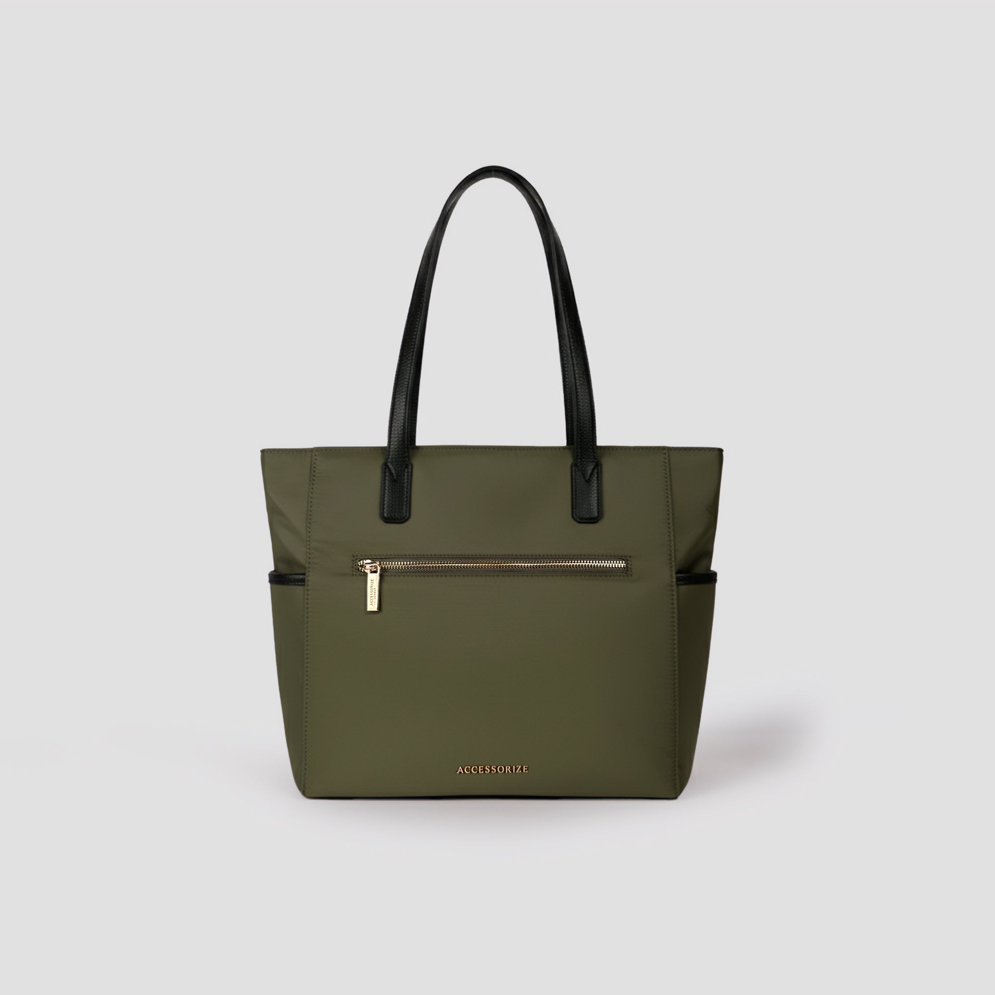 Introducing the ultimate everyday tote for the woman who values organisation and style. This structured tote bag in versatile Olive Green is crafted from lightweight, durable nylon, making it easy to carry all day. The design is highly functional, featuring a quick-access front zip pocket and two essential side slip pockets, perfect for keeping a water bottle, umbrella, or quick-grab items close at hand. Elegant black faux leather handles and gold-tone hardware add a polished finish, ensuring this multi-pocket tote is suitable for everything from your work commute to weekend adventures.
