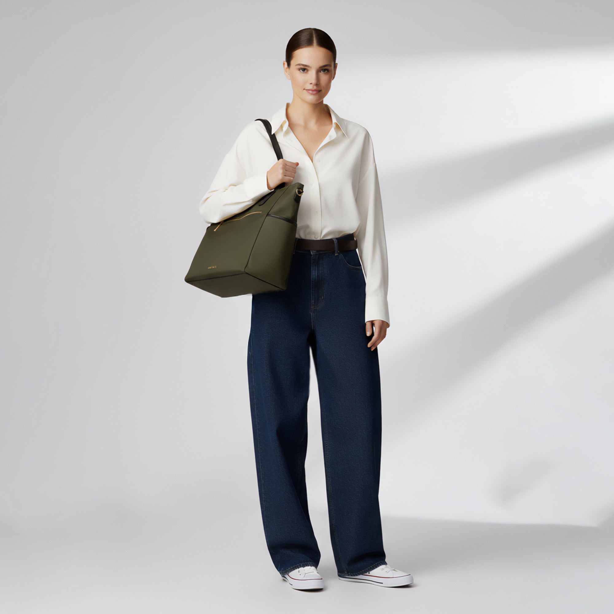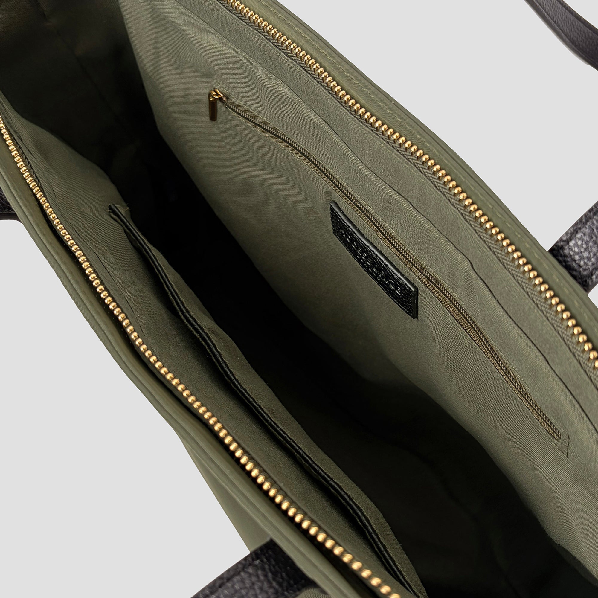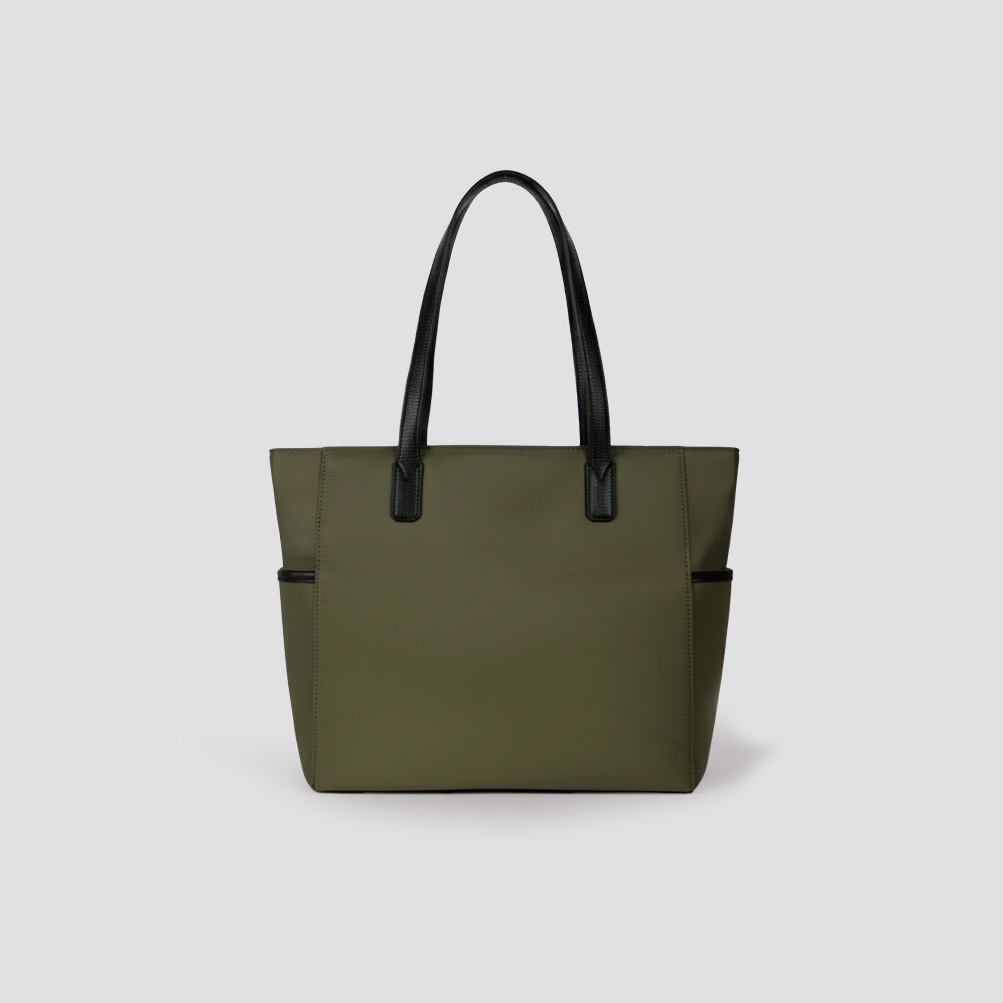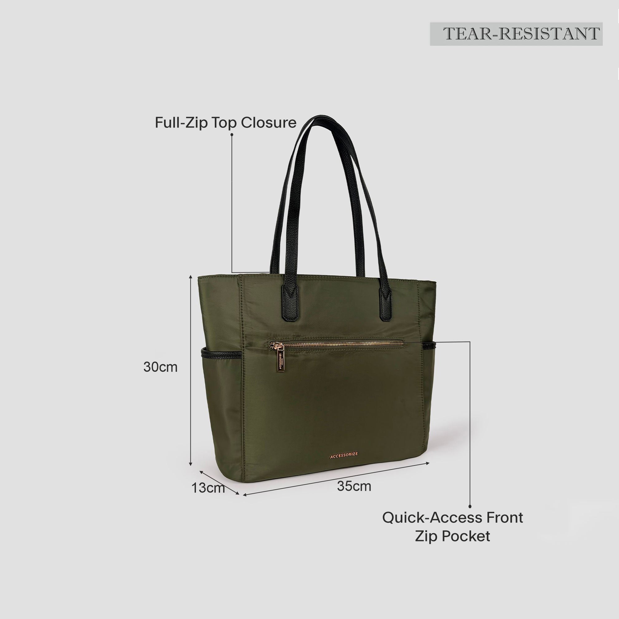 Introducing the ultimate everyday tote for the woman who values organisation and style. This structured tote bag in versatile Olive Green is crafted from lightweight, durable nylon, making it easy to carry all day. The design is highly functional, featuring a quick-access front zip pocket and two essential side slip pockets, perfect for keeping a water bottle, umbrella, or quick-grab items close at hand. Elegant black faux leather handles and gold-tone hardware add a polished finish, ensuring this multi-pocket tote is suitable for everything from your work commute to weekend adventures.