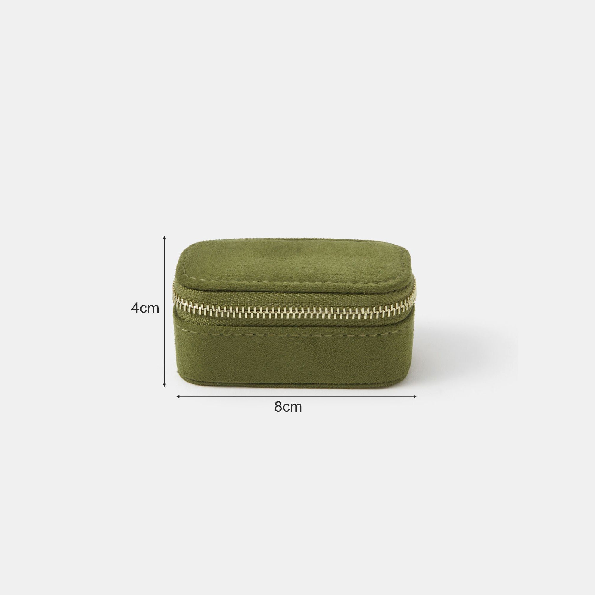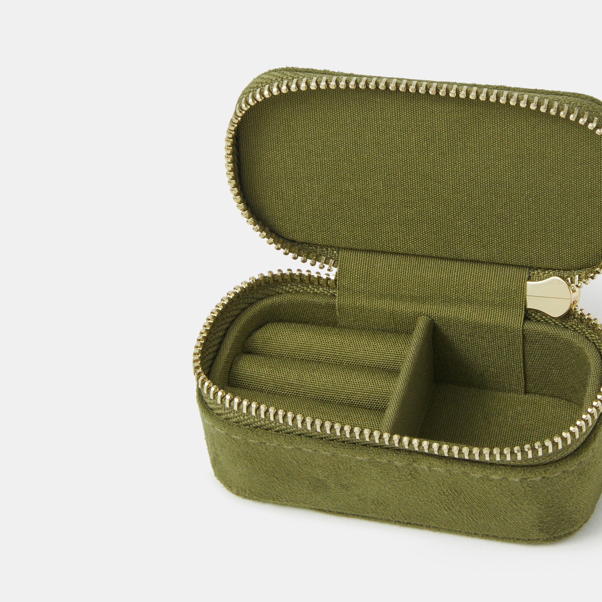 The perfect storer for all your fave jewels when you go on weekends away, this baby jewellery box is designed with a zip top lid in a super-soft olive green finish. Unzip to find three sponge cushions to insert rings or studs and a side compartment for bracelets and necklaces.