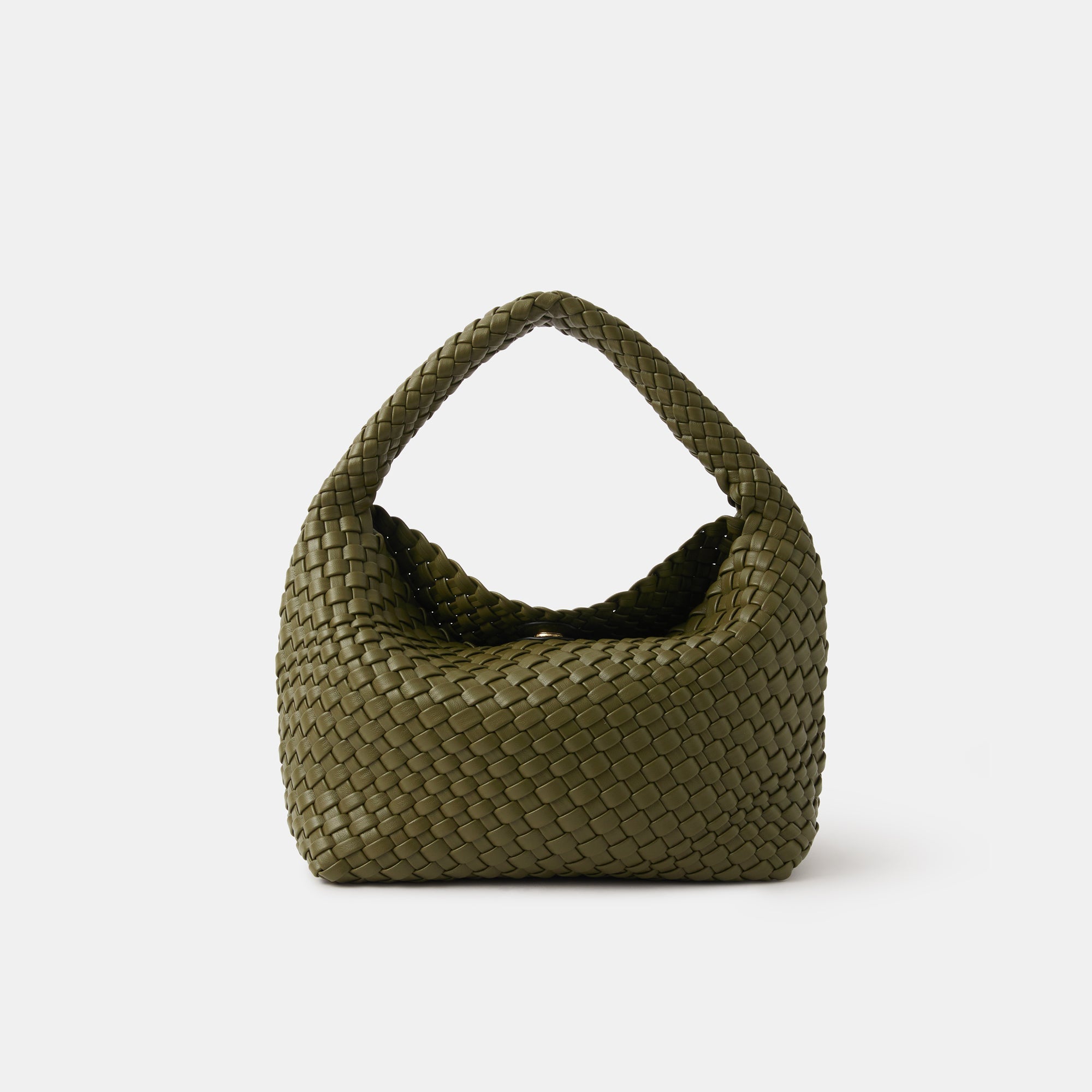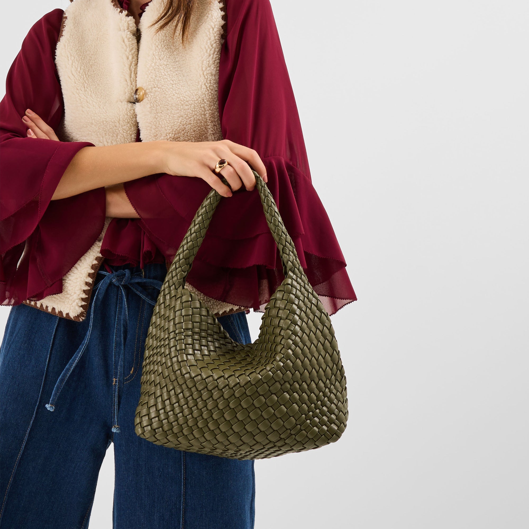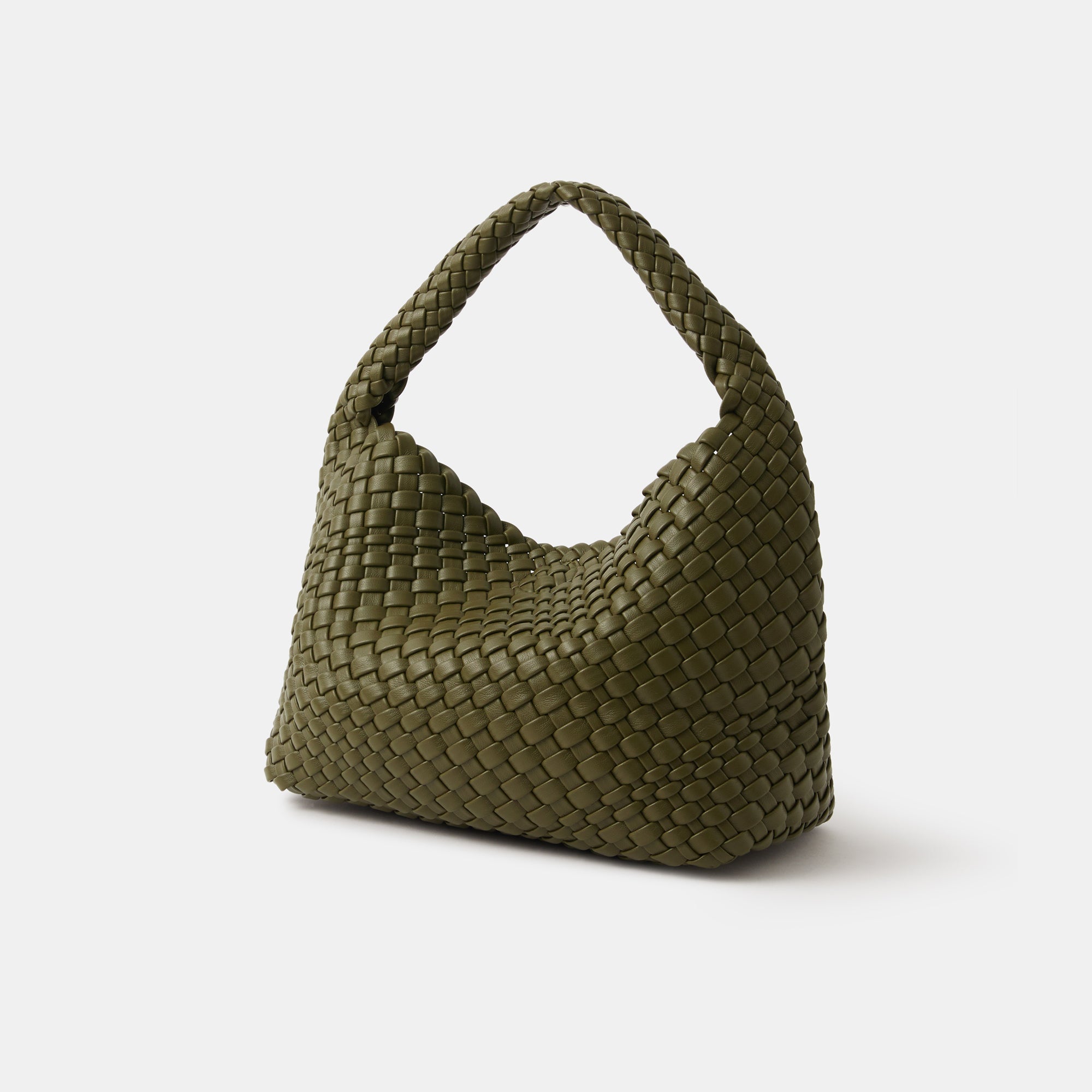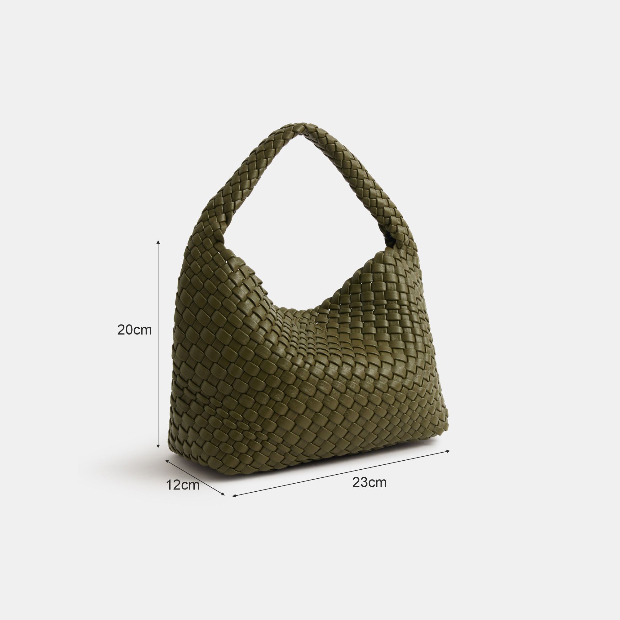 Protect the goods with this woven wonder. Made with entwined faux leather in a luxe olive colour, this bag is the ultimate 'fit finisher for your everyday. Features a single shoulder strap and magnetic button fastening.