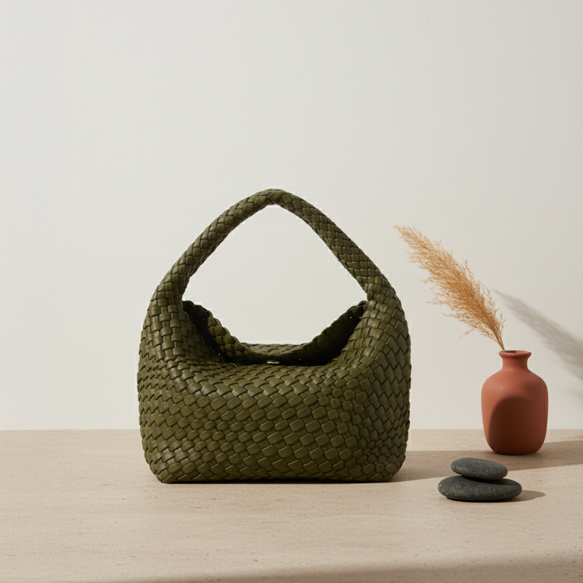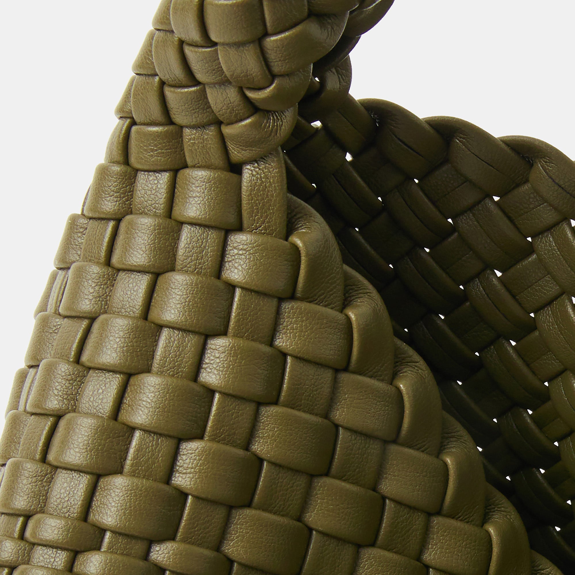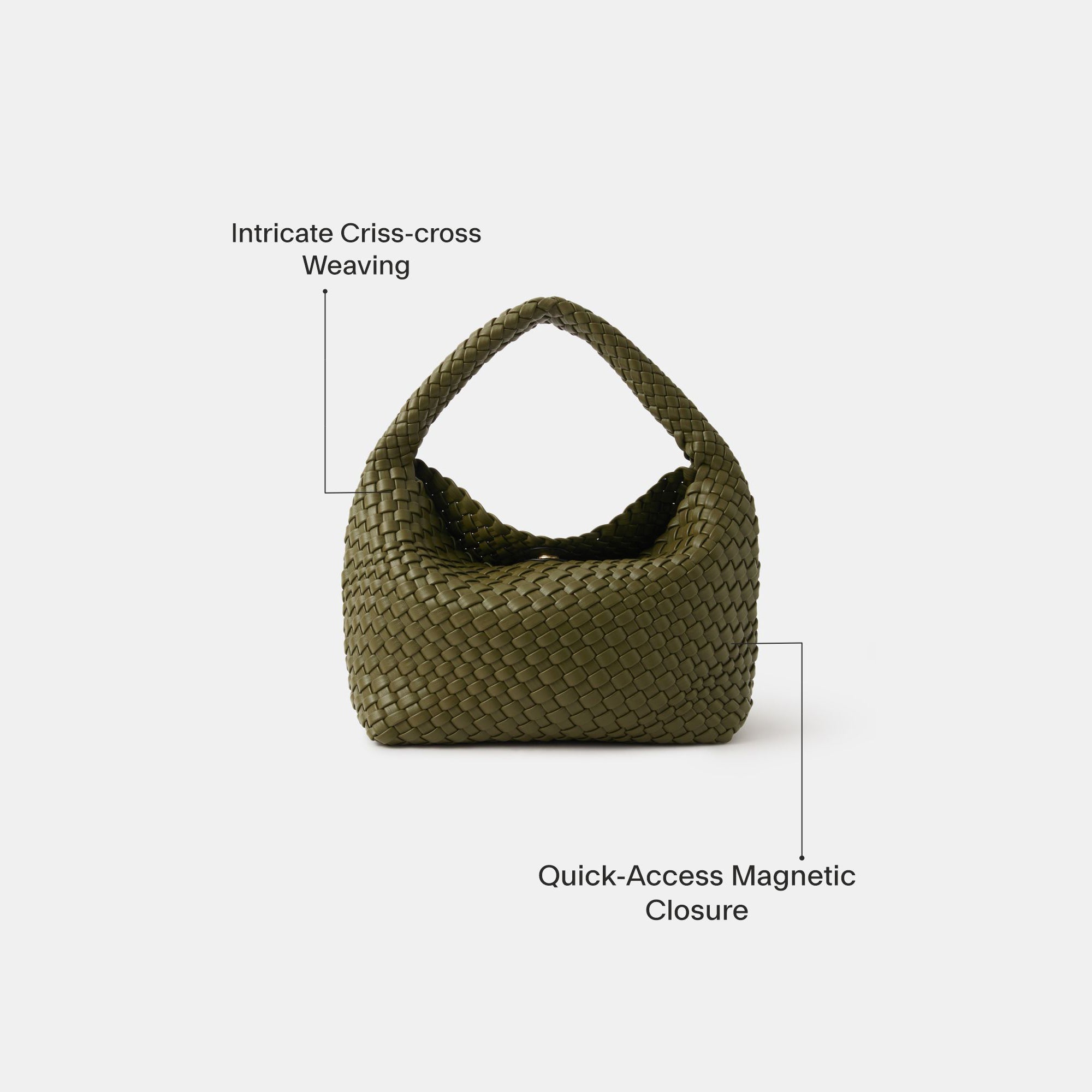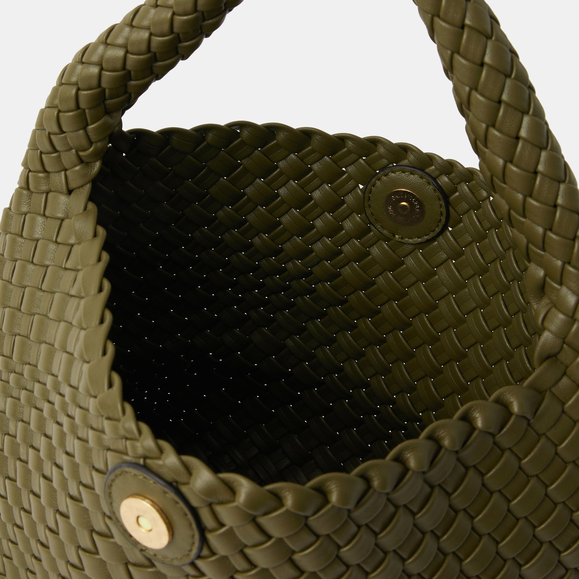 Protect the goods with this woven wonder. Made with entwined faux leather in a luxe olive colour, this bag is the ultimate 'fit finisher for your everyday. Features a single shoulder strap and magnetic button fastening.