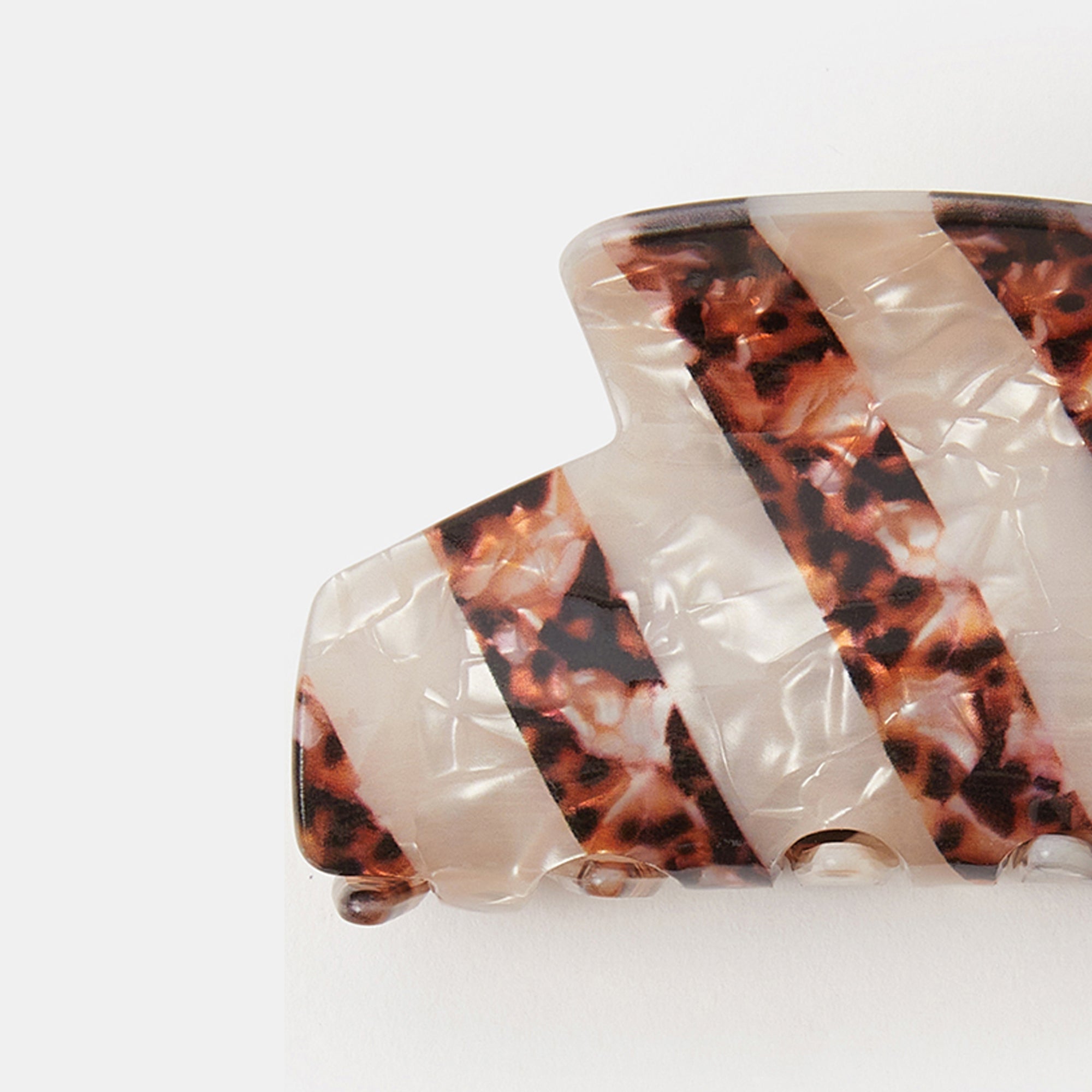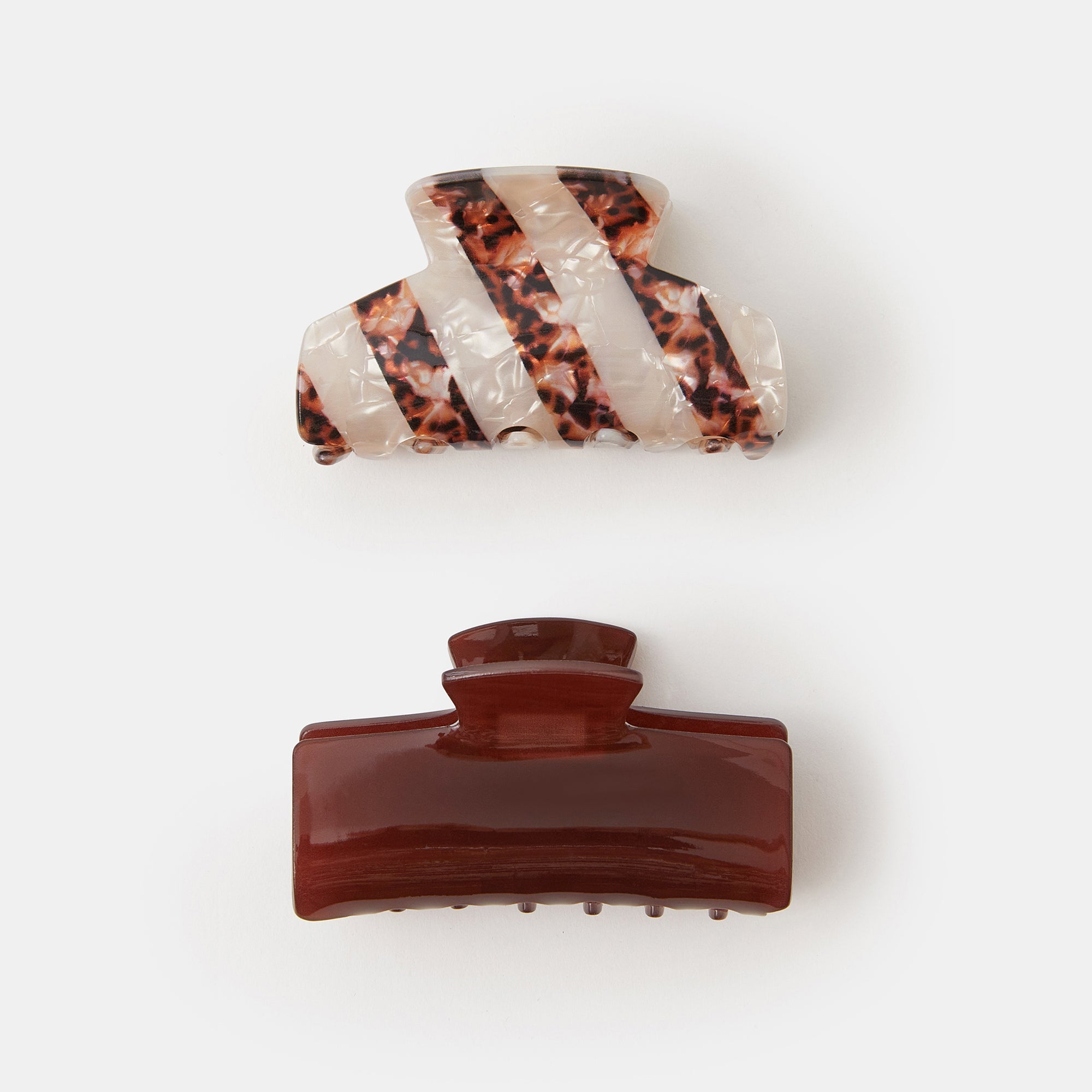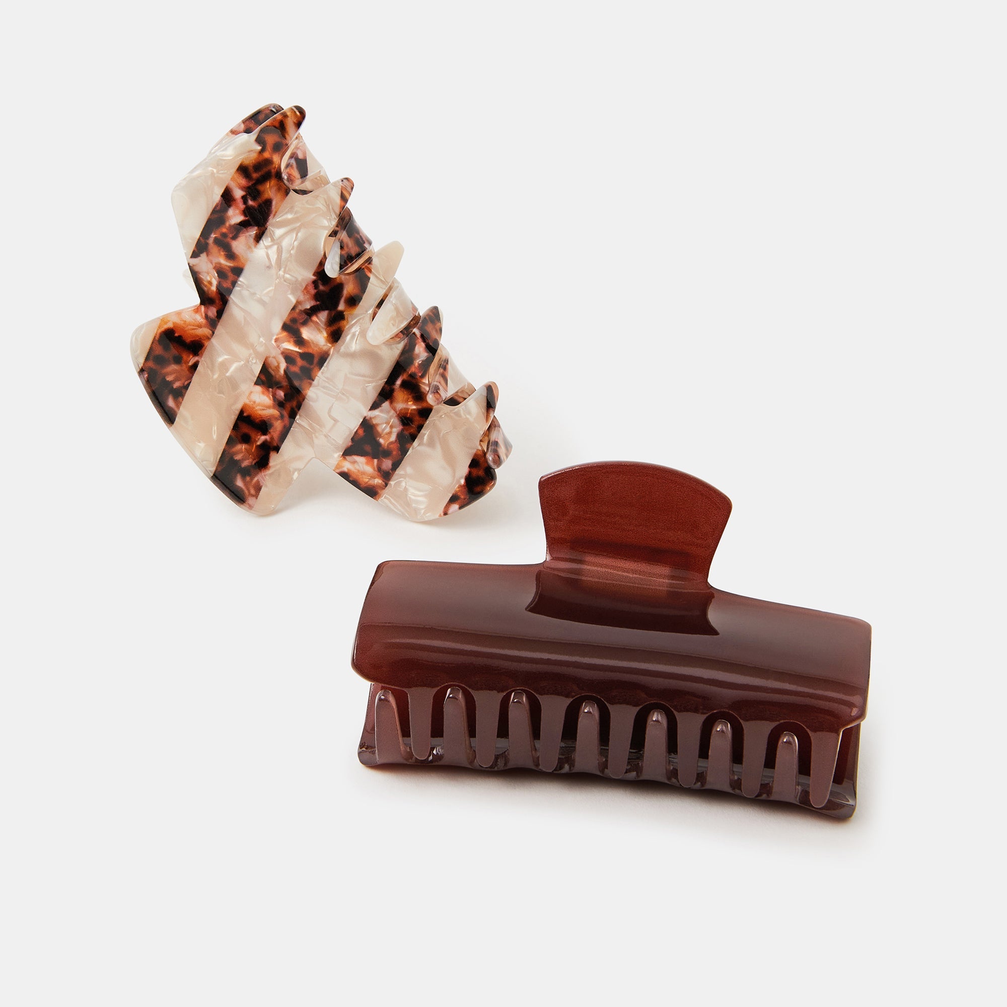 If you're a twist-and-go kinda gal, these are for you. A necessity for quick and easy hairstyles, this claw clip duo includes one plain style and one patterned with stripes in tort and marbled finishes. Two included.