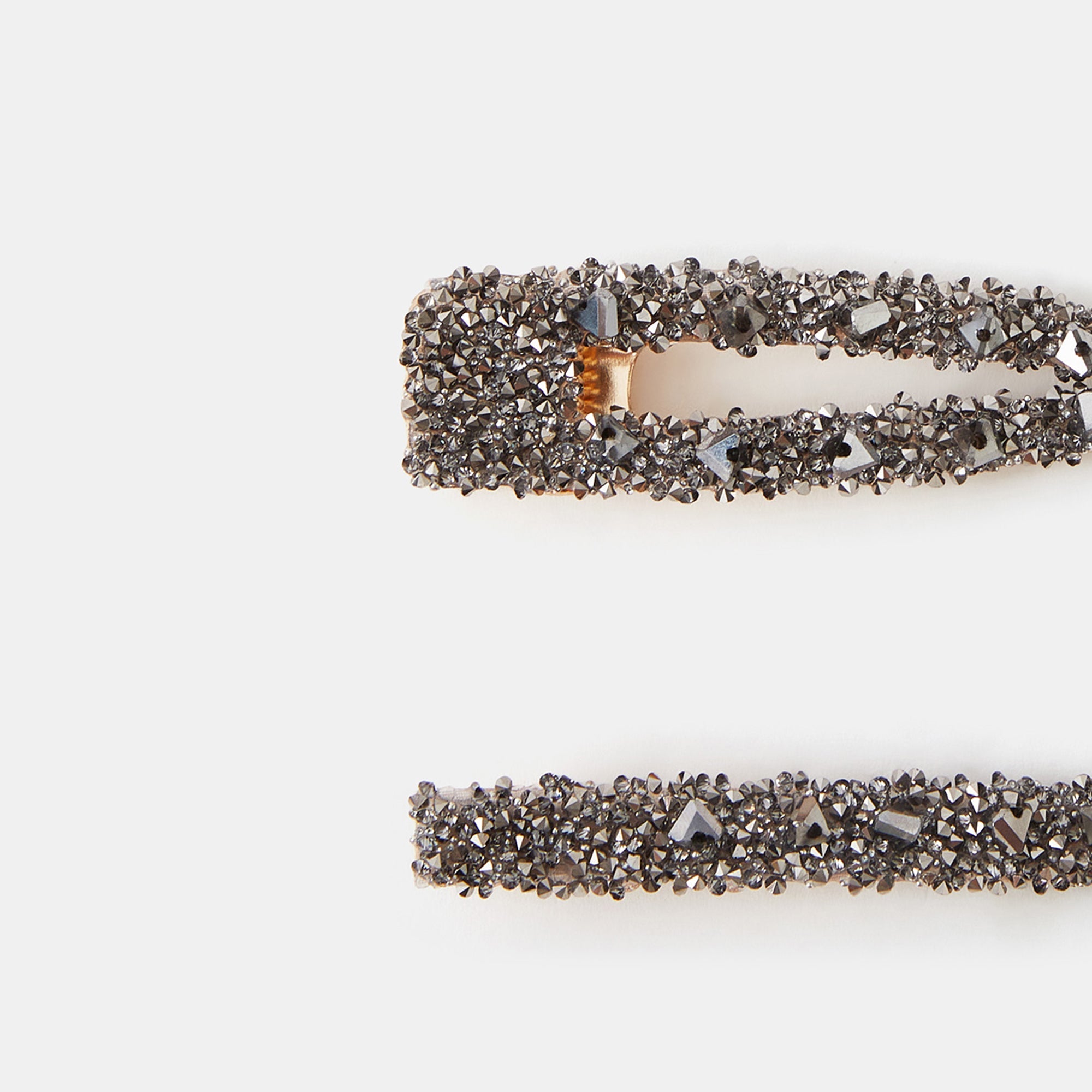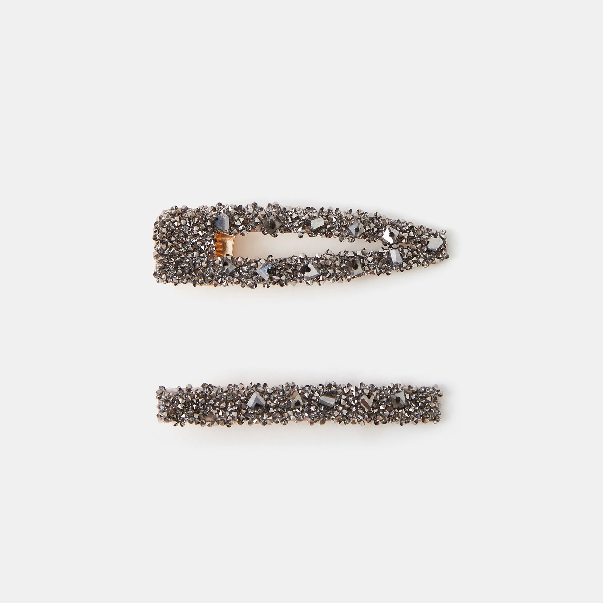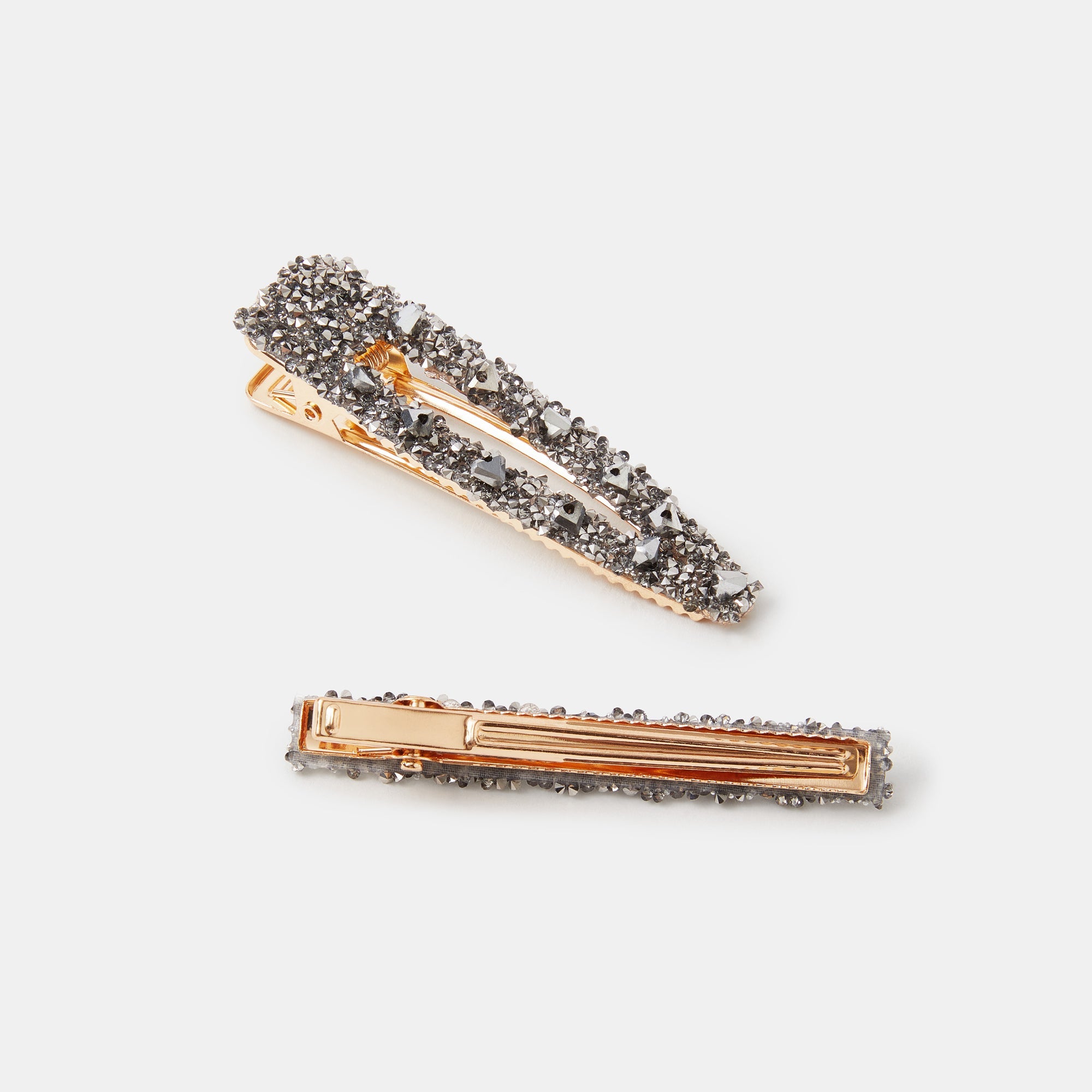 Lights, camera, action! Add a touch of Hollywood to your mid-week hairstyle with these hair clips. Dipped with sparkly gemstones, this set features a barrette and snap clip. Two included.